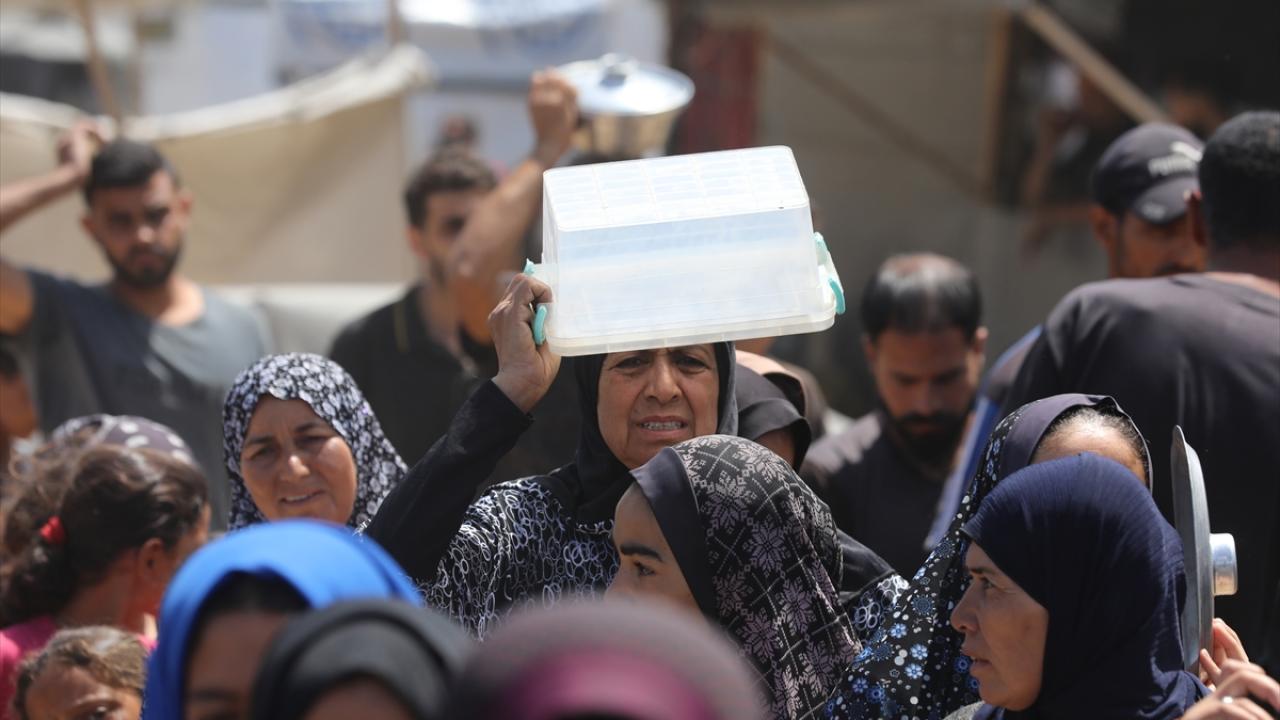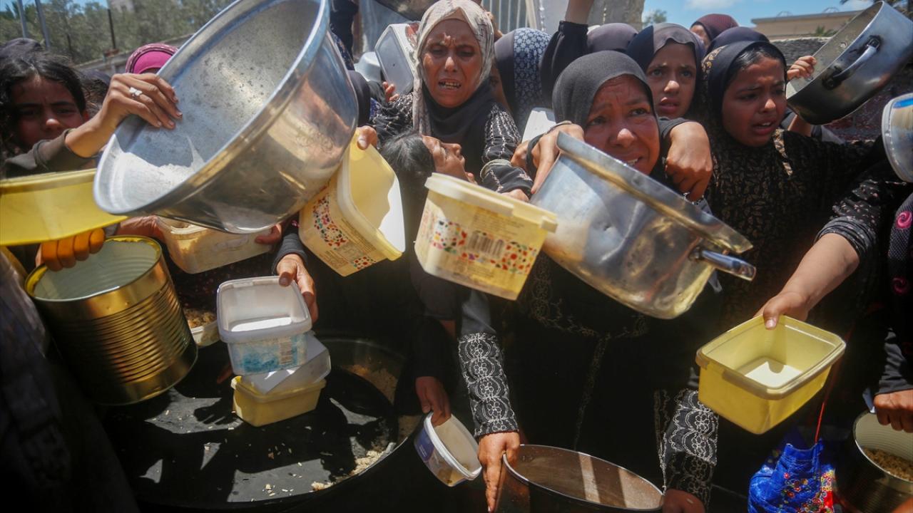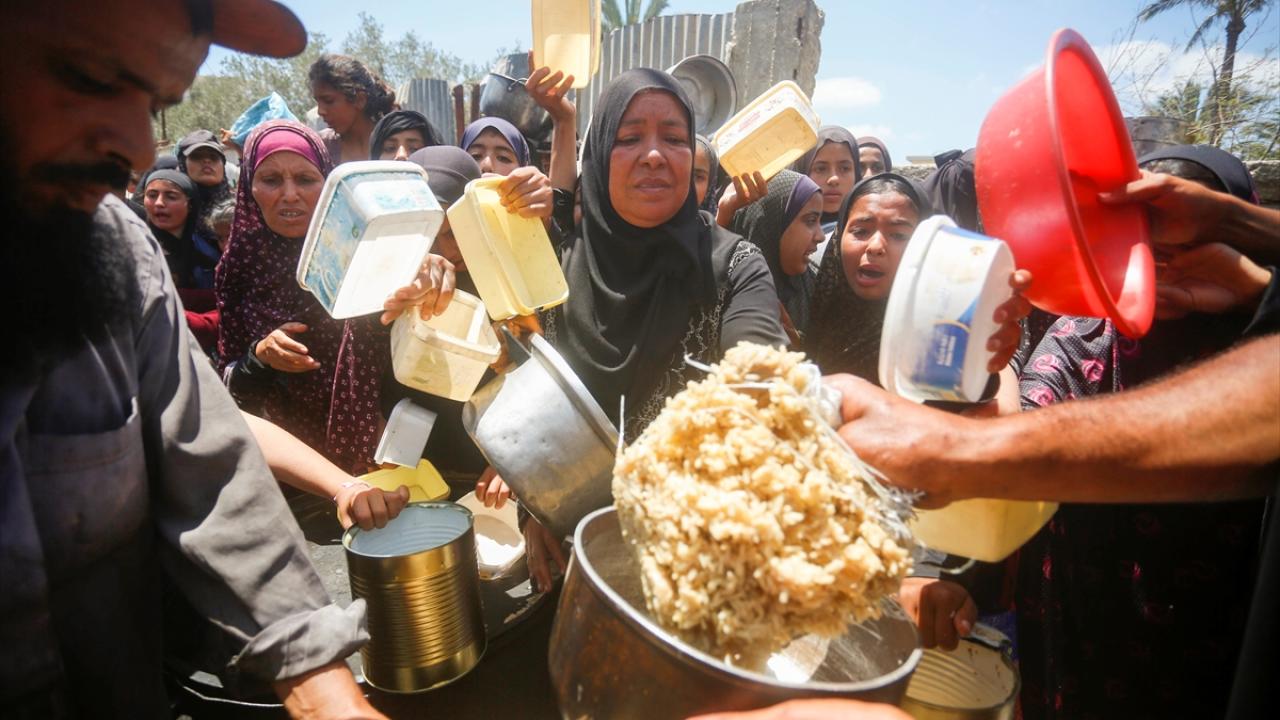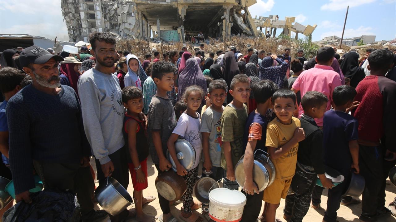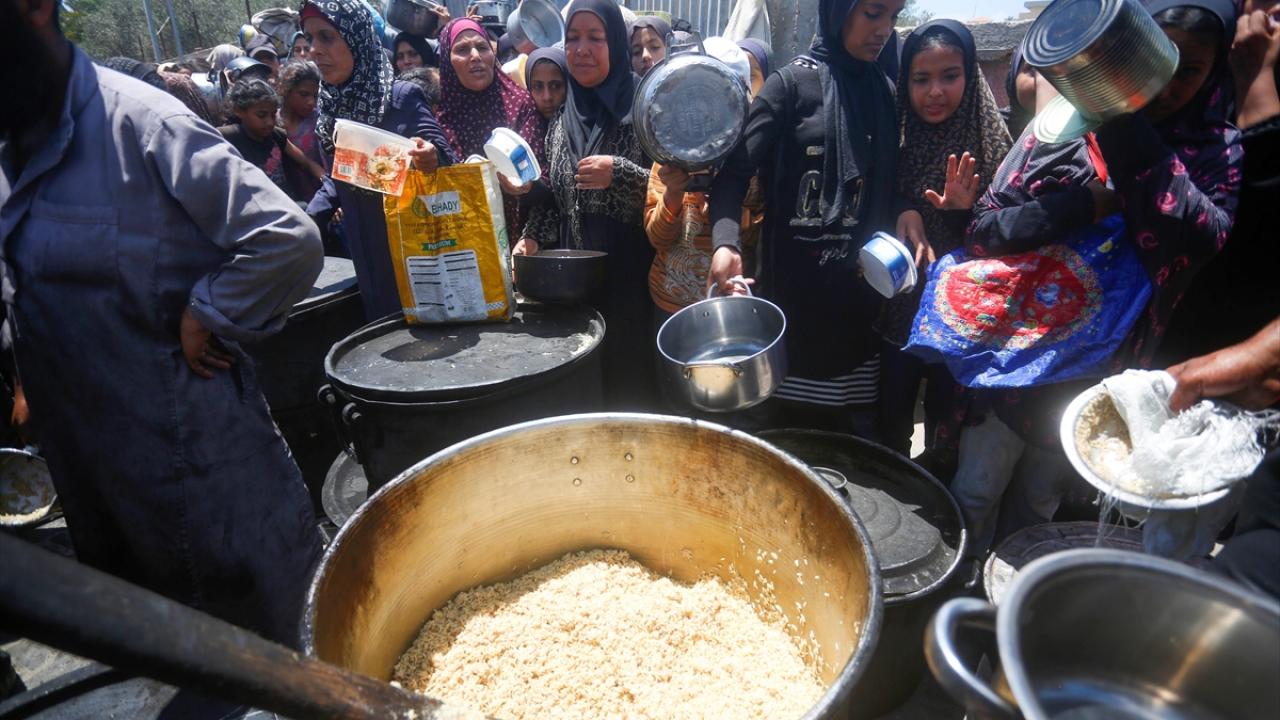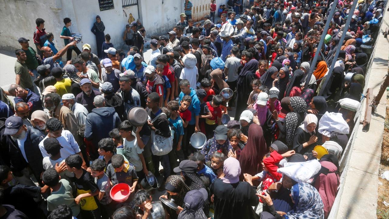 İsrail’in 600 gündür süren ablukası ve saldırıları nedeniyle Gazze Şeridi'nde derinleşen gıda krizinden etkilenen Filistinliler, yardım kuruluşlarının dağıttığı sıcak yemeklerden alabilmek için ellerinde kaplarla uzun kuyruklar oluşturuyor.