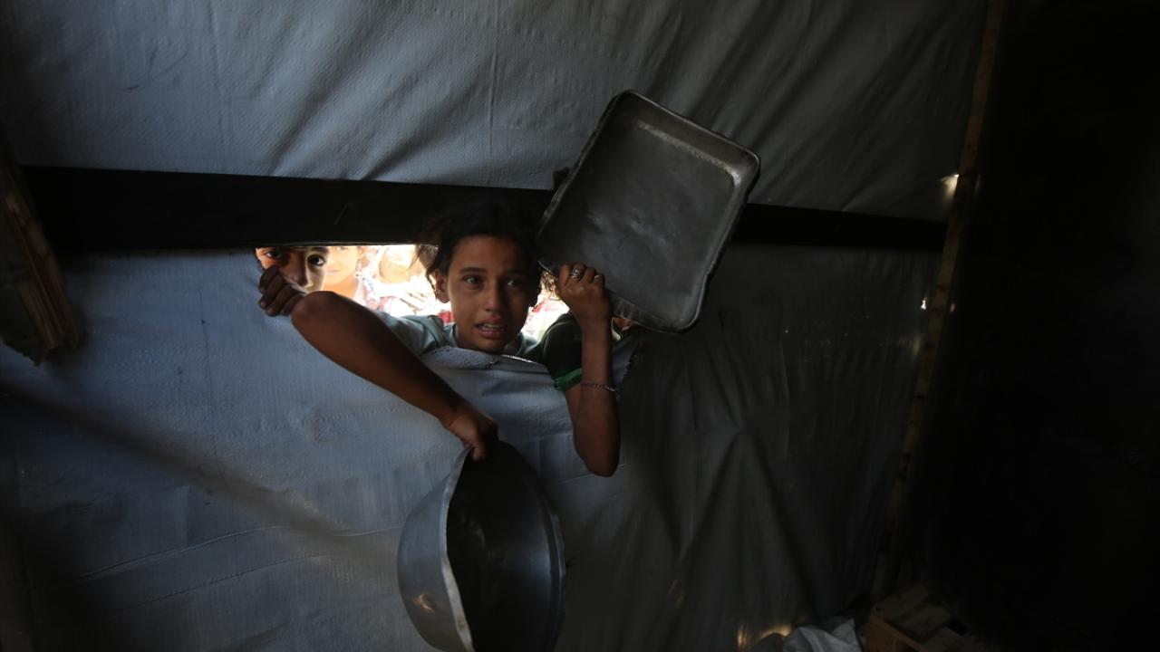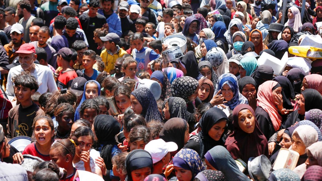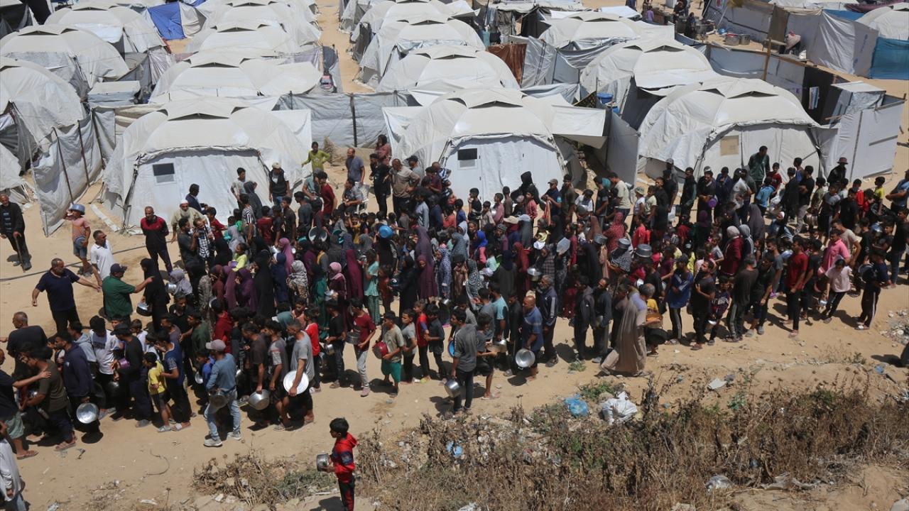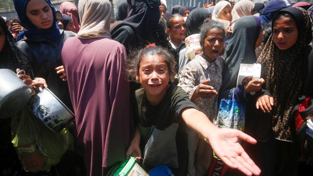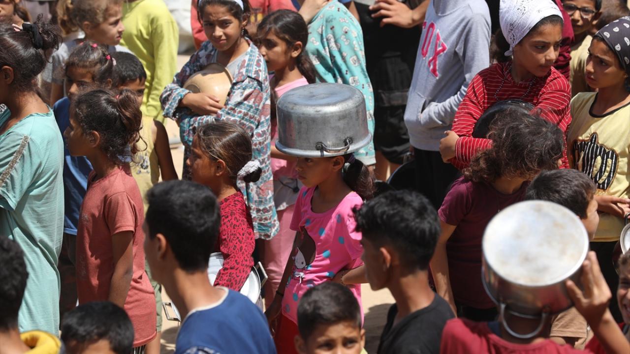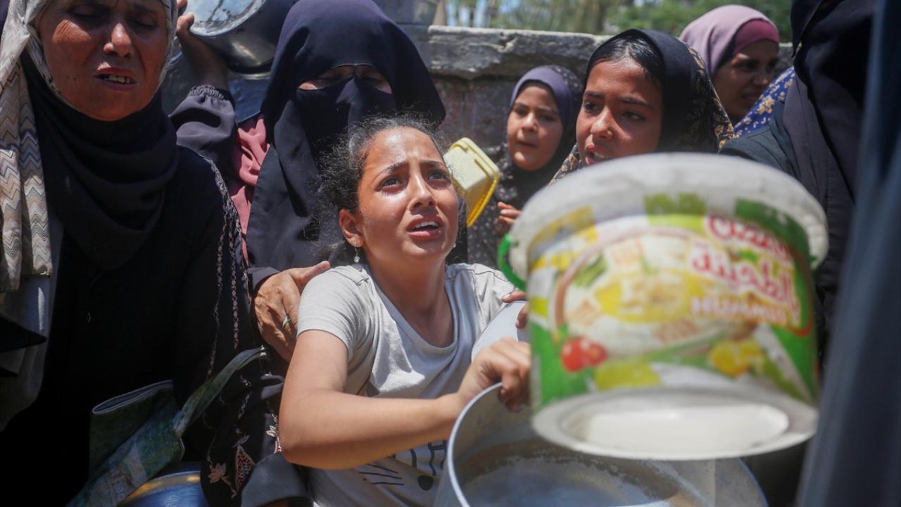 İsrail’in 600 gündür süren ablukası ve saldırıları nedeniyle Gazze Şeridi'nde derinleşen gıda krizinden etkilenen Filistinliler, yardım kuruluşlarının dağıttığı sıcak yemeklerden alabilmek için ellerinde kaplarla uzun kuyruklar oluşturuyor.