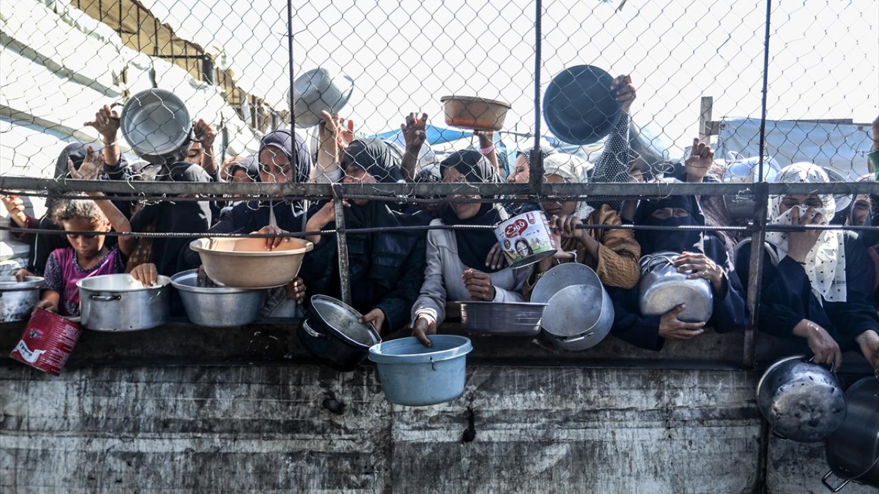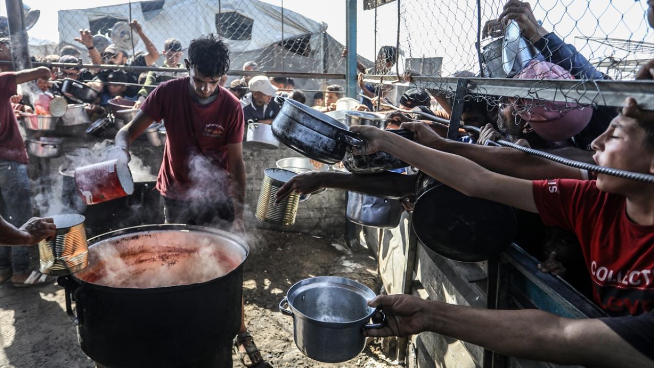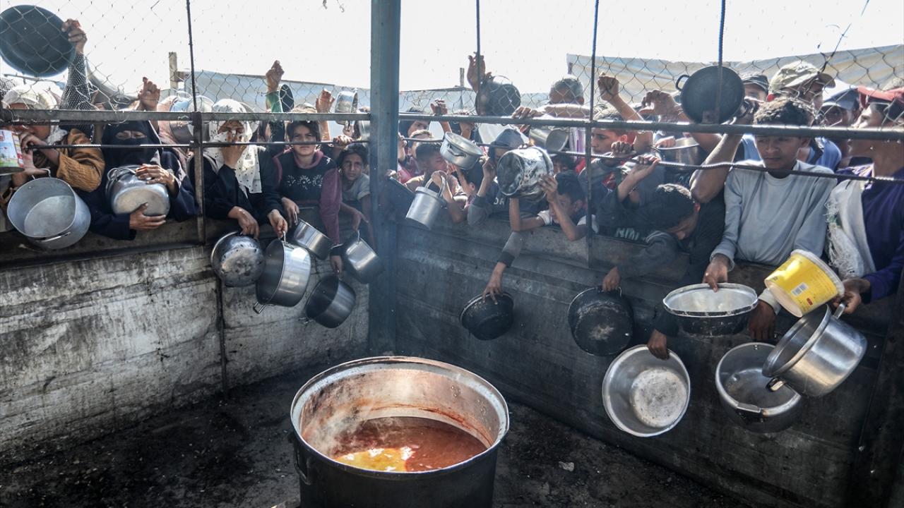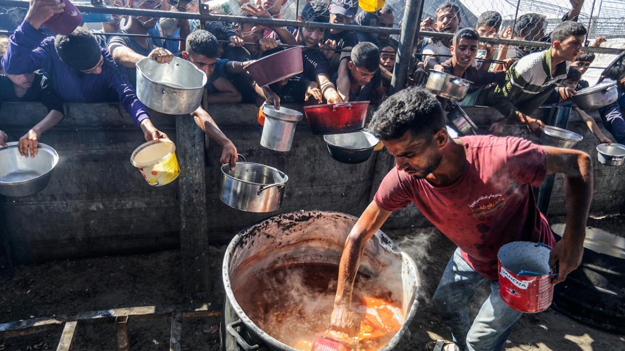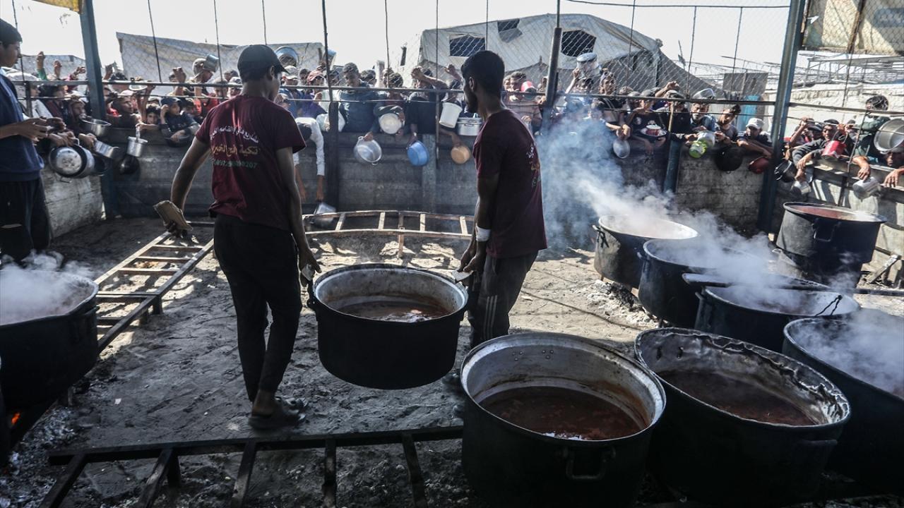 İsrail'in ablukası ve saldırıları nedeniyle Gazze Şeridi'nde derinleşen gıda krizinden etkilenen Filistinliler, yardım kuruluşları tarafından dağıtılan sıcak yemeklerden alabilmek için ellerinde kaplarla uzun kuyruklar oluşturuyor.