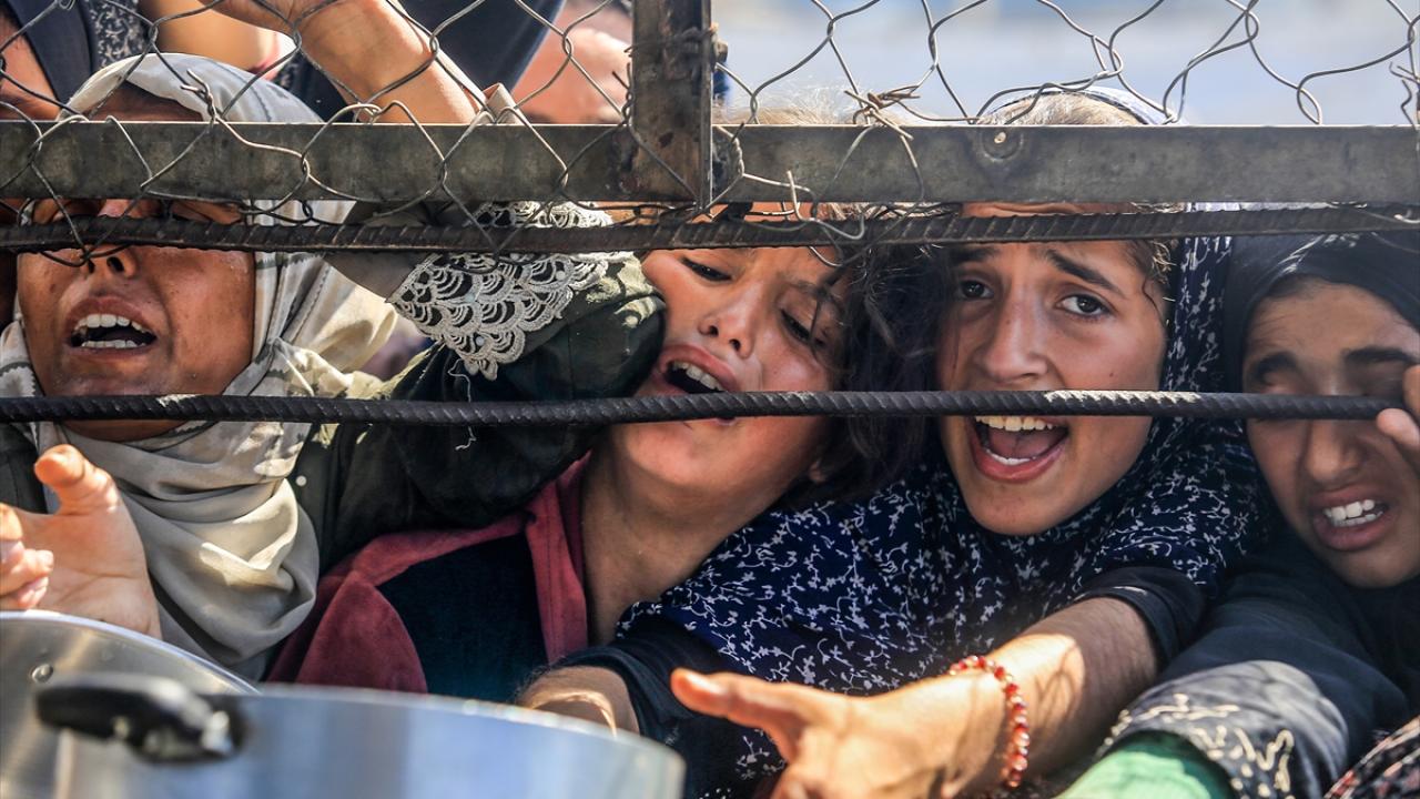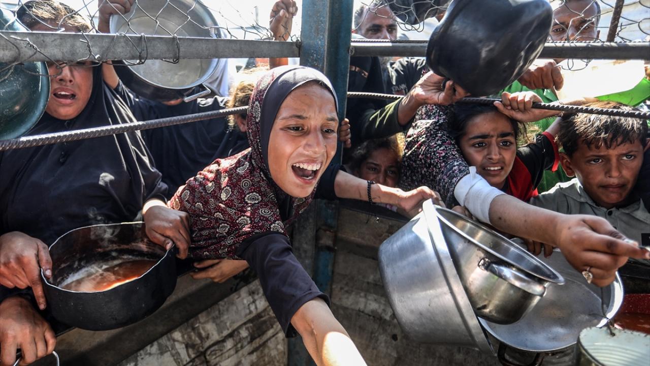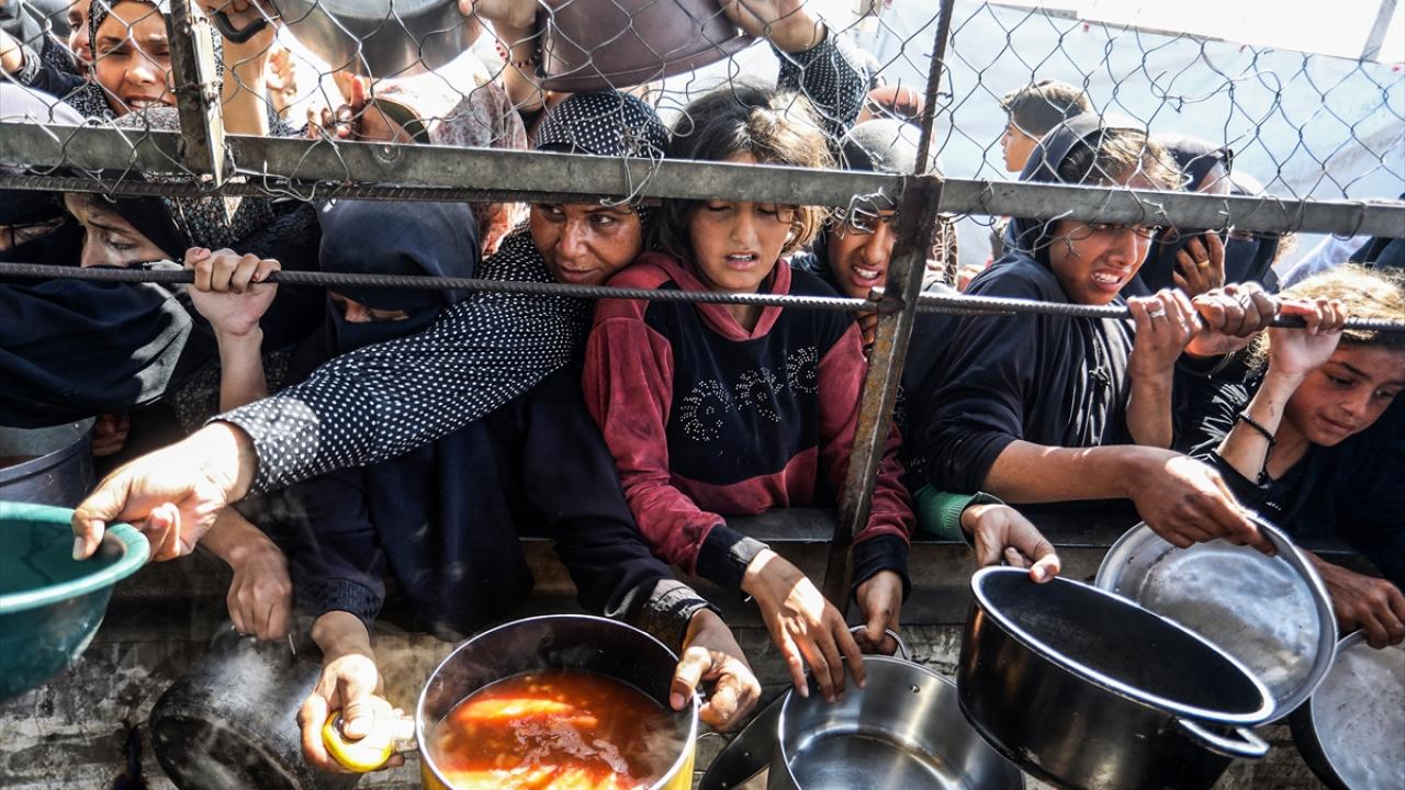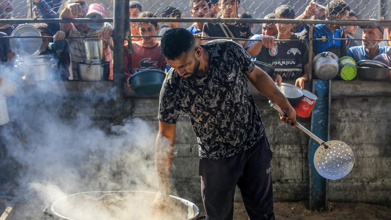 İsrail'in ablukası ve saldırıları nedeniyle Gazze Şeridi'nde derinleşen gıda krizinden etkilenen Filistinliler, yardım kuruluşları tarafından dağıtılan sıcak yemeklerden alabilmek için ellerinde kaplarla uzun kuyruklar oluşturuyor.