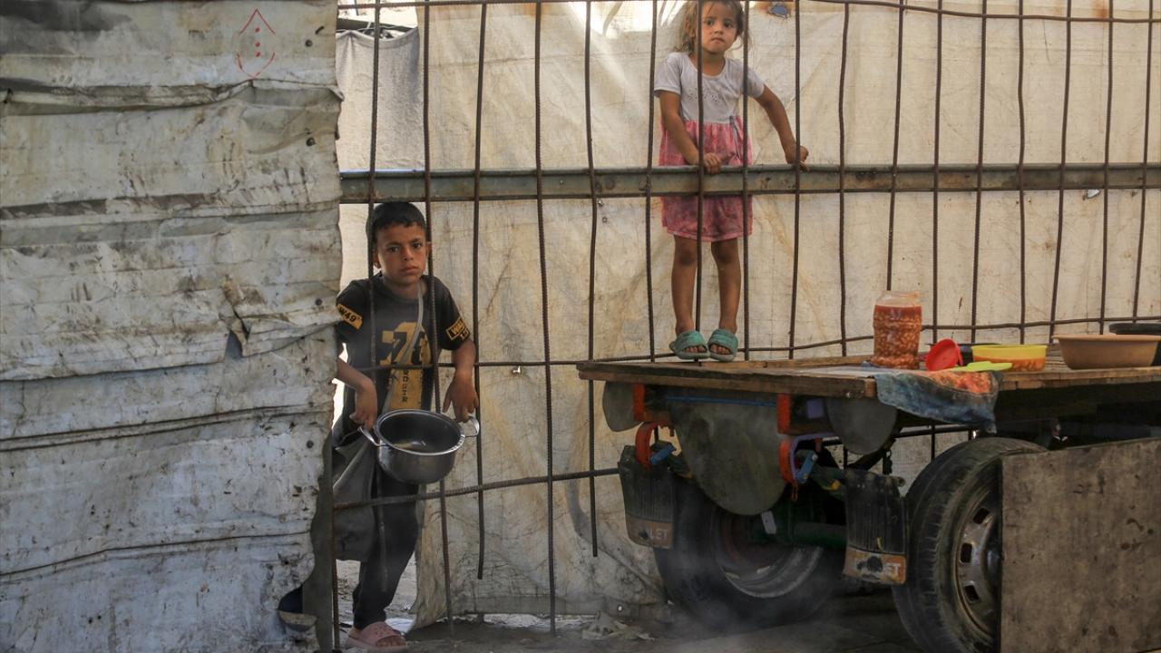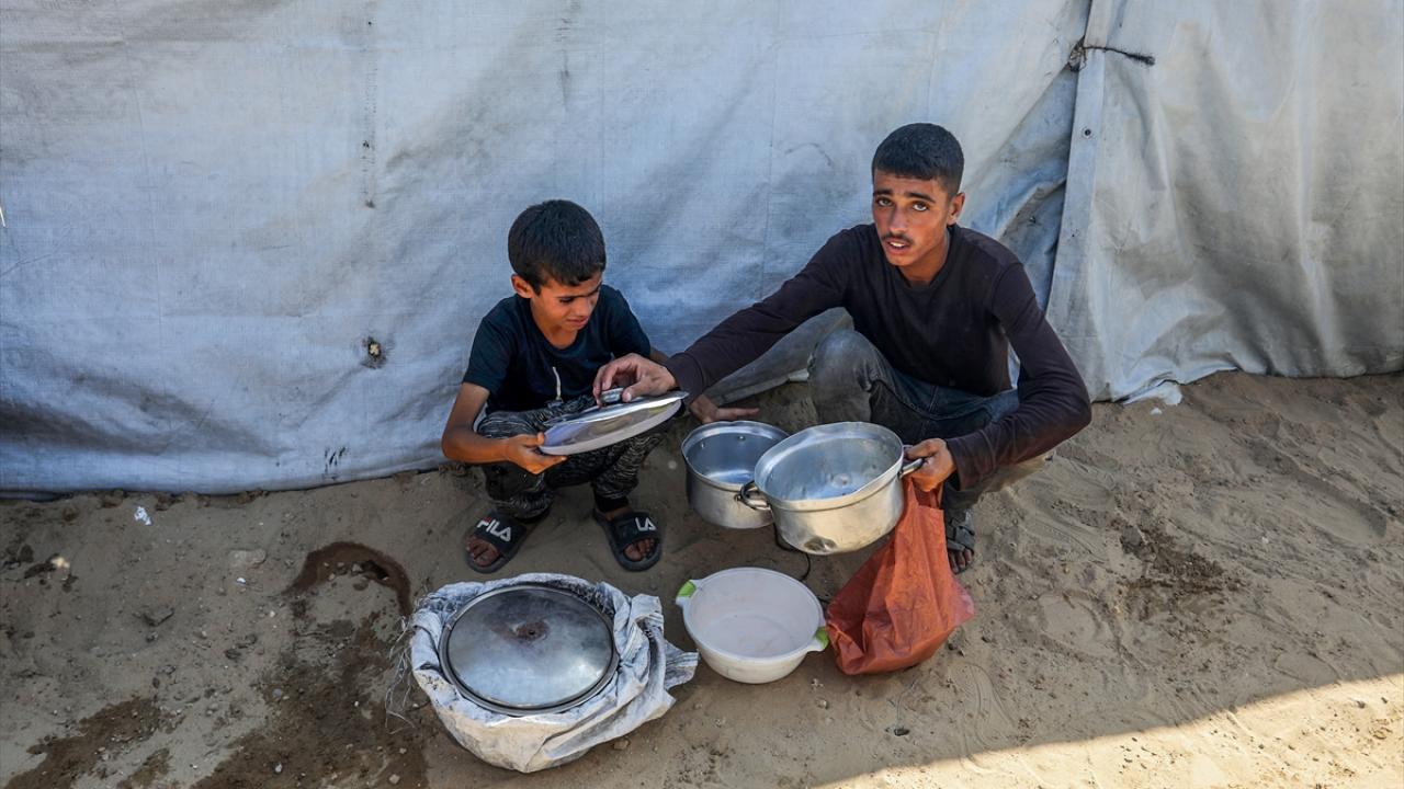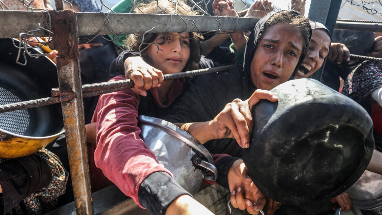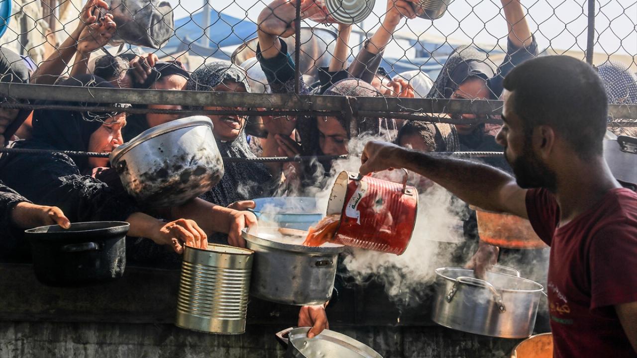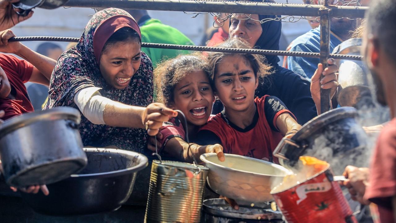 İsrail'in ablukası ve saldırıları nedeniyle Gazze Şeridi'nde derinleşen gıda krizinden etkilenen Filistinliler, yardım kuruluşları tarafından dağıtılan sıcak yemeklerden alabilmek için ellerinde kaplarla uzun kuyruklar oluşturuyor.