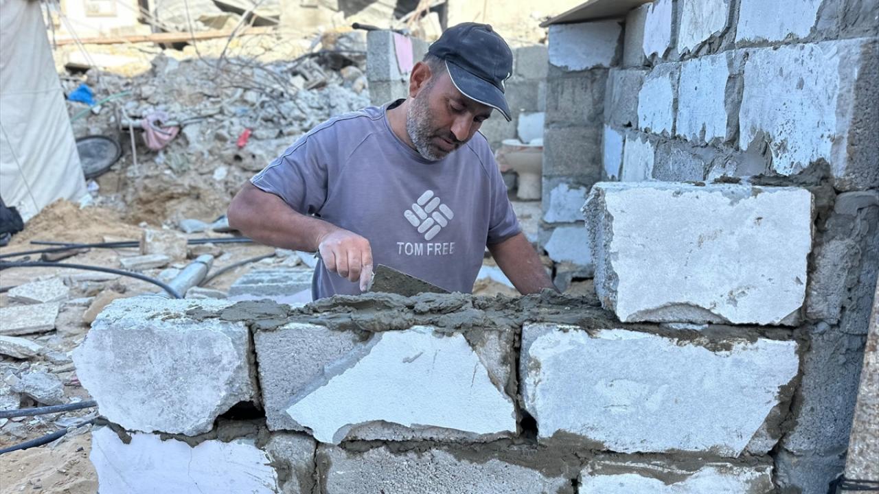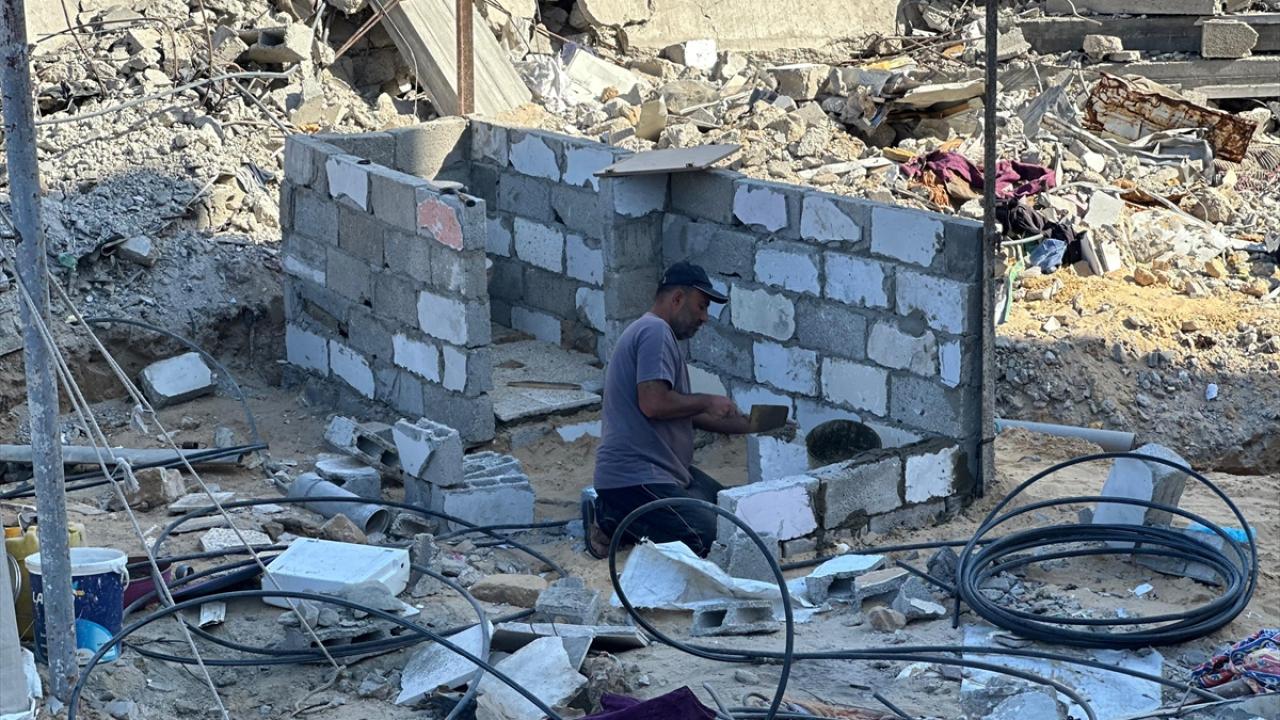 Filistinli Bobo, aile fertlerinin yardımıyla binanın moloz yığını içinde bulduğu kullanılabilir briketlerle çadırının yanına mutfak ve tuvalet yapıyor.