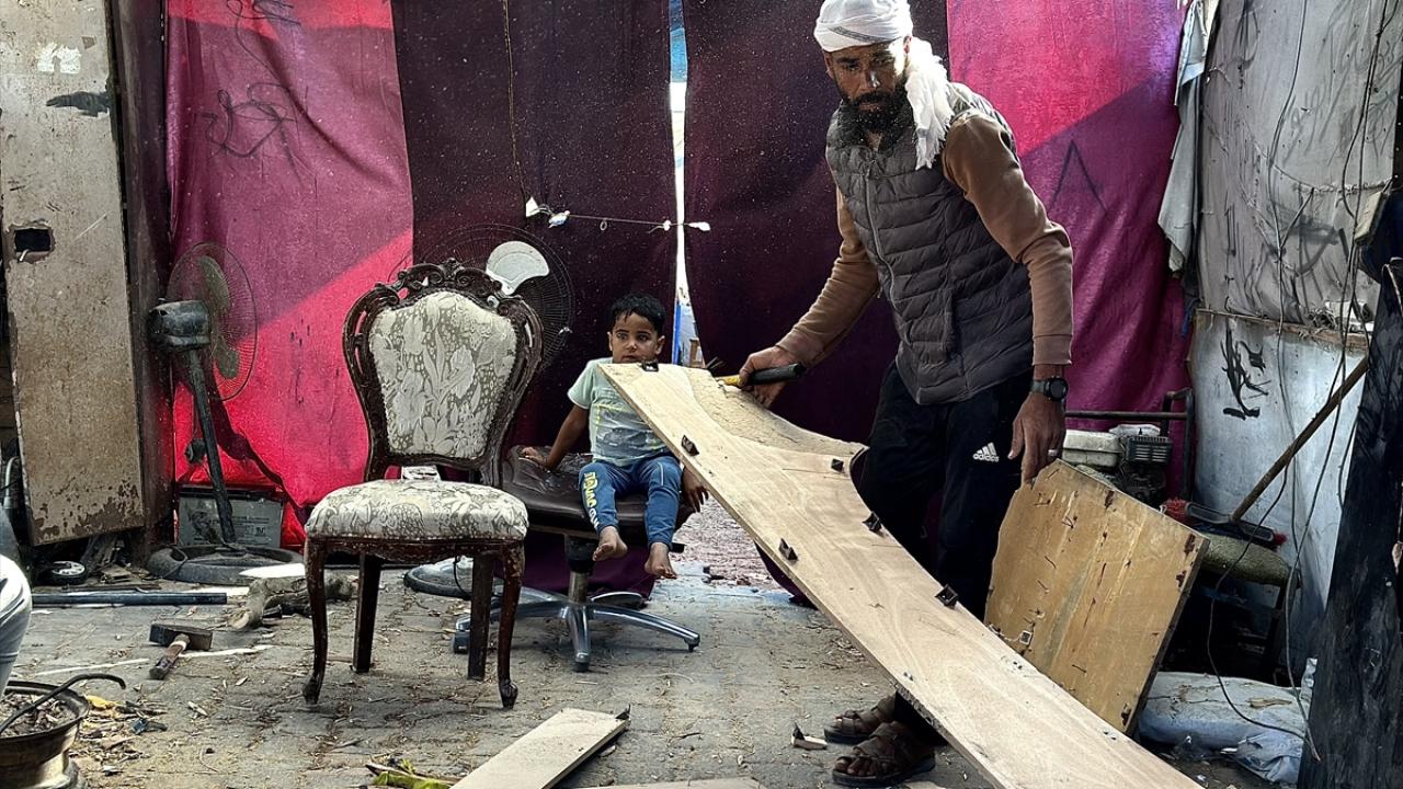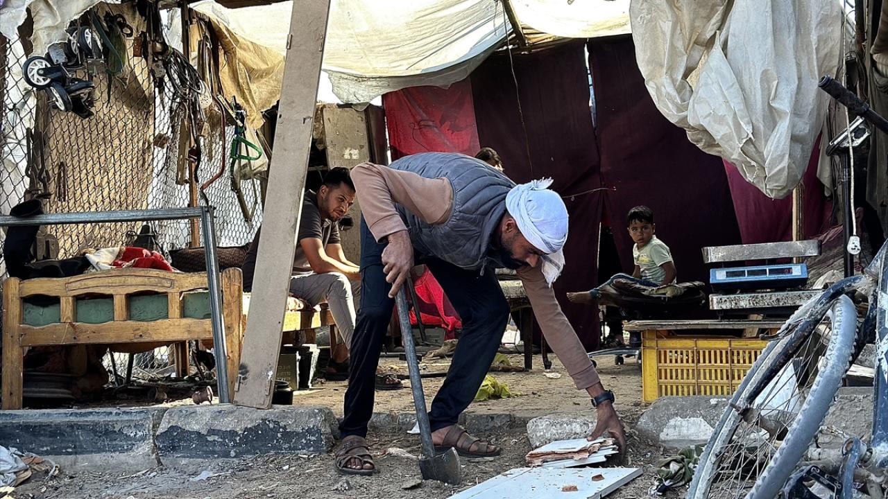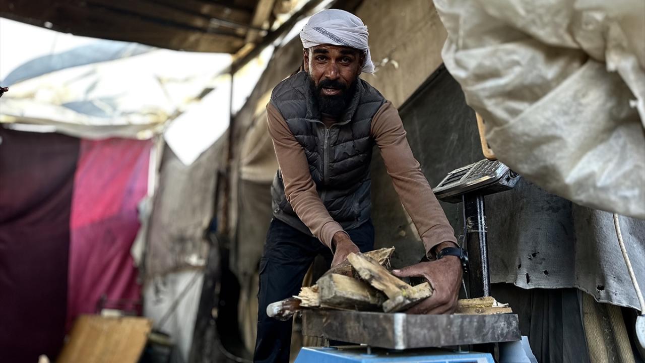 Filistinli Yusuf Cerbua ve çocukları, yerinden edilenlerin kaldığı Mevasi bölgesinde bir çadırda satın aldığı yada enkazlardan topladığı mobilya ve ağaç dallarını kırarak yakmaya hazır hale getiriyor.