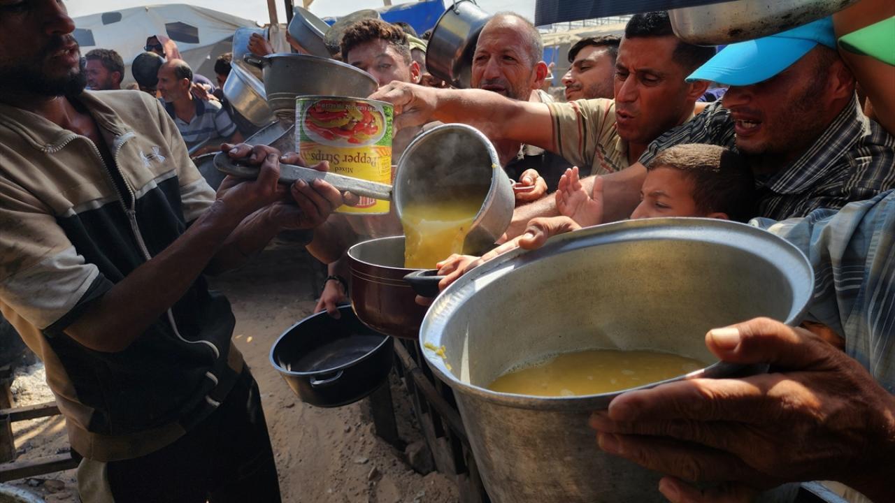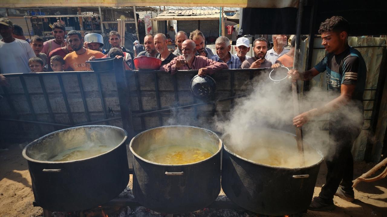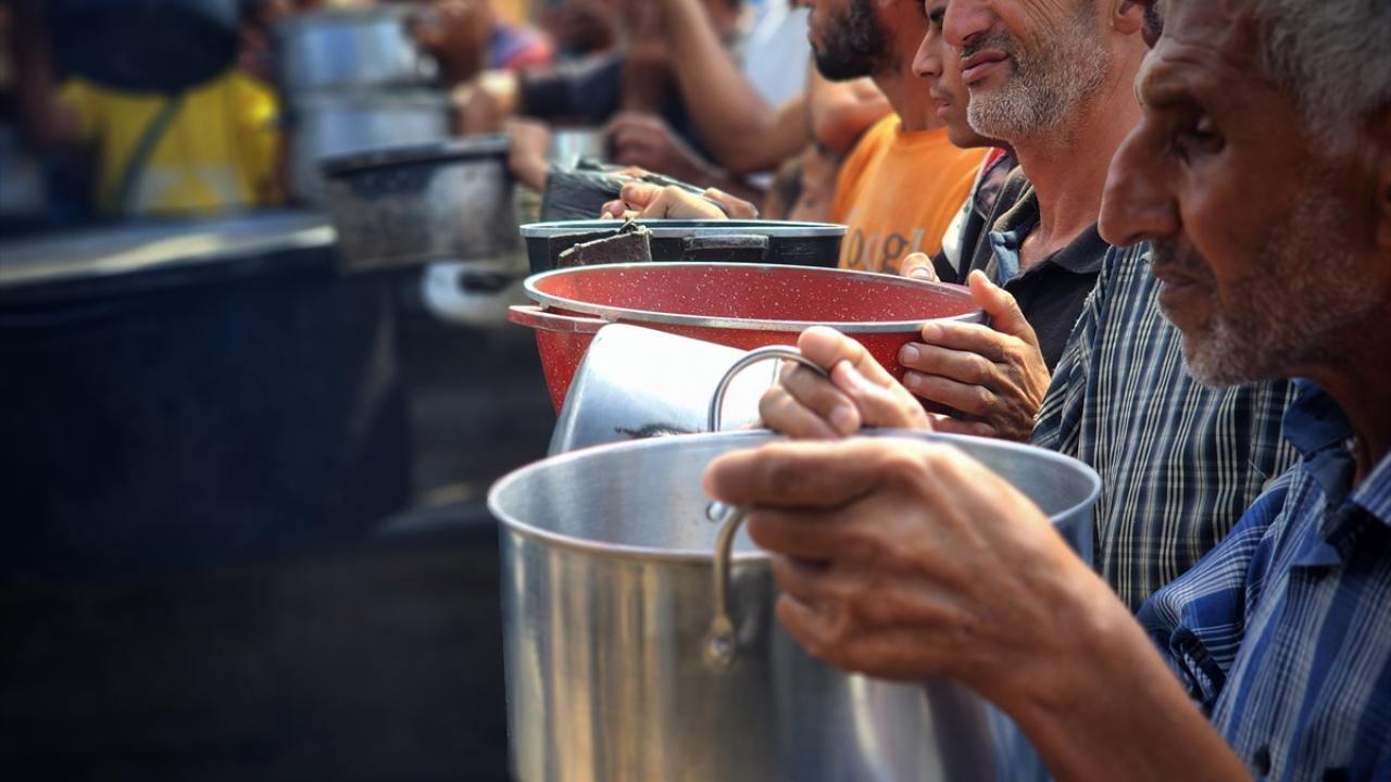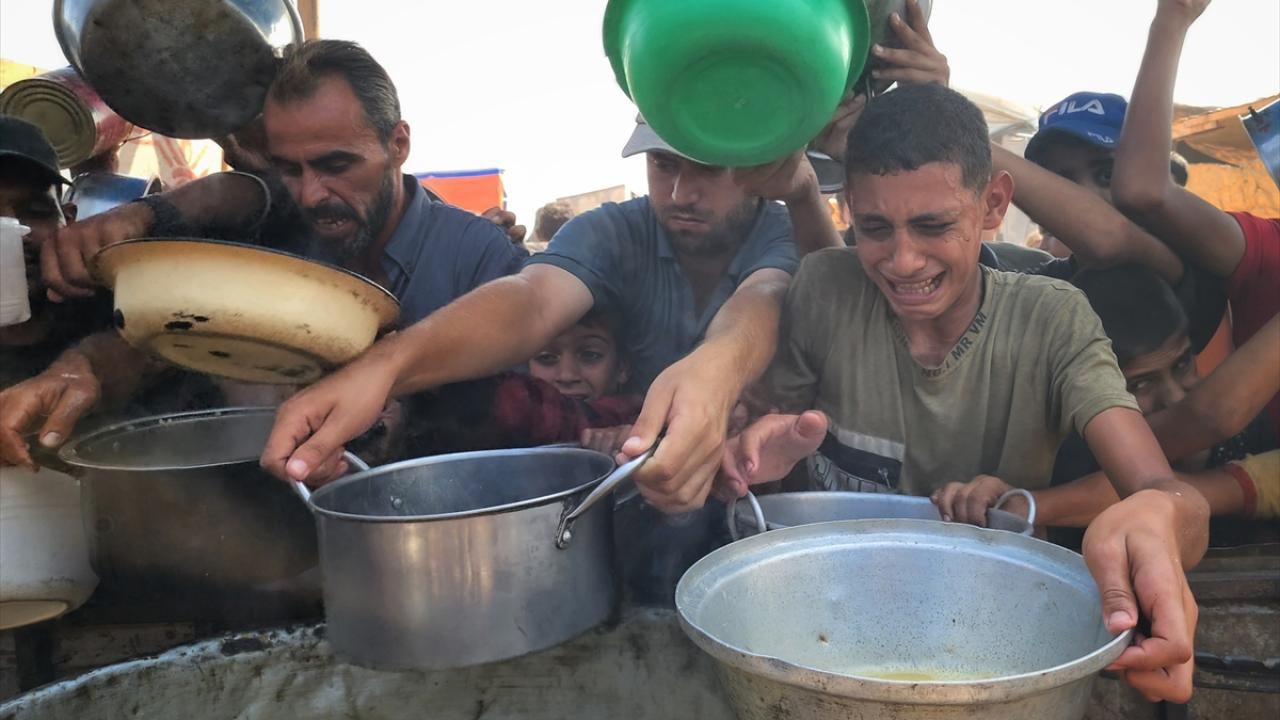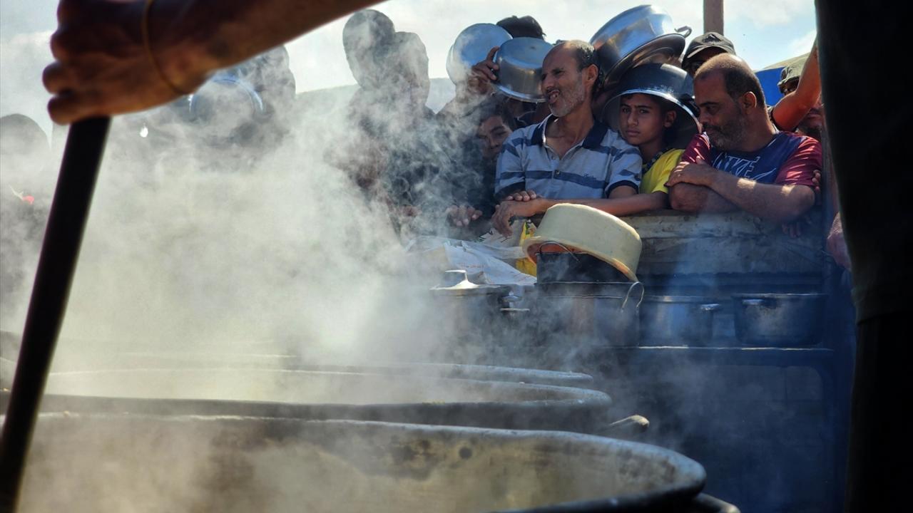 Açlık ve kıtlıkla boğuşan Filistinliler, hayır kurumlarının dağıttığı yemeklerden alabilmek için her gün saatlerce kuyrukta bekliyor.