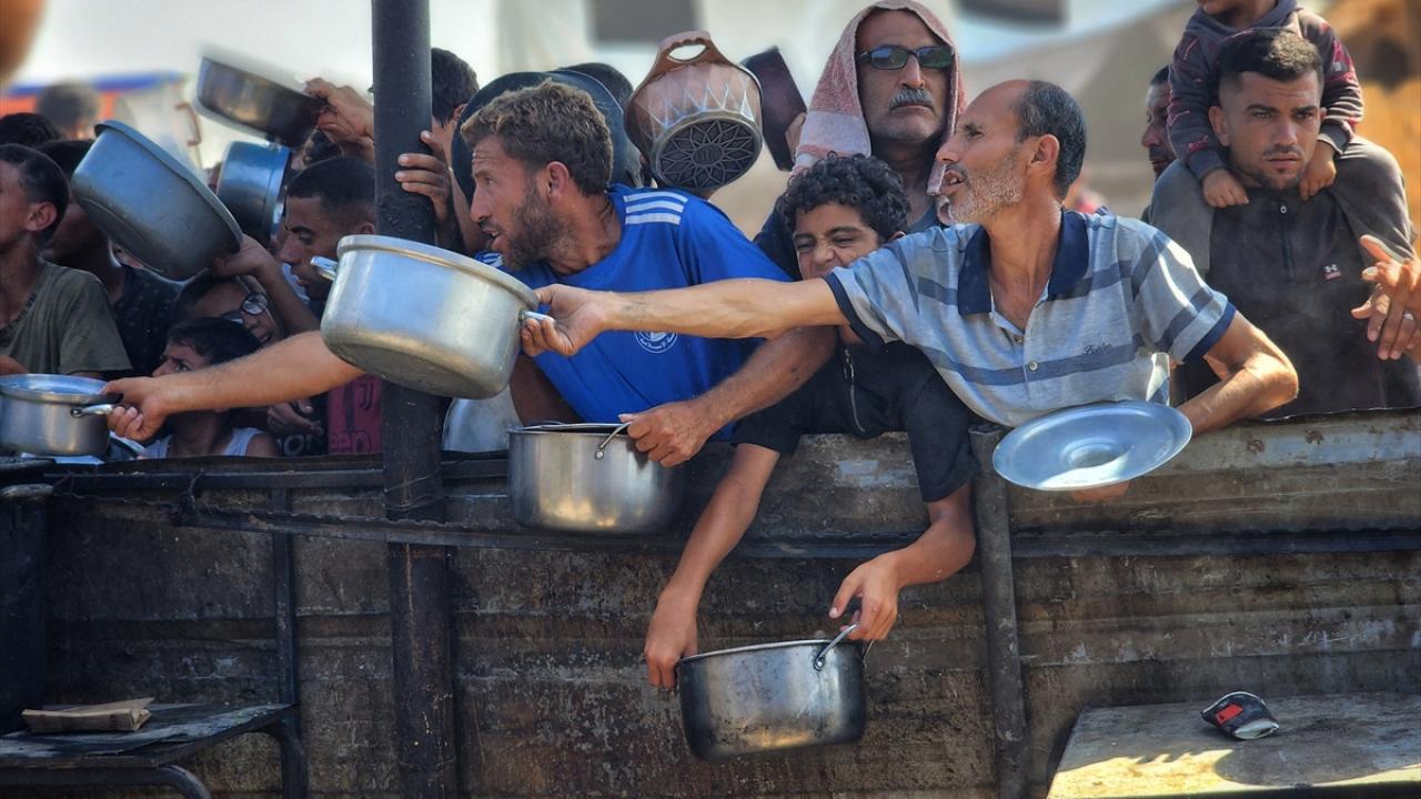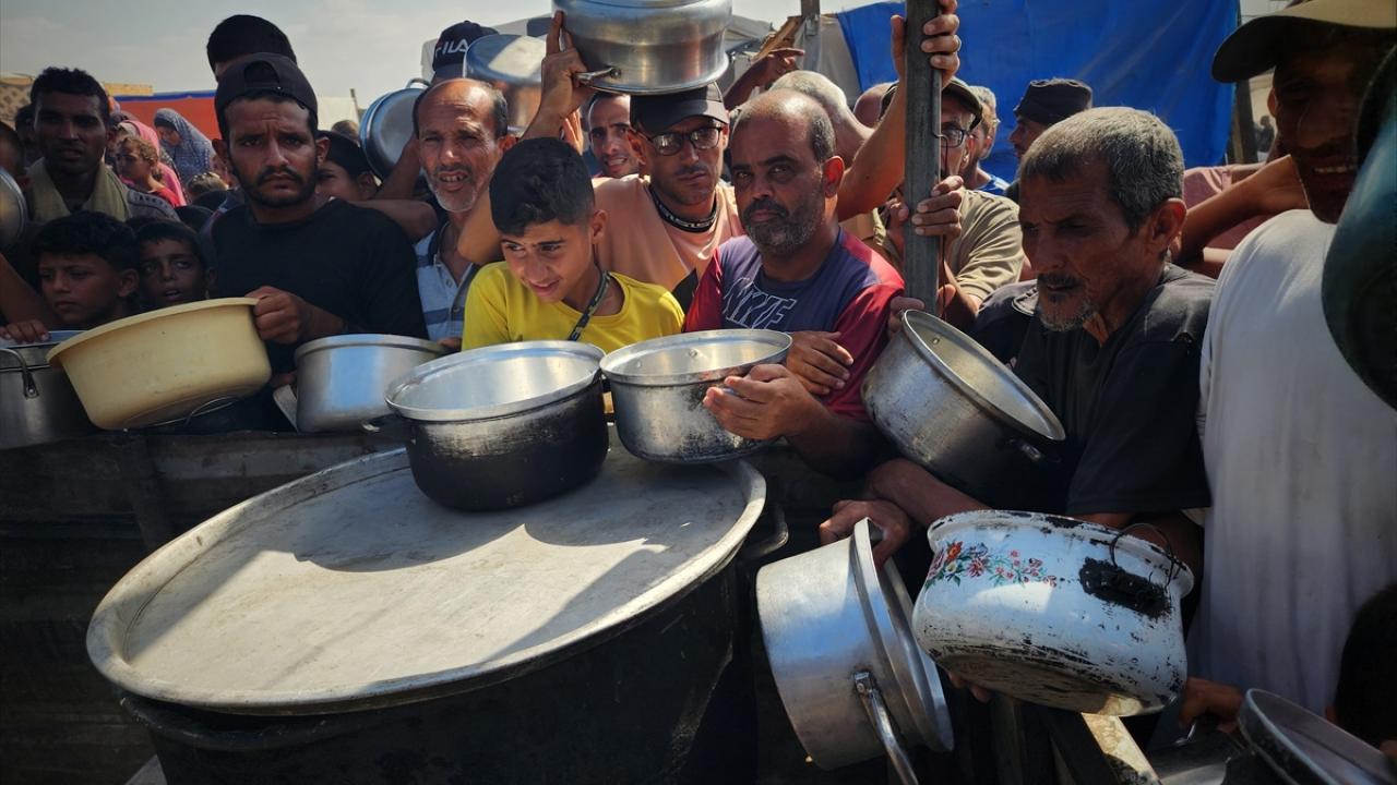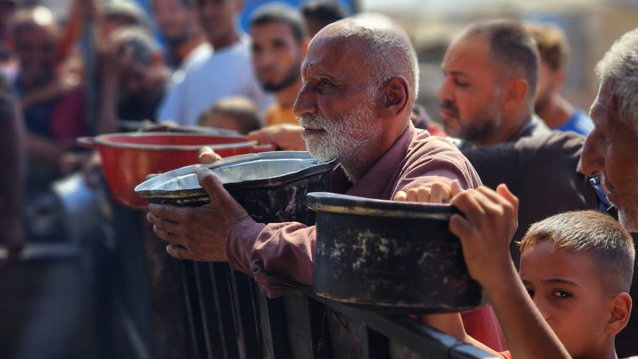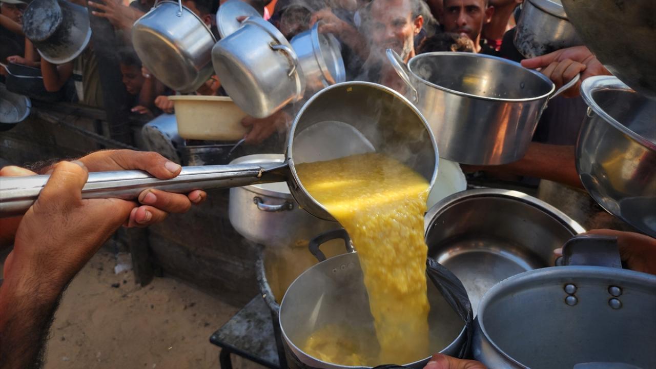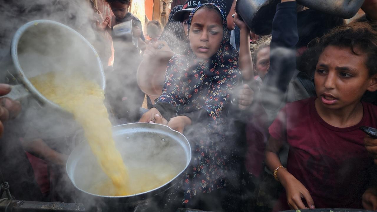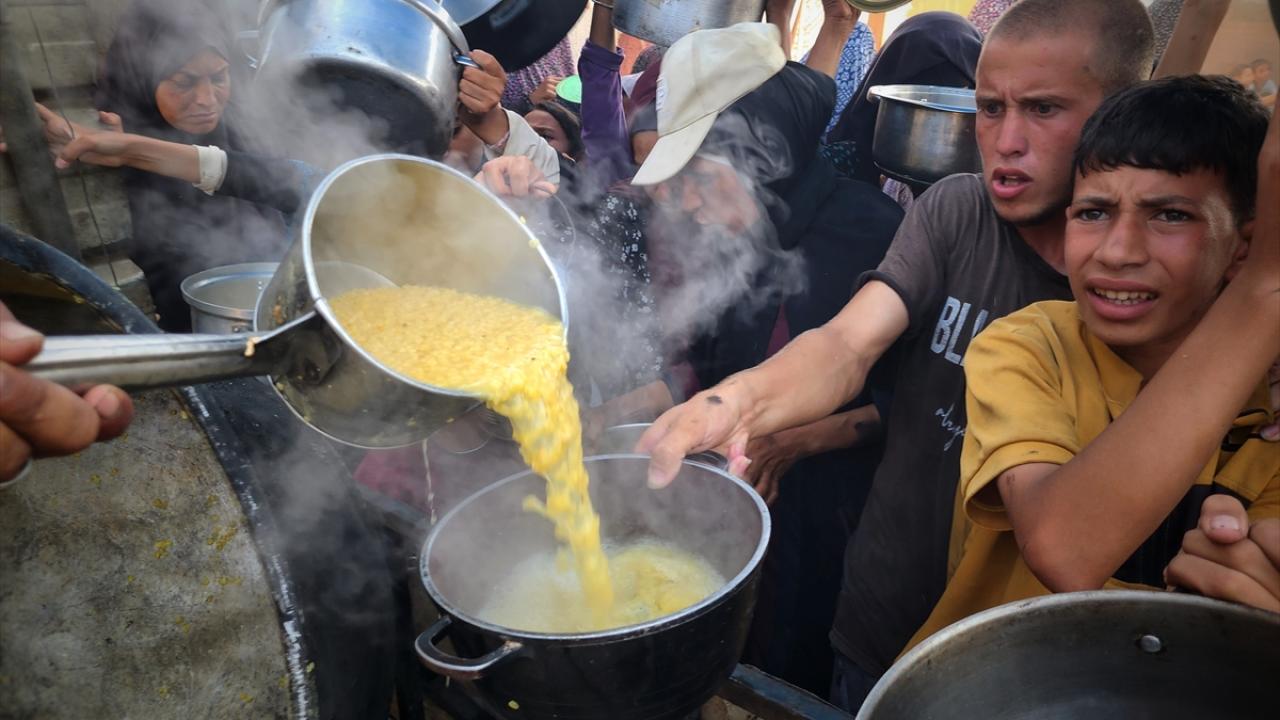 Açlık ve kıtlıkla boğuşan Filistinliler, hayır kurumlarının dağıttığı yemeklerden alabilmek için her gün saatlerce kuyrukta bekliyor.