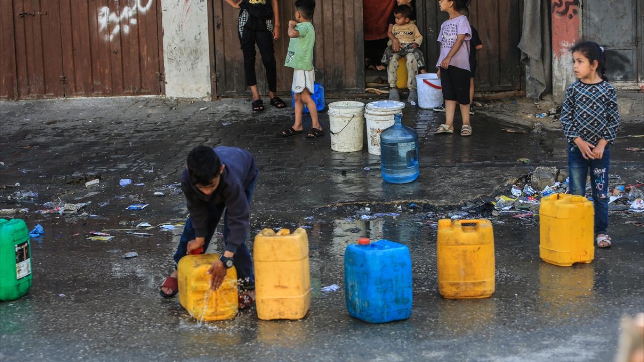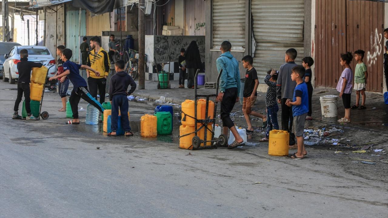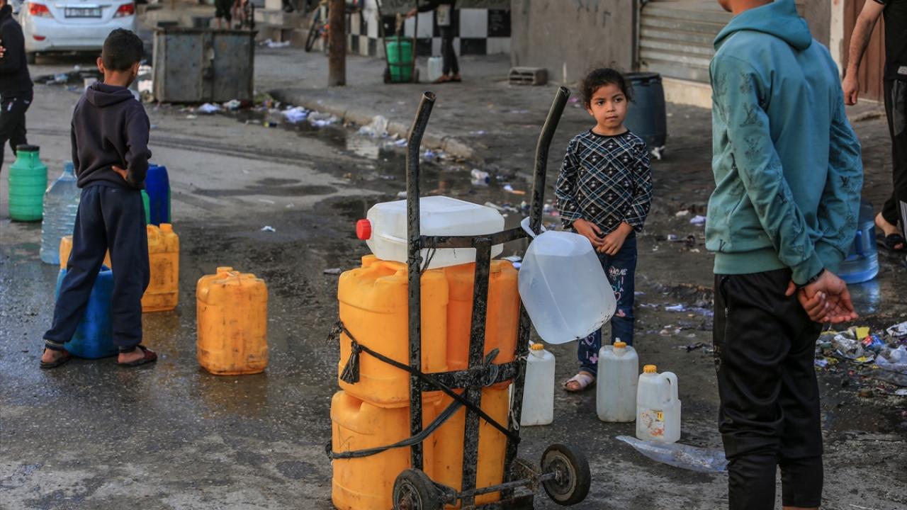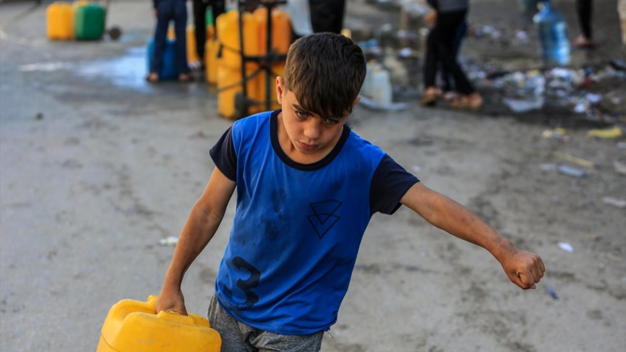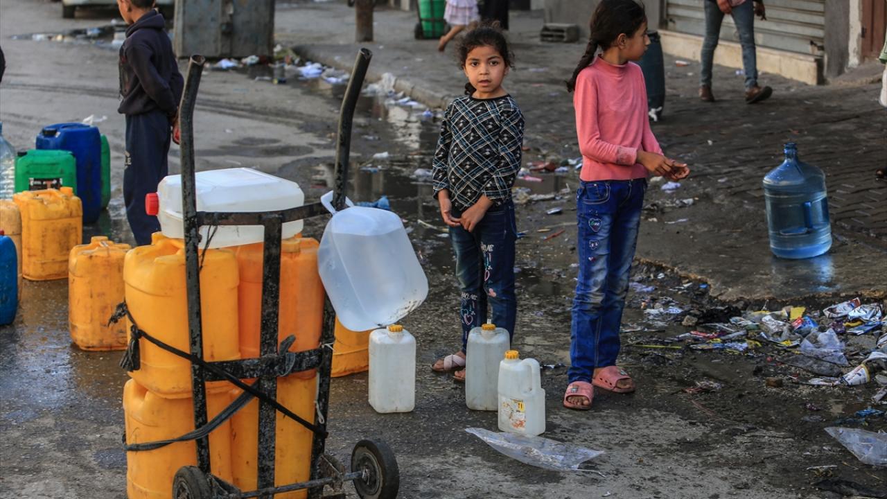 Filistinliler, günlük su ihtiyaçlarını temin etmek için su kuyruklarında bekliyor. Büyükler gibi çocuklar da su kuyruklarına girerek ailelerine destek olmaya çalışıyor.