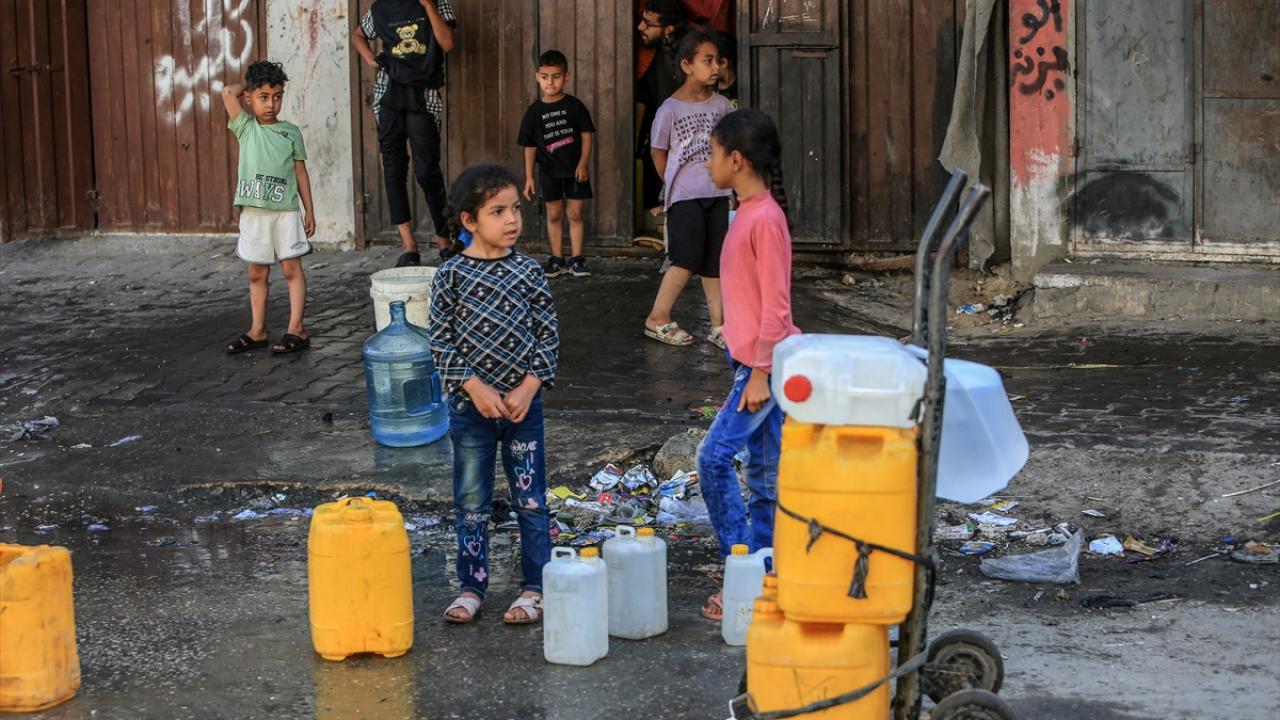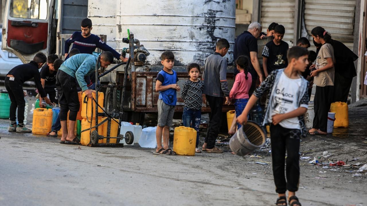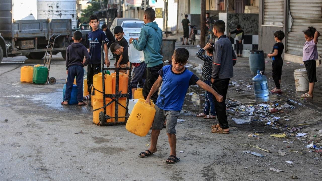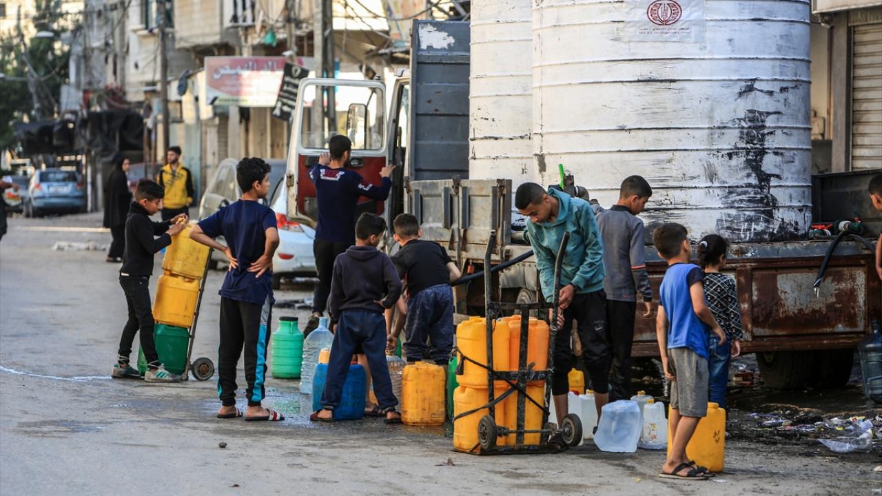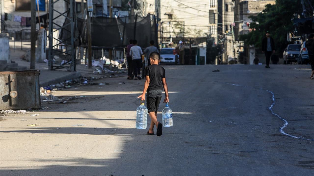 Filistinliler, günlük su ihtiyaçlarını temin etmek için su kuyruklarında bekliyor. Büyükler gibi çocuklar da su kuyruklarına girerek ailelerine destek olmaya çalışıyor.