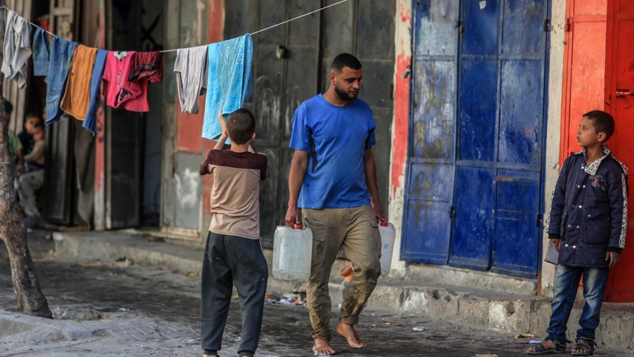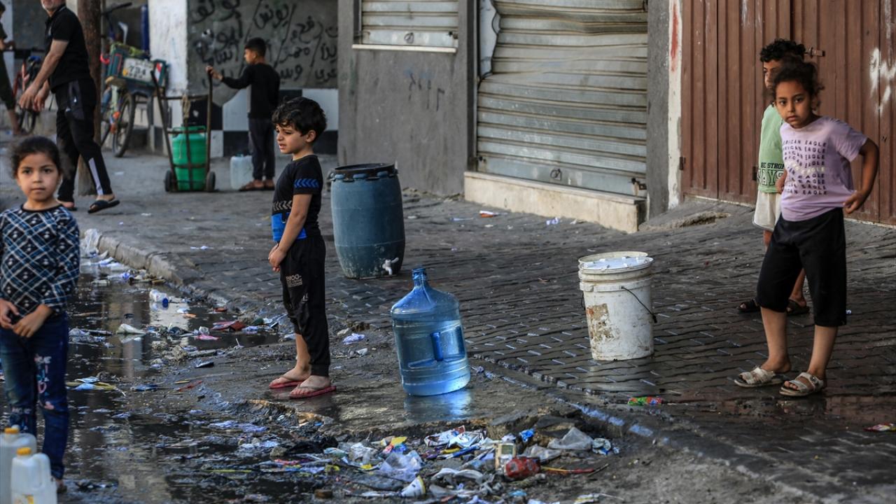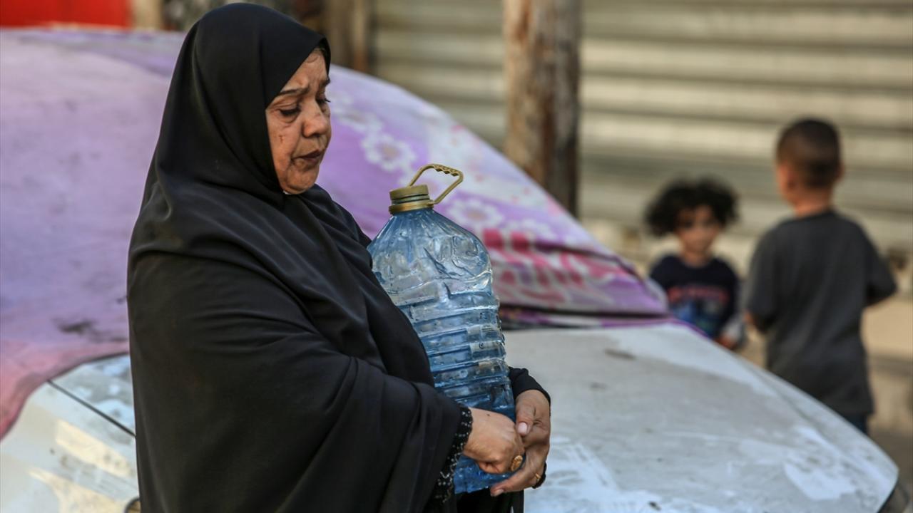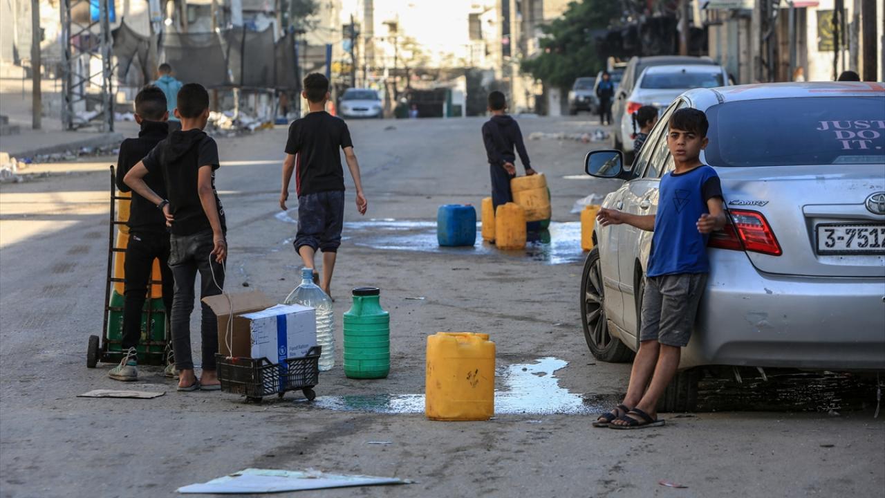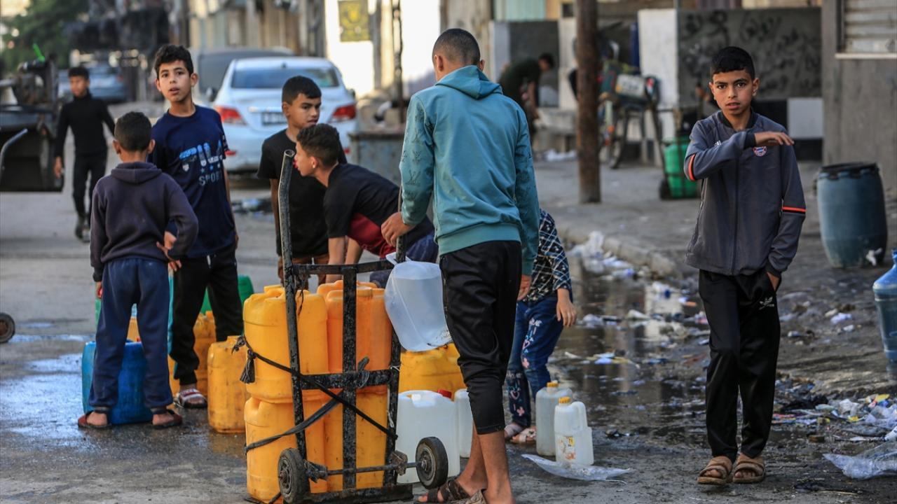 Filistinliler, günlük su ihtiyaçlarını temin etmek için su kuyruklarında bekliyor. Büyükler gibi çocuklar da su kuyruklarına girerek ailelerine destek olmaya çalışıyor.