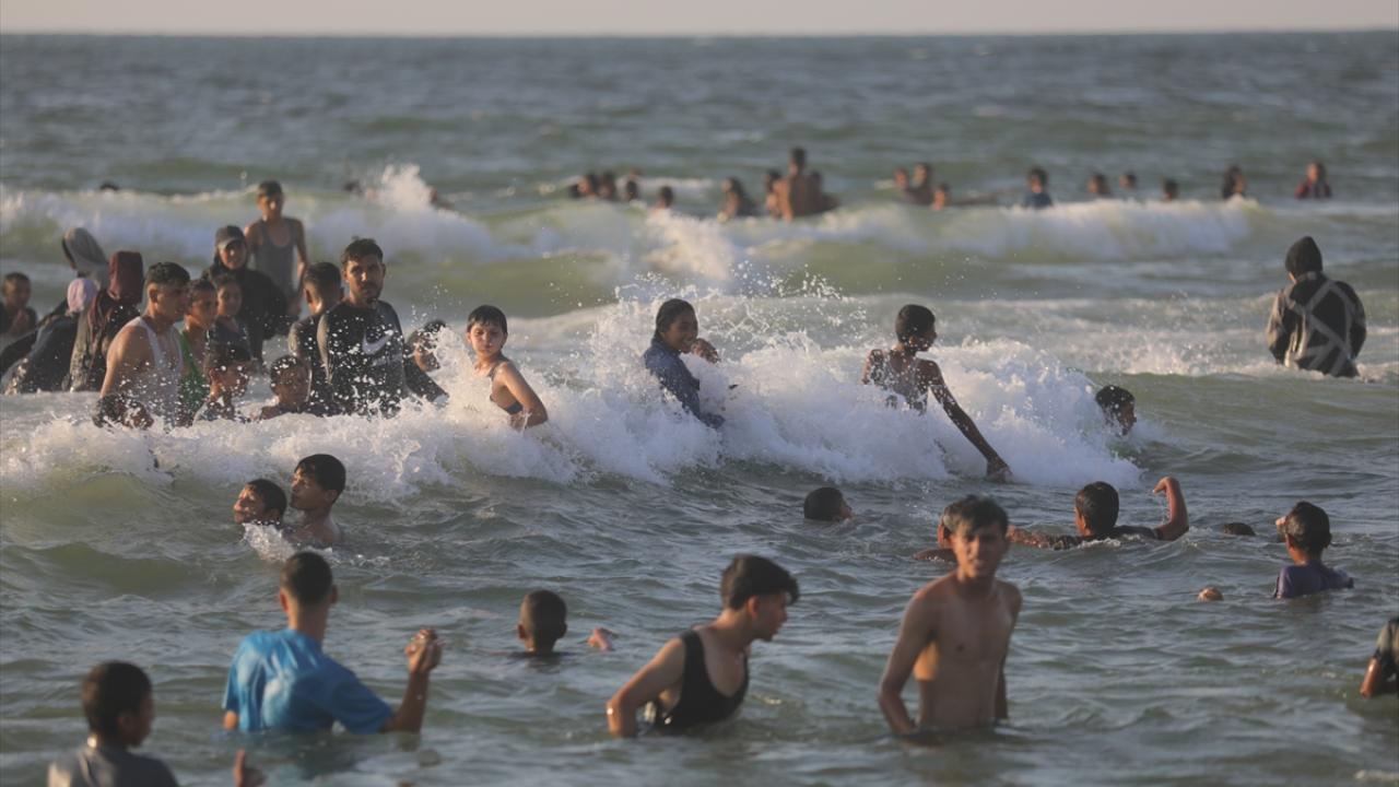 Deyr Belah sahiline gelen Gazzeliler havanın da sıcak olmasını fırsat bilerek denize girdi.