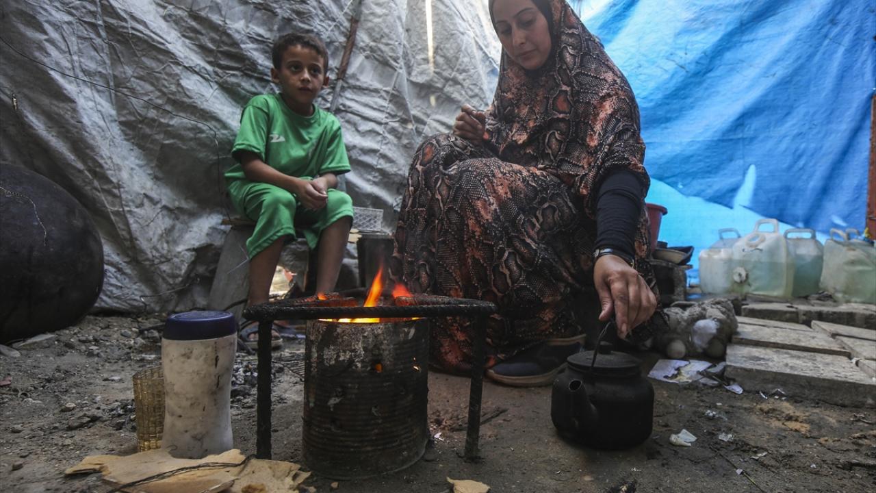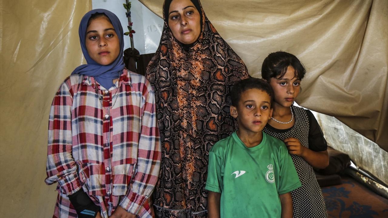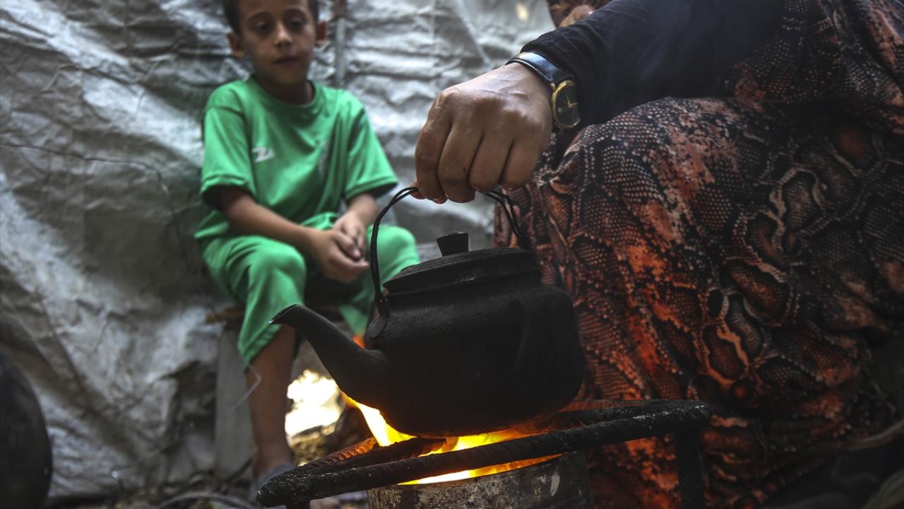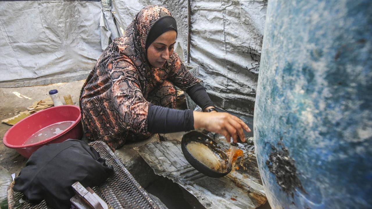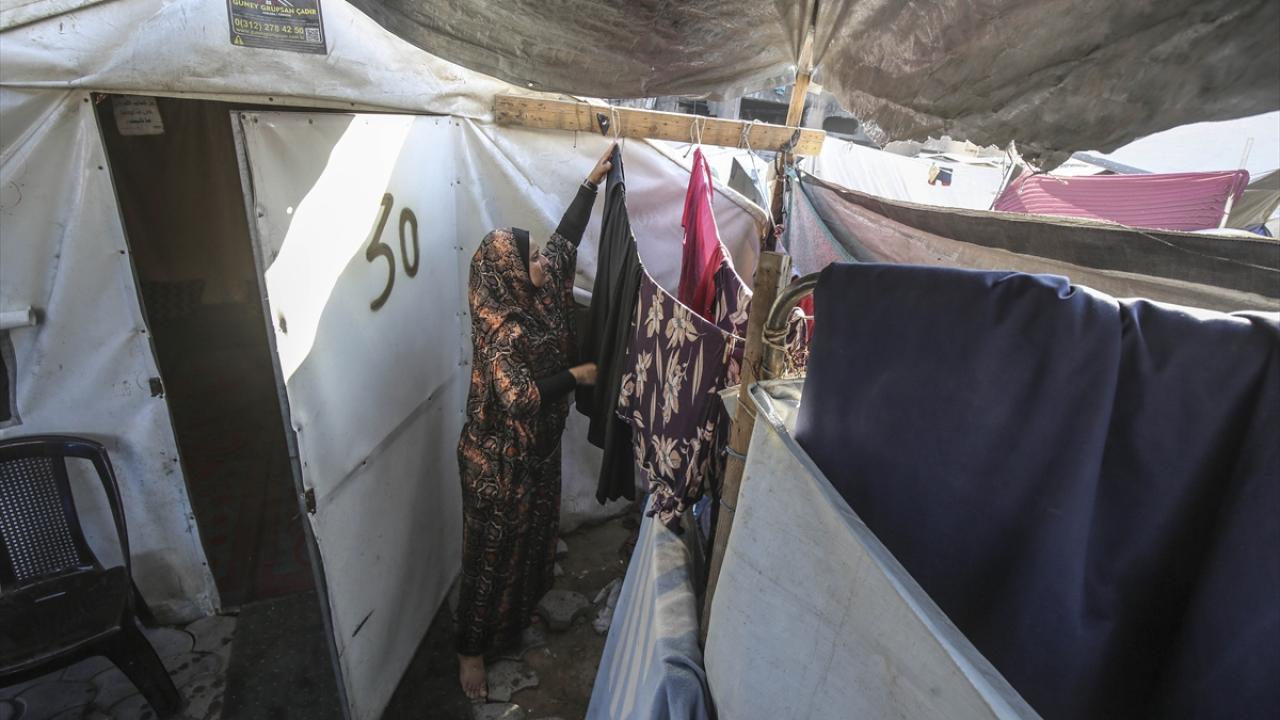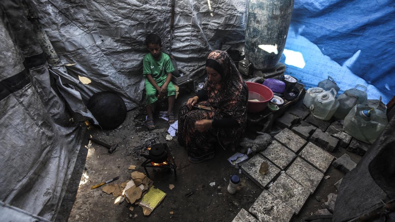 Soykırımcı İsrail ordusunun Gazze Şeridi'ne düzenlediği saldırıda eşini kaybeden 40 yaşındaki Filistinli Vahibe Muhaysin, Gazze kentinin Şeyh Rıdvan Mahallesi'nde çocuklarıyla birlikte sığındığı derme çatma çadırda zor şartlar altında yaşamını sürdürüyor.