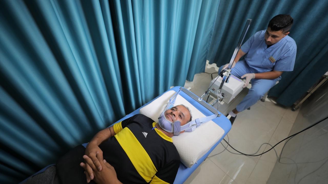 İsrail'in Gazze Şeridi'ne yönelik saldırılarında yaralanan Filistinliler, Gazze Şeridi'nin orta kesimindeki Nuseyrat kampı bölgesinde fizyoterapistler eşliğinde tedavi görüyor.