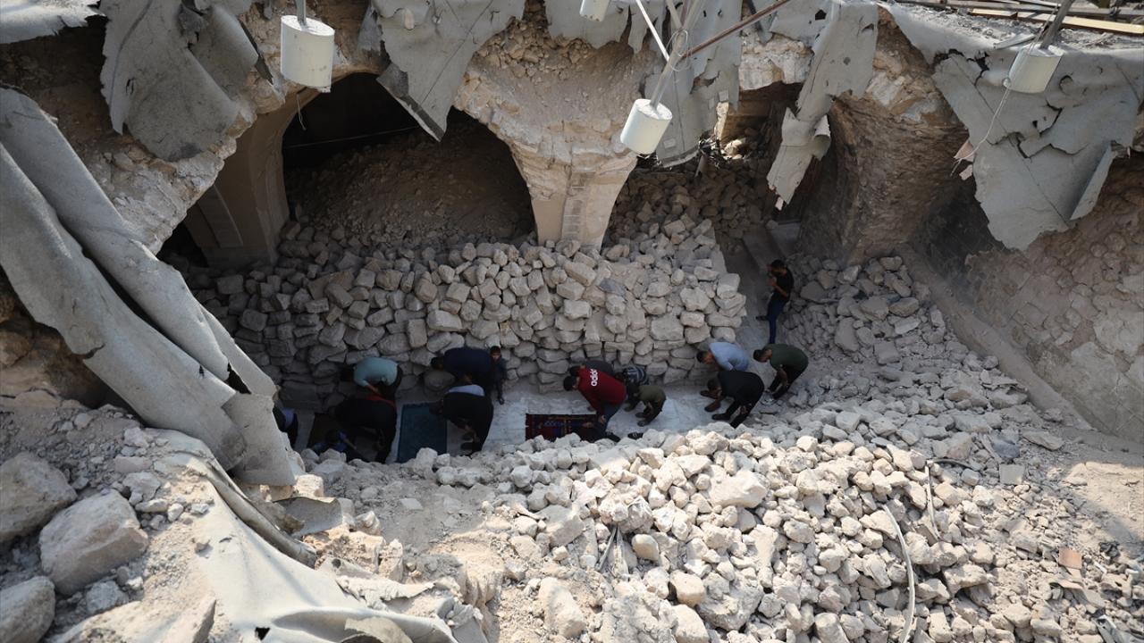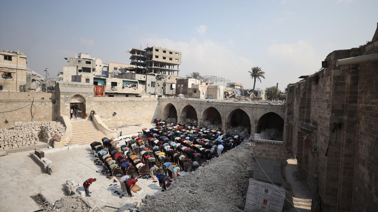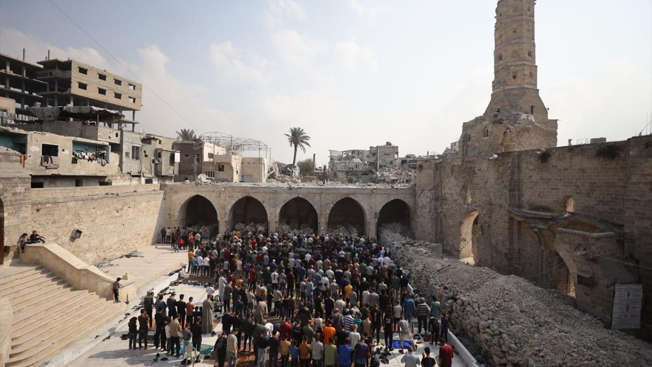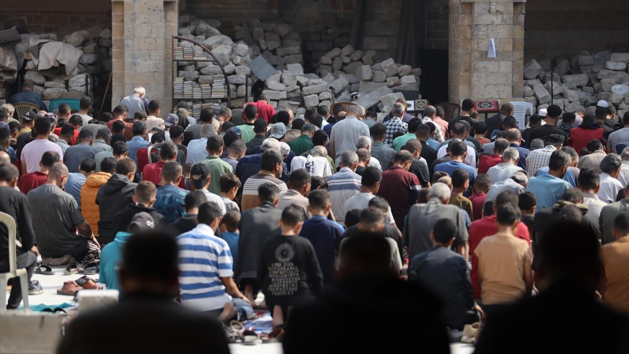 Bölge sakini çok sayıda Filistinli, İsrail saldırılarında yıkıma uğrayan Büyük Ömer Camii`nde namazını kıldı.