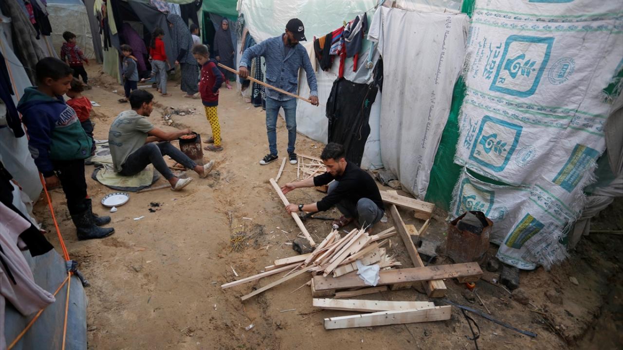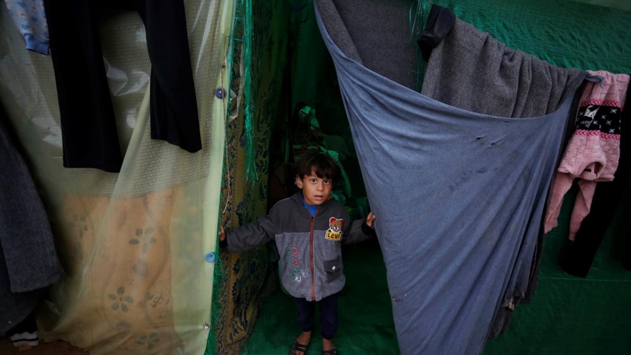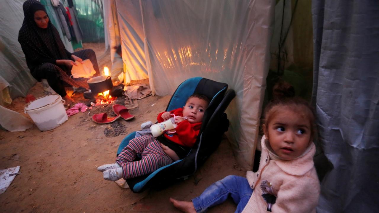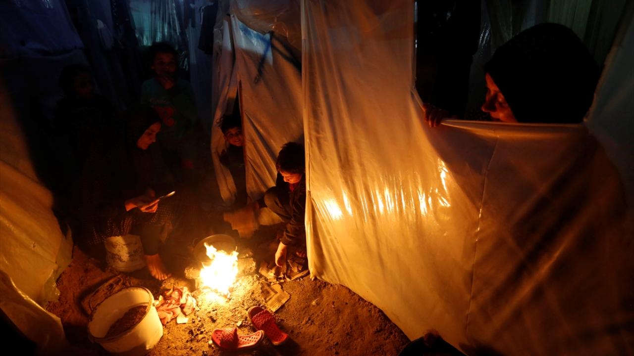 İsrail bombardımanından korunmak ve can güvenliklerini sağlayabilmek için evlerini terk edip Deyr Belah kentine sığınan Filistinli aileler, Aksa Şehitleri Hastanesi çevresinde kurdukları derme çatma çadırlarda soğuk hava şartlarıyla mücadele ediyor.