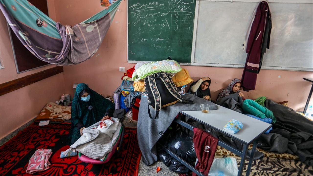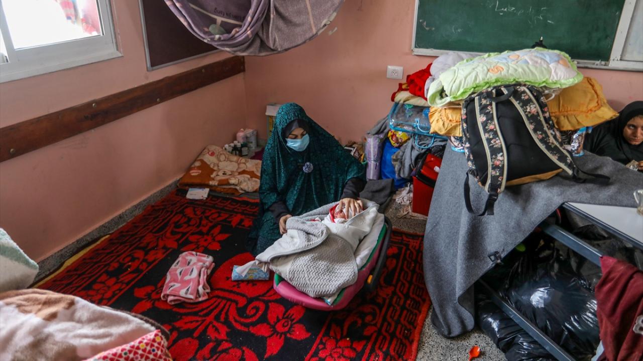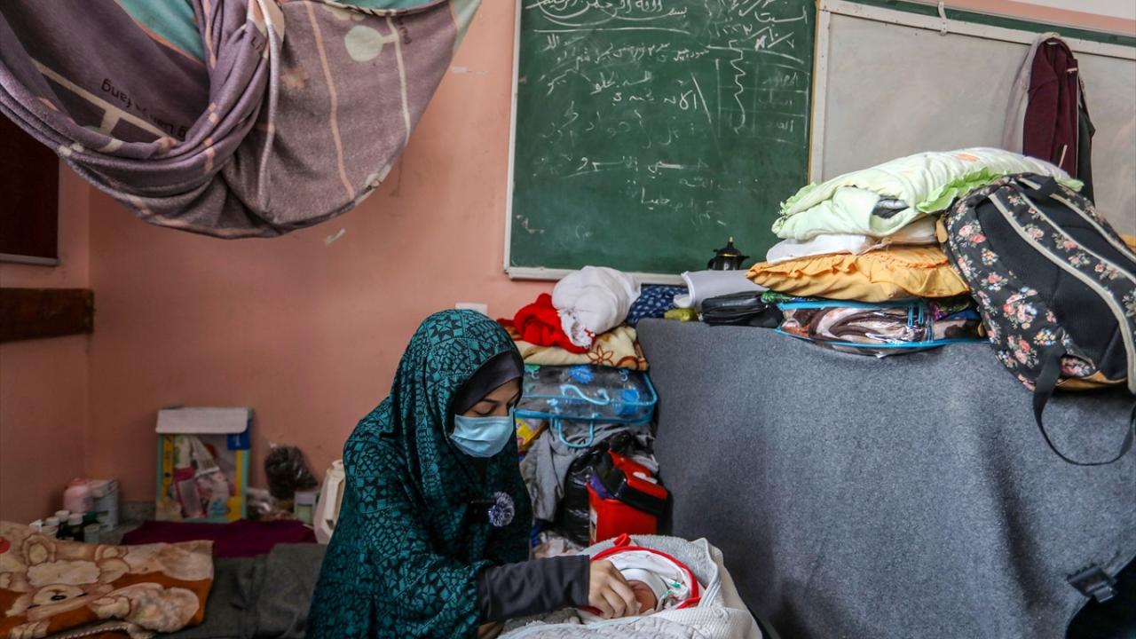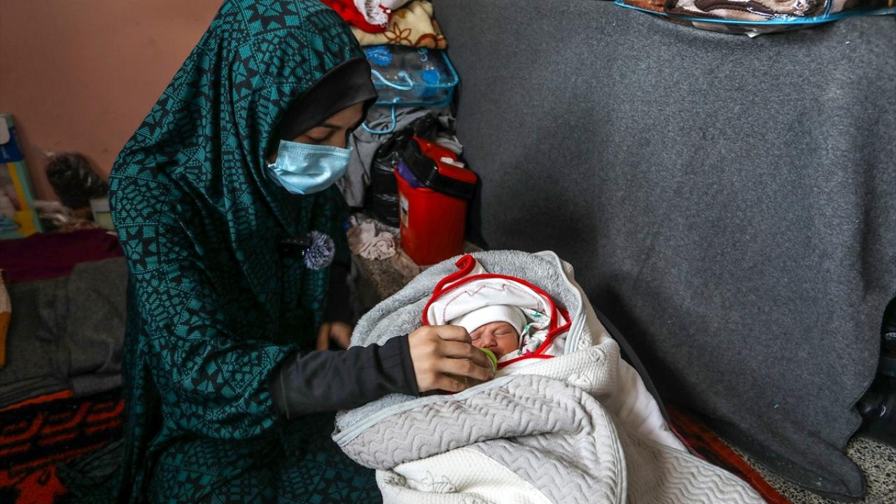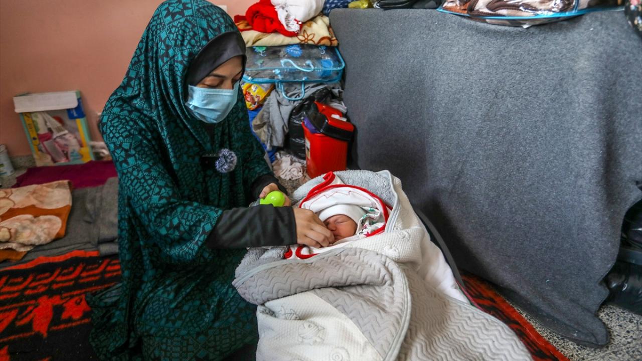 İsrail'in Gazze Şeridi'ne düzenlediği saldırılarda Gazze kentindeki evinden olan Filistinli Nour Bedwan ve sığındığı Refah kentindeki Kudüs okulunda bir kız çocuğu dünyaya getirdi.