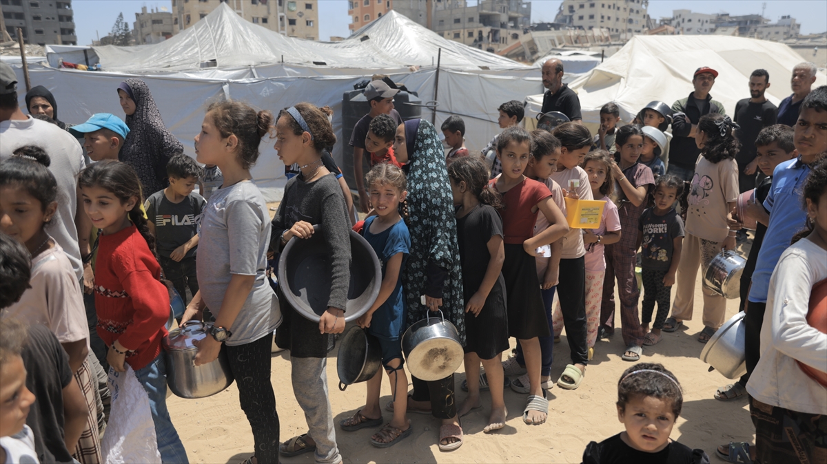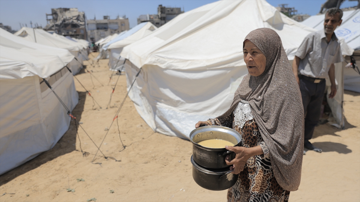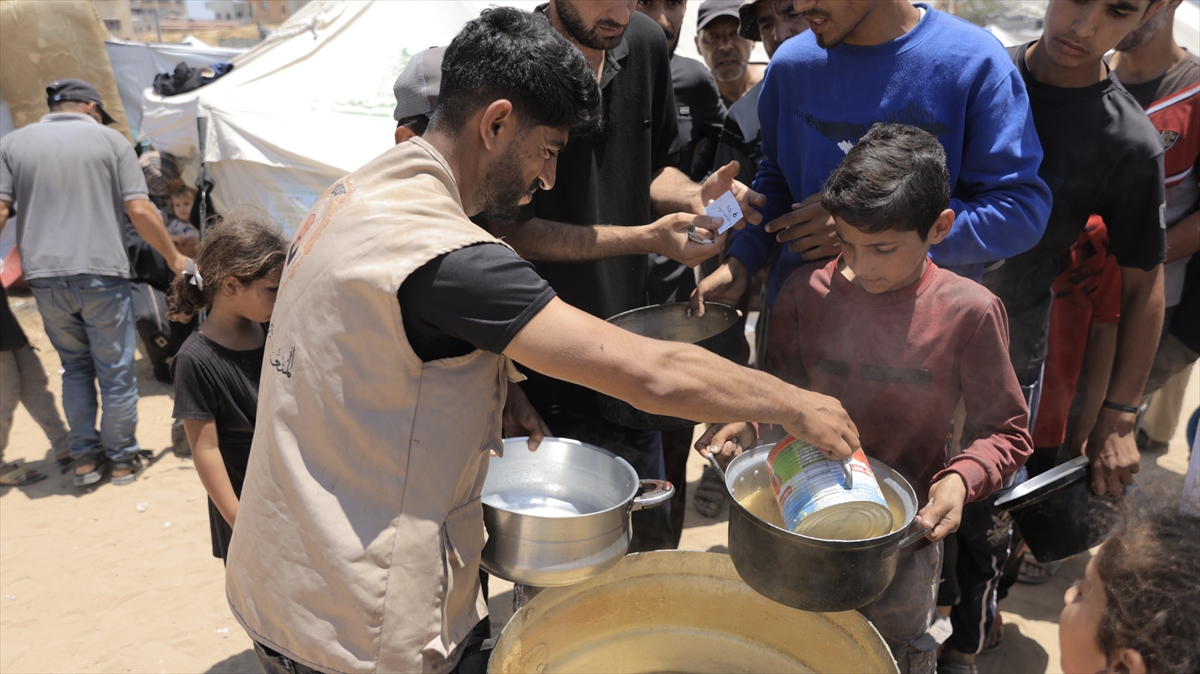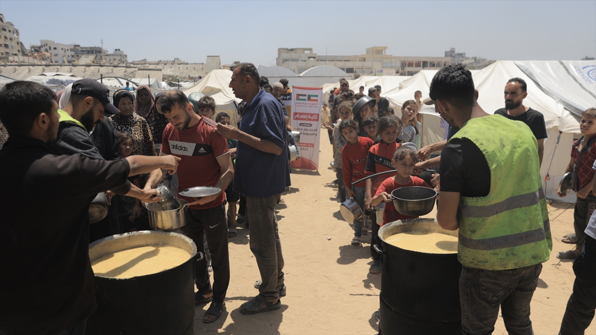 Bir hayır kurumu tarafından Gazze kentinin batısında çadırlarda yaşamını sürdüren yerinden edilen Filistinlilere, sıcak yemek dağıtımı yapıldı.