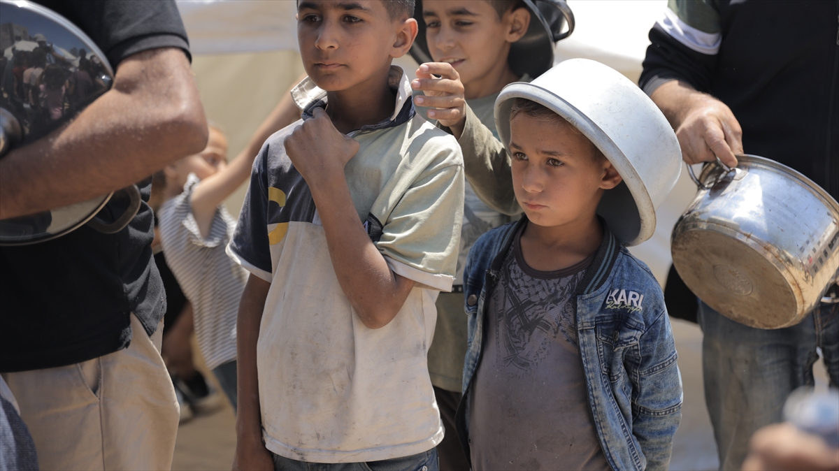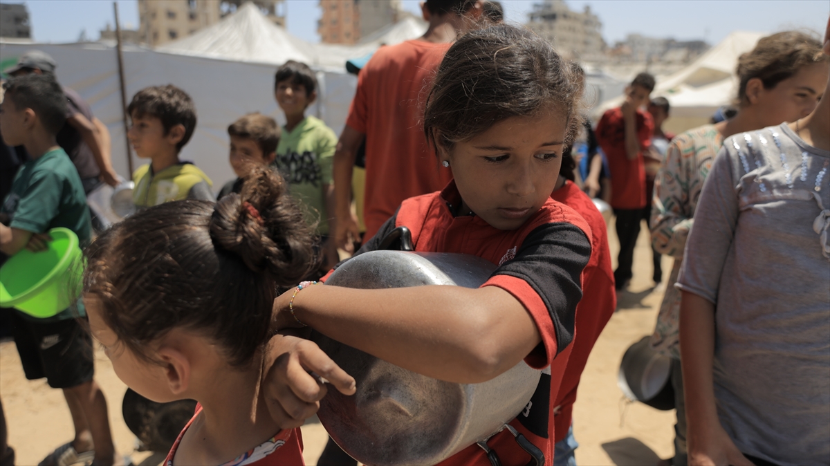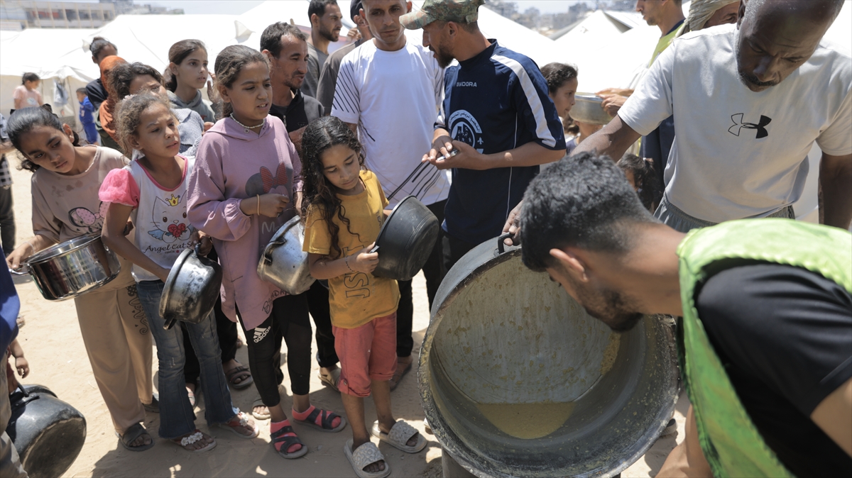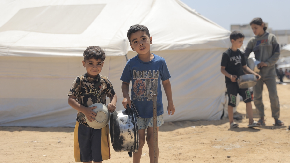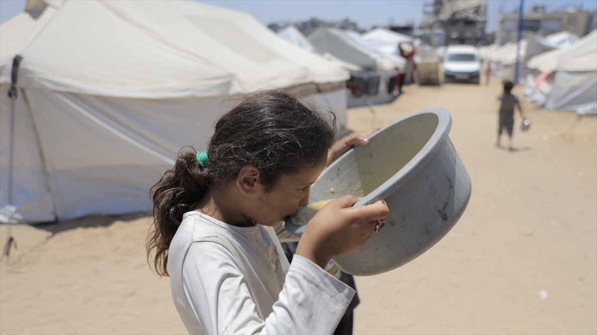 Bir hayır kurumu tarafından Gazze kentinin batısında çadırlarda yaşamını sürdüren yerinden edilen Filistinlilere, sıcak yemek dağıtımı yapıldı.