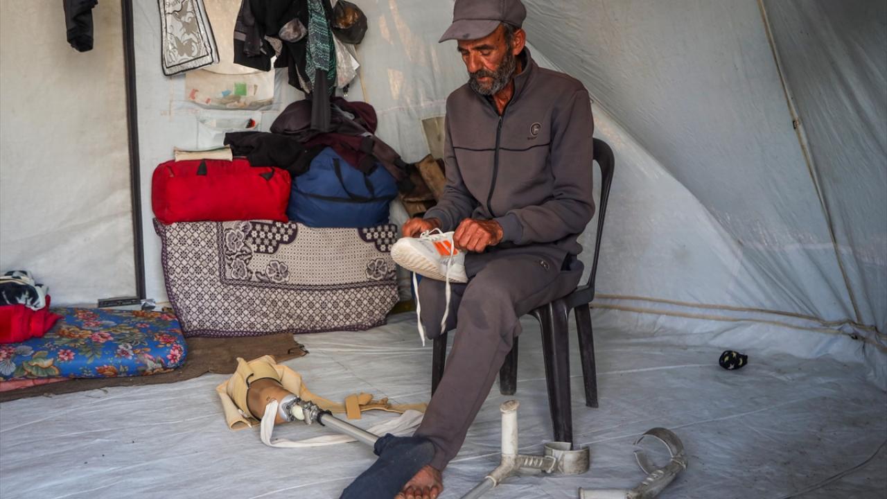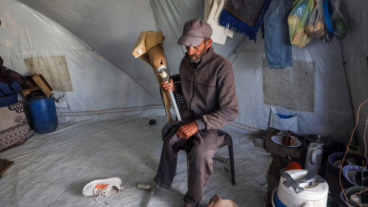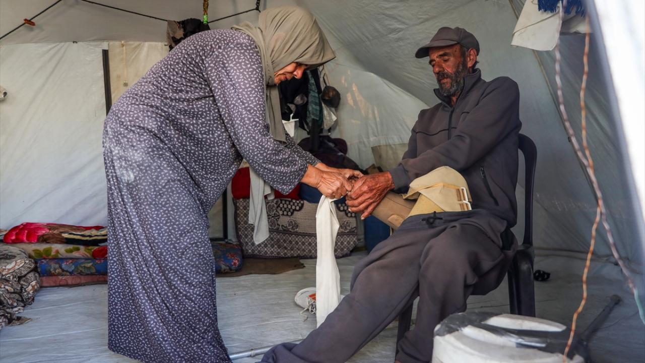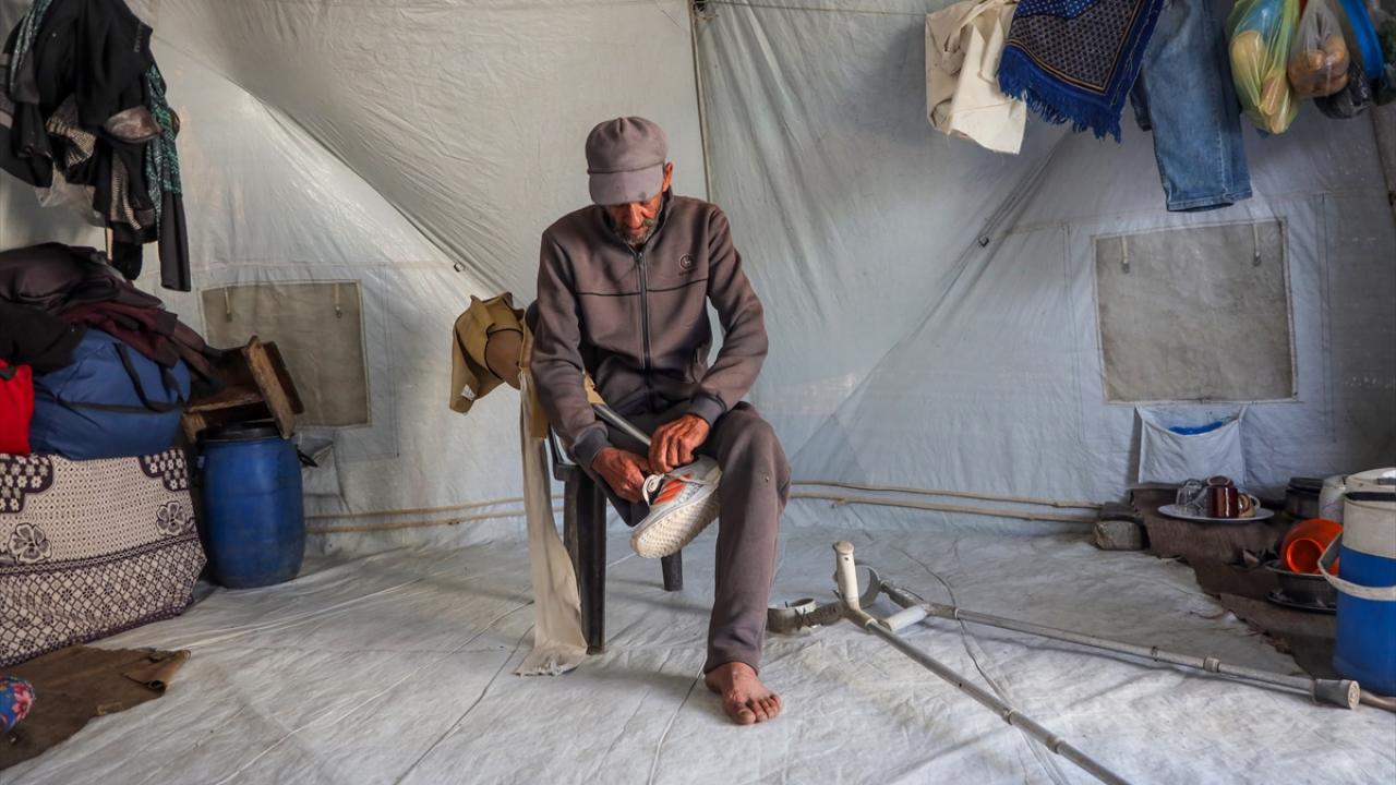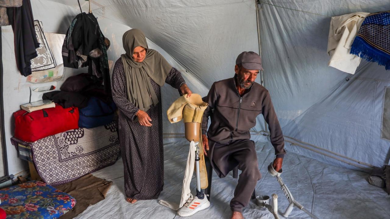Gazze kentinde derme çatma bir çadırda yaşayan Filistinli adam, engeline rağmen günlük işlerde eşine yardım ediyor.