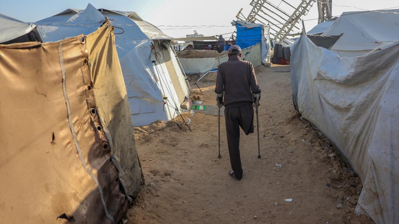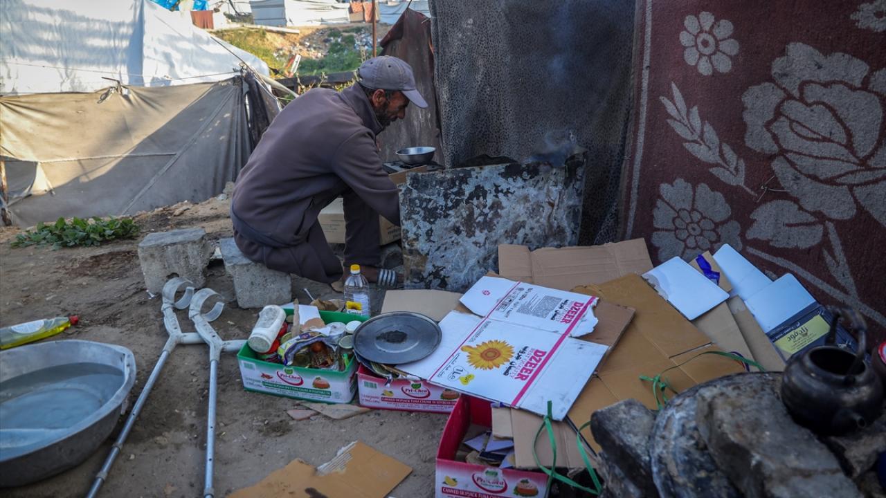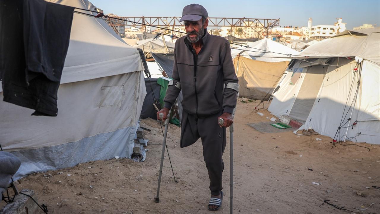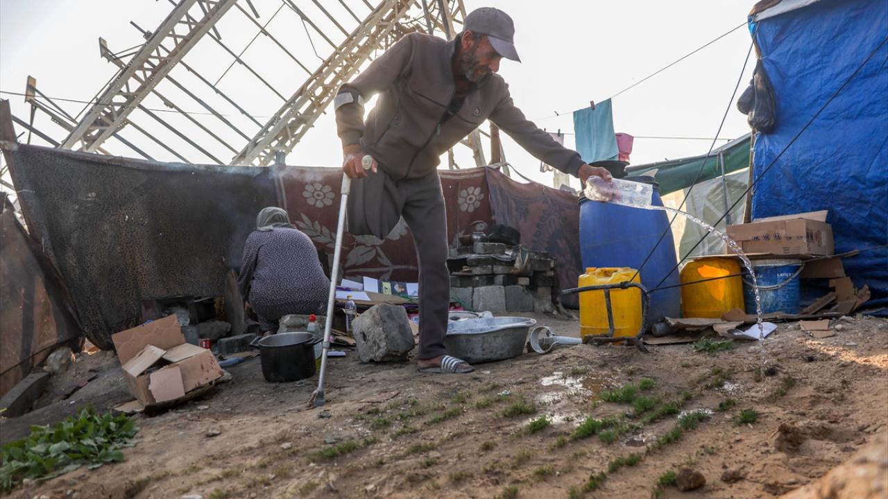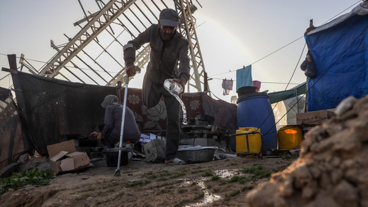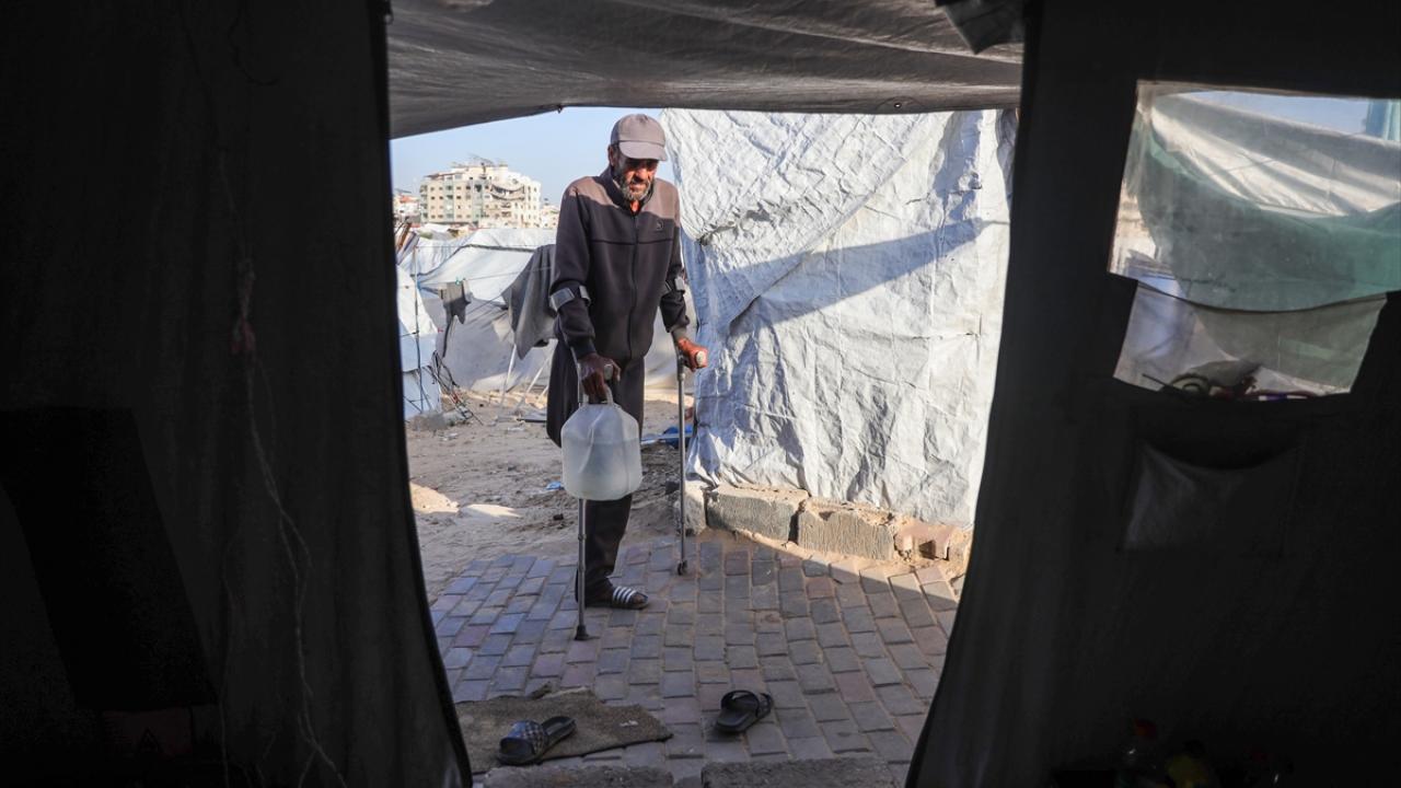 Gazze kentinde derme çatma bir çadırda yaşayan Filistinli adam, engeline rağmen günlük işlerde eşine yardım ediyor.