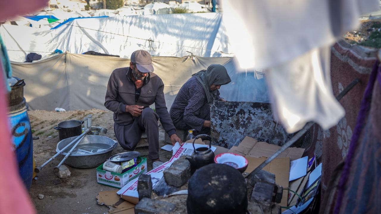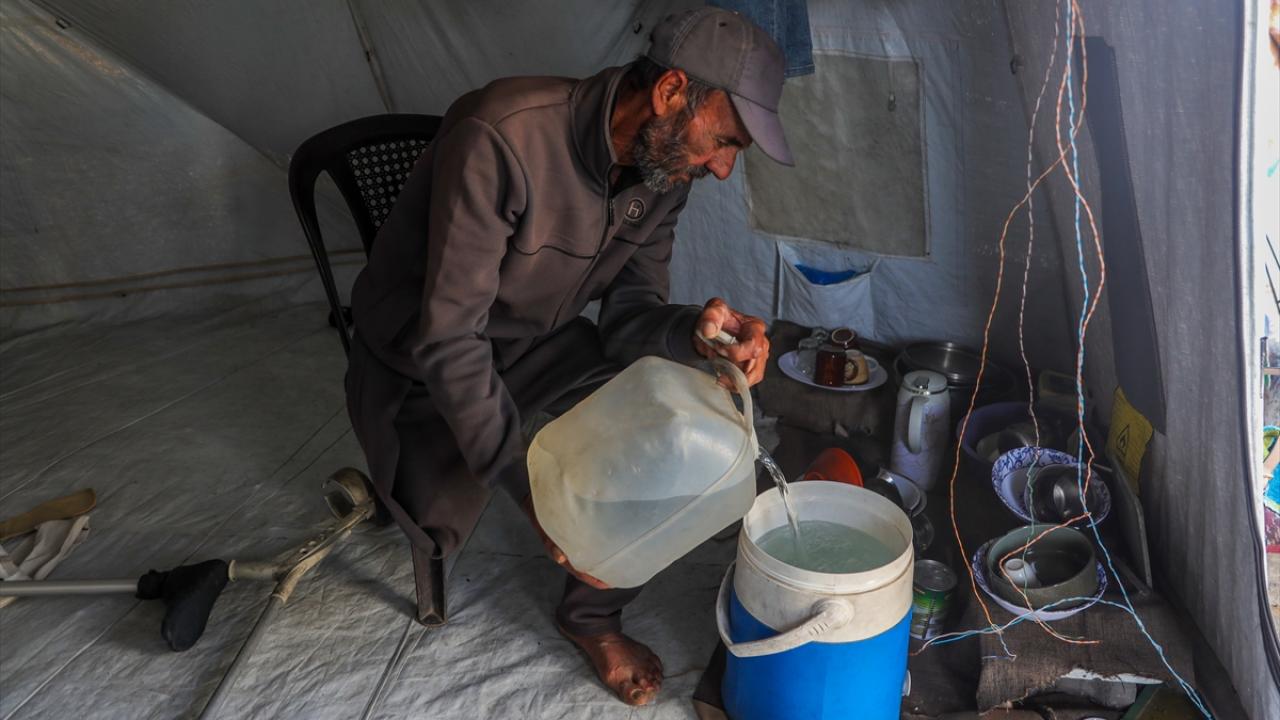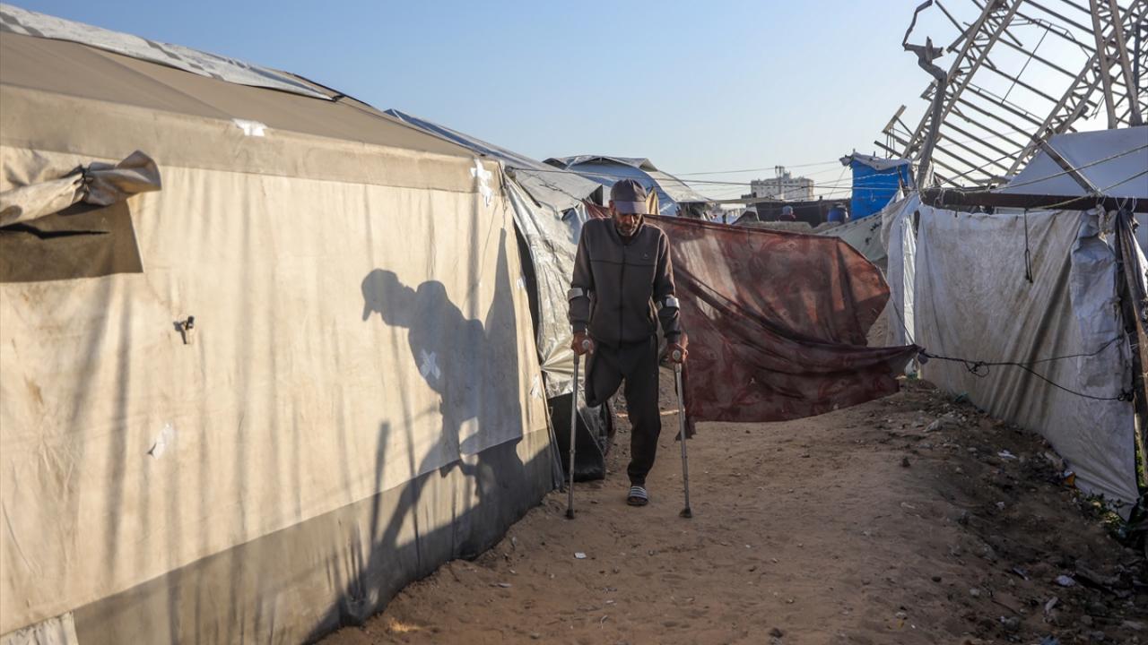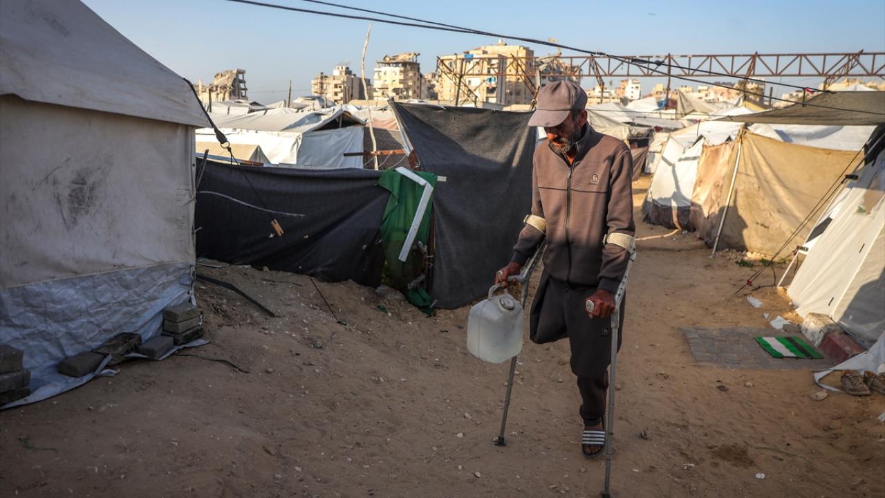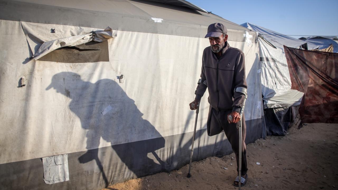 Gazze kentinde derme çatma bir çadırda yaşayan Filistinli adam, engeline rağmen günlük işlerde eşine yardım ediyor.