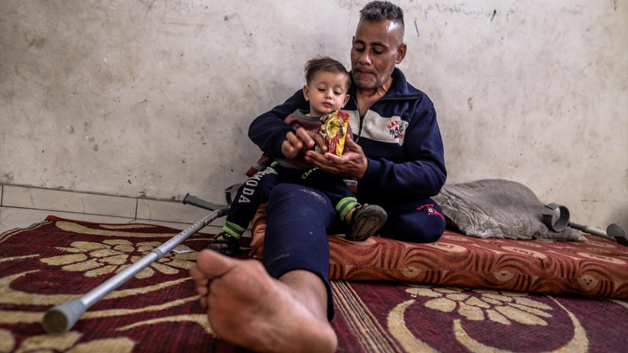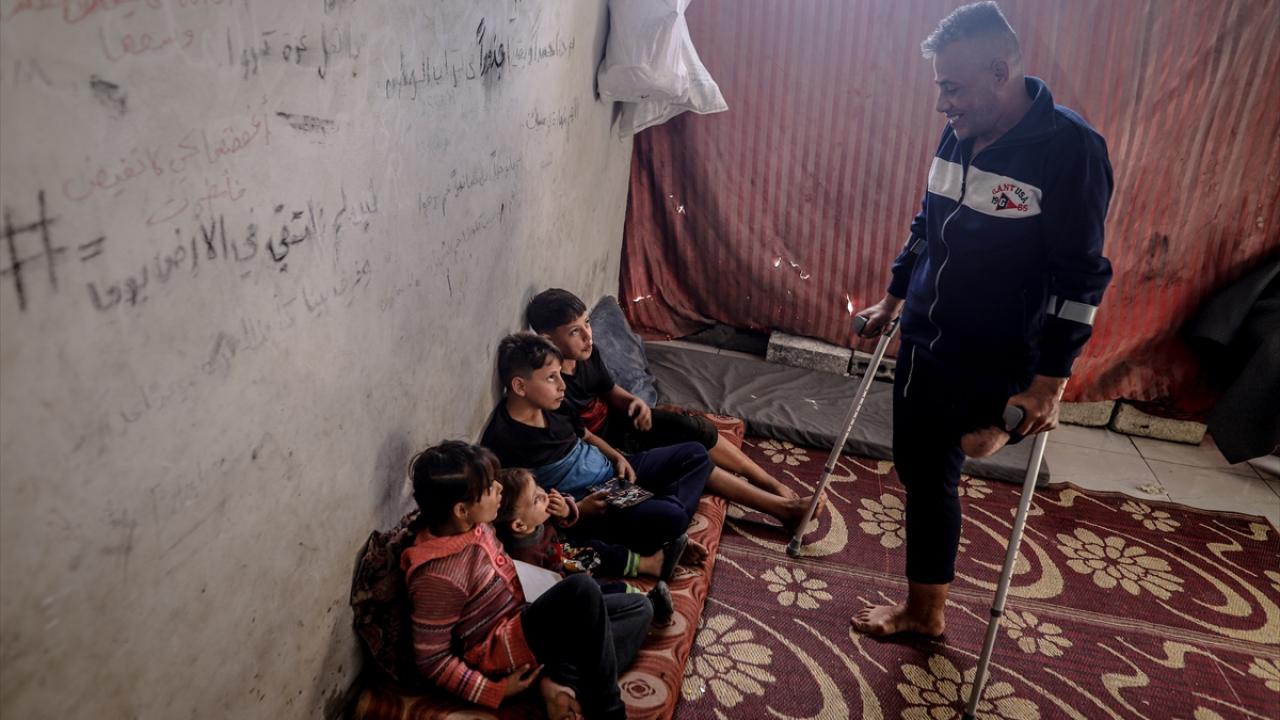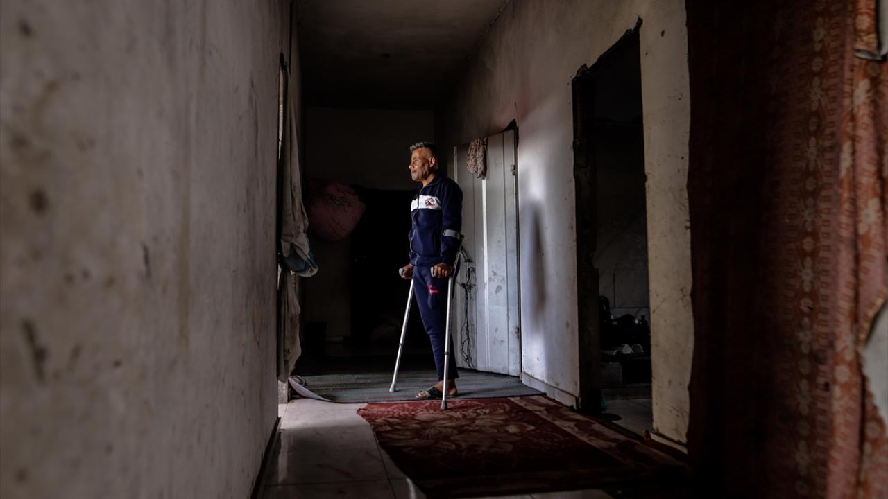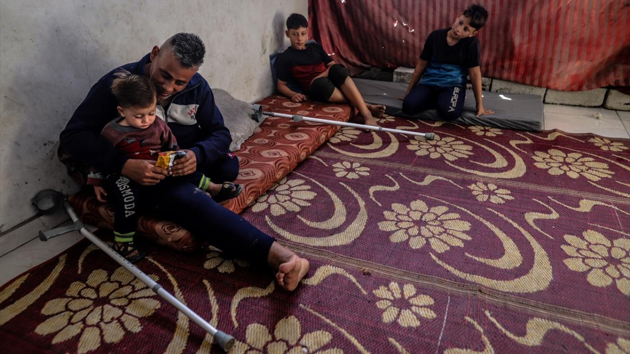 Dünya Engelliler Günü`nde Filistinli baba, bacağını kaybetmesi ve vücudunun çeşitli bölgelerine aldığı yaralar nedeniyle ailesinin geçimini sağlayamaz hale geldi.