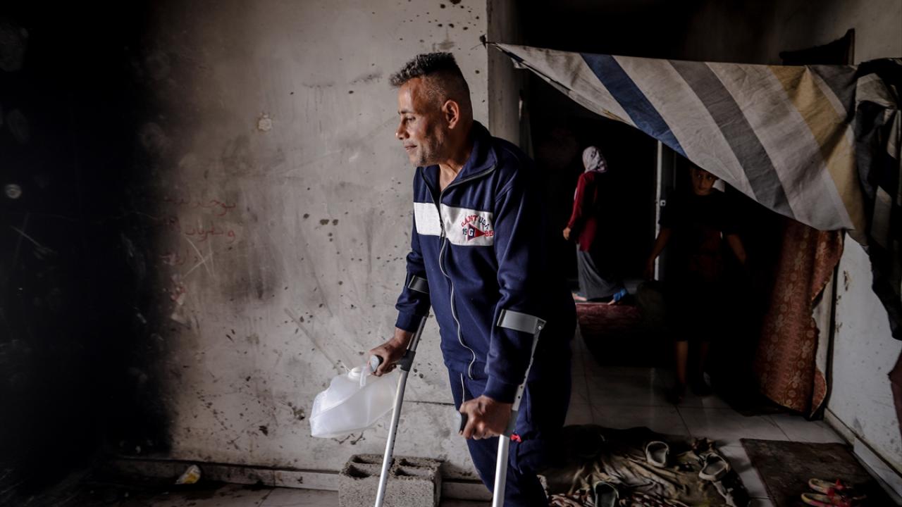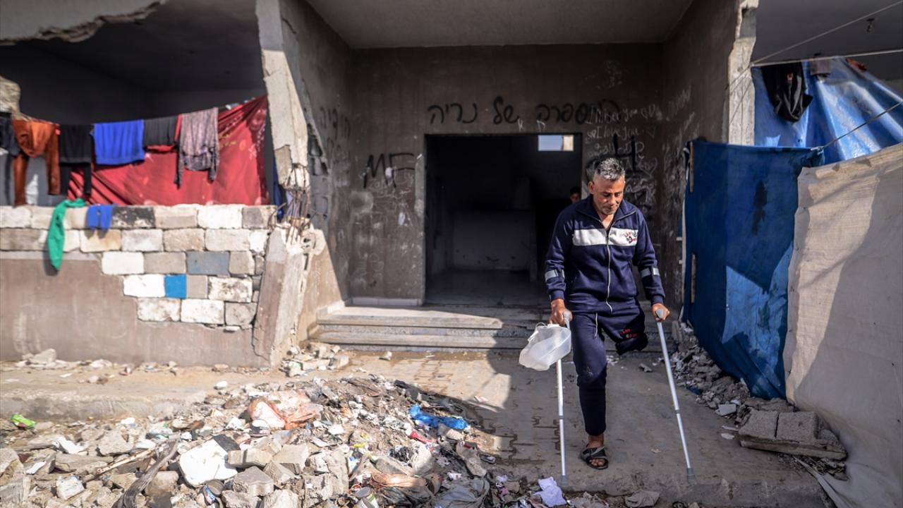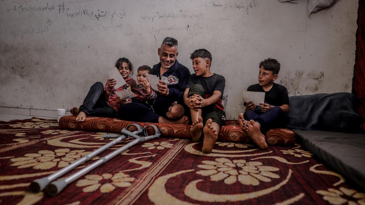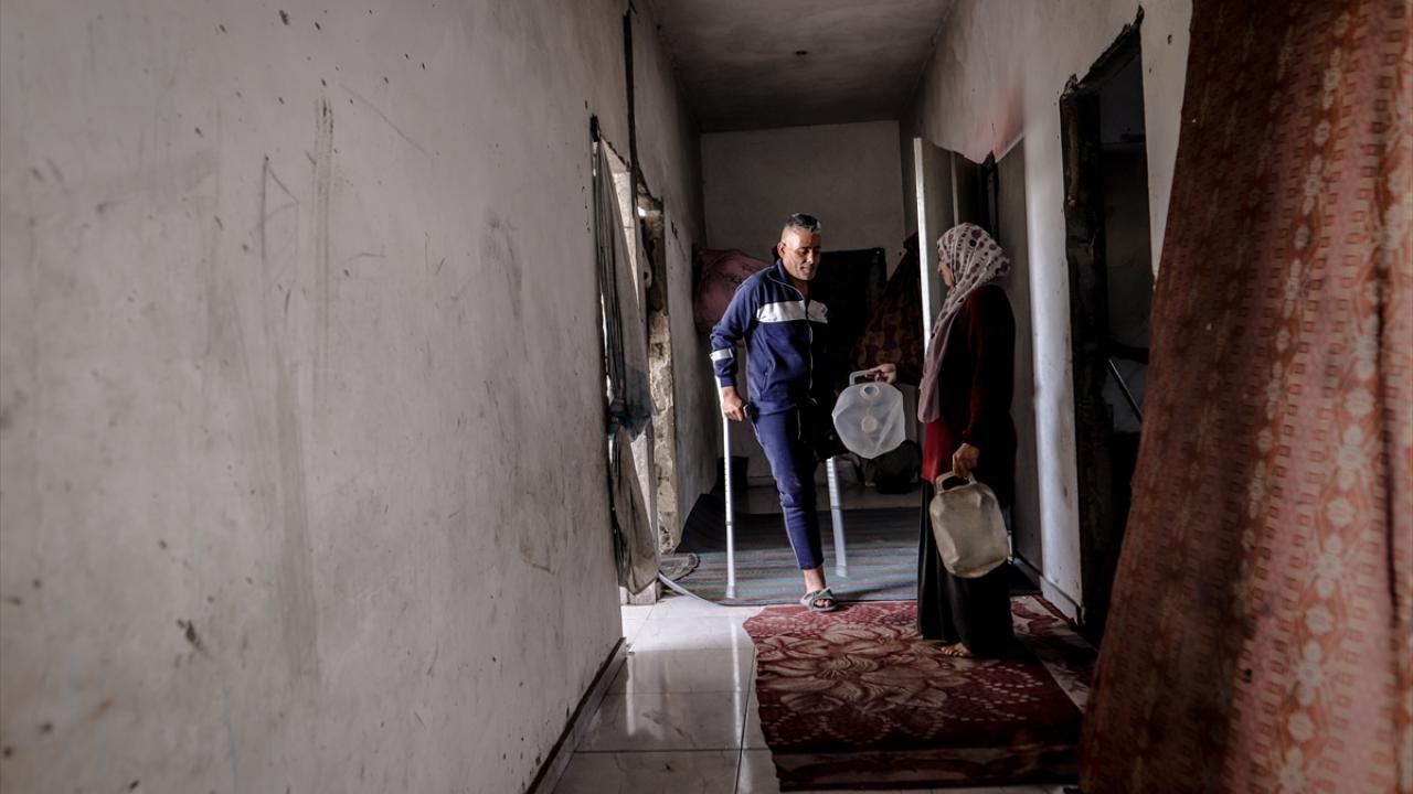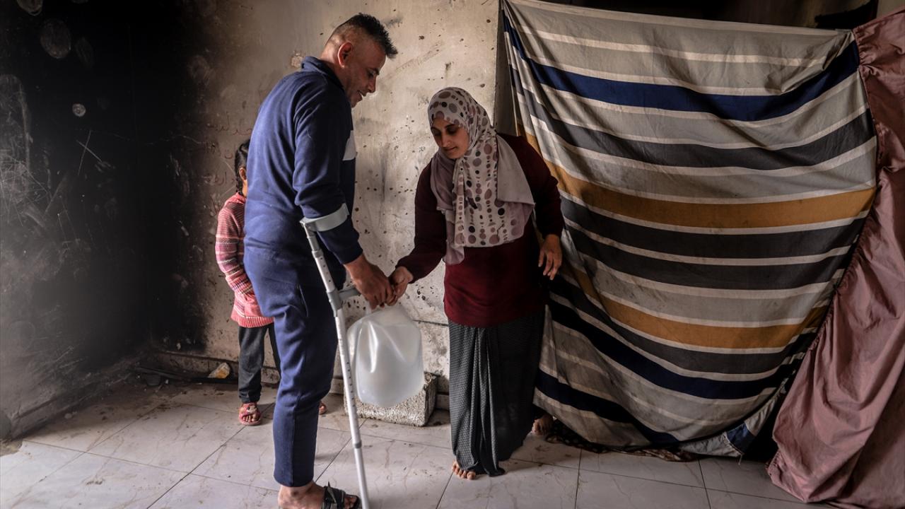 Dünya Engelliler Günü`nde Filistinli baba, bacağını kaybetmesi ve vücudunun çeşitli bölgelerine aldığı yaralar nedeniyle ailesinin geçimini sağlayamaz hale geldi.