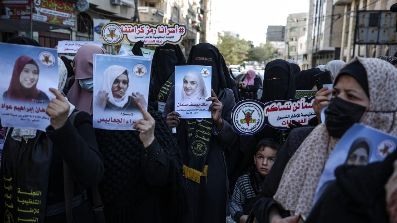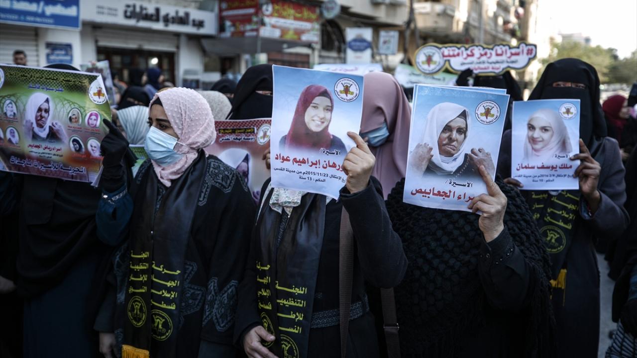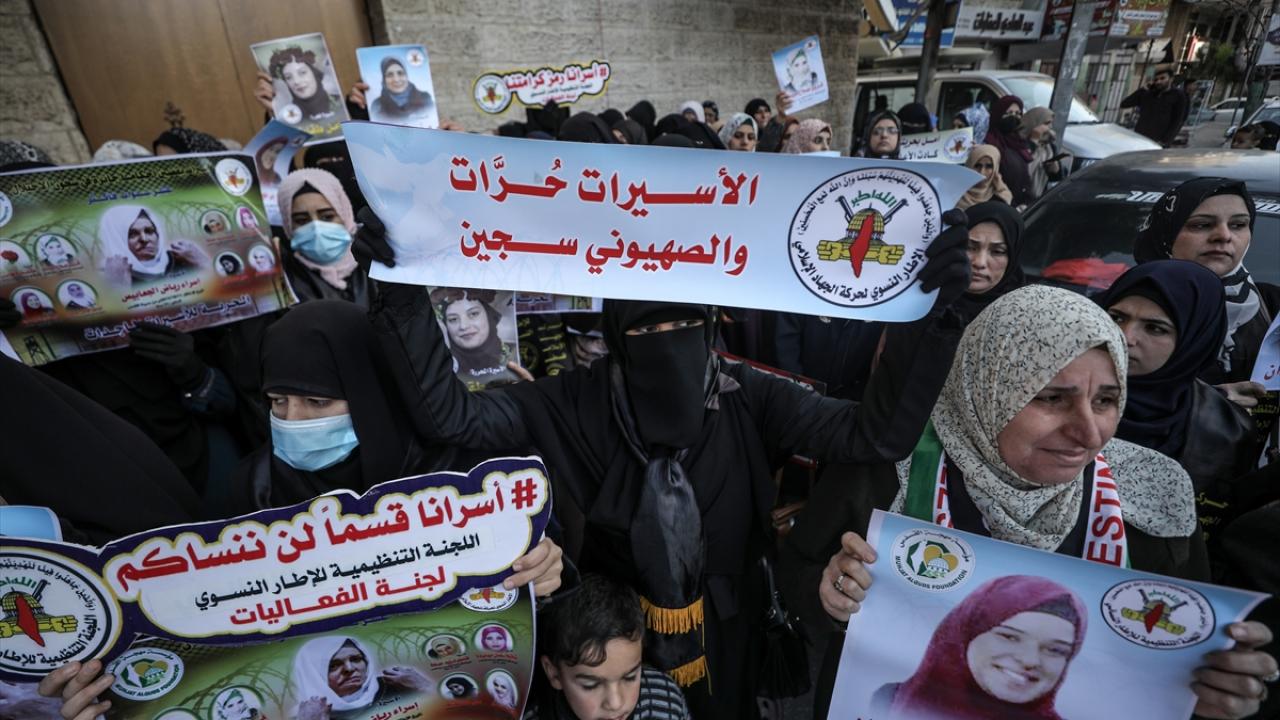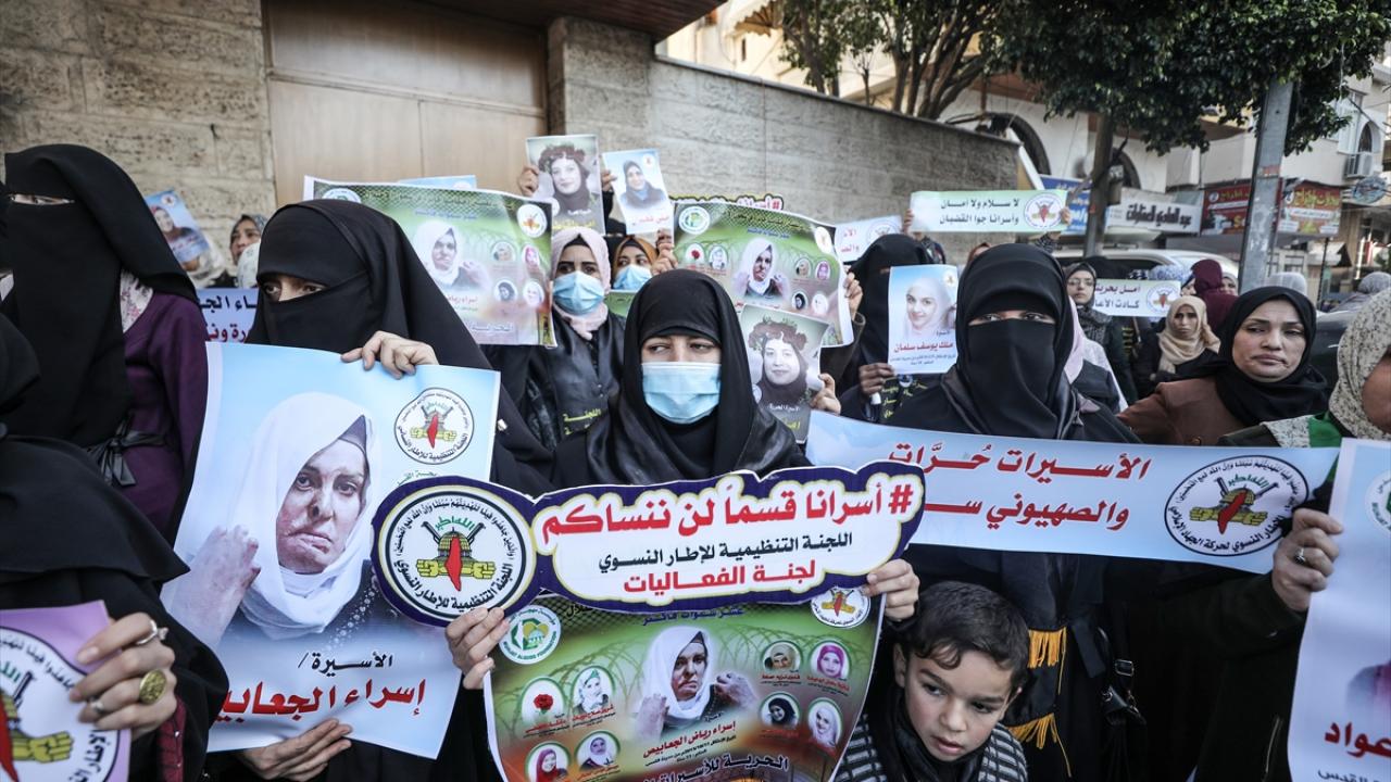 İsrail hapishanelerindeki Filistinli hemcinslerine destek ibarelerinin yer aldığı dövizler taşıyan kadınlar, dayanışma sloganları attı.