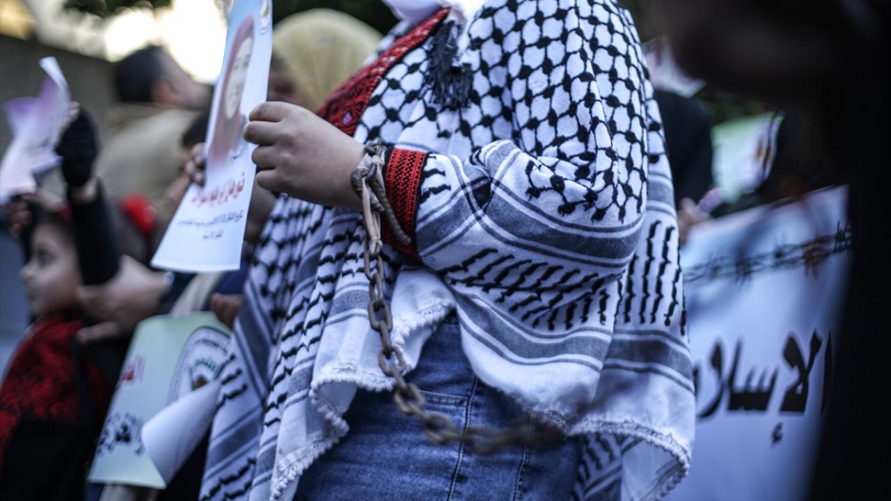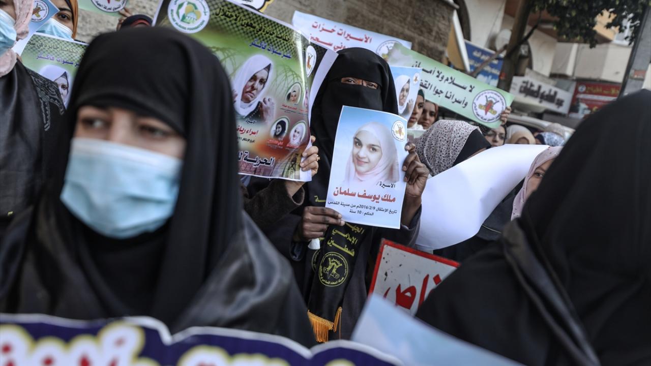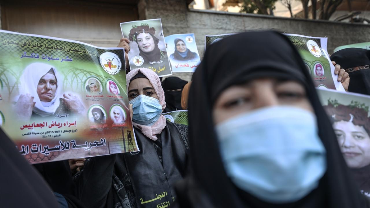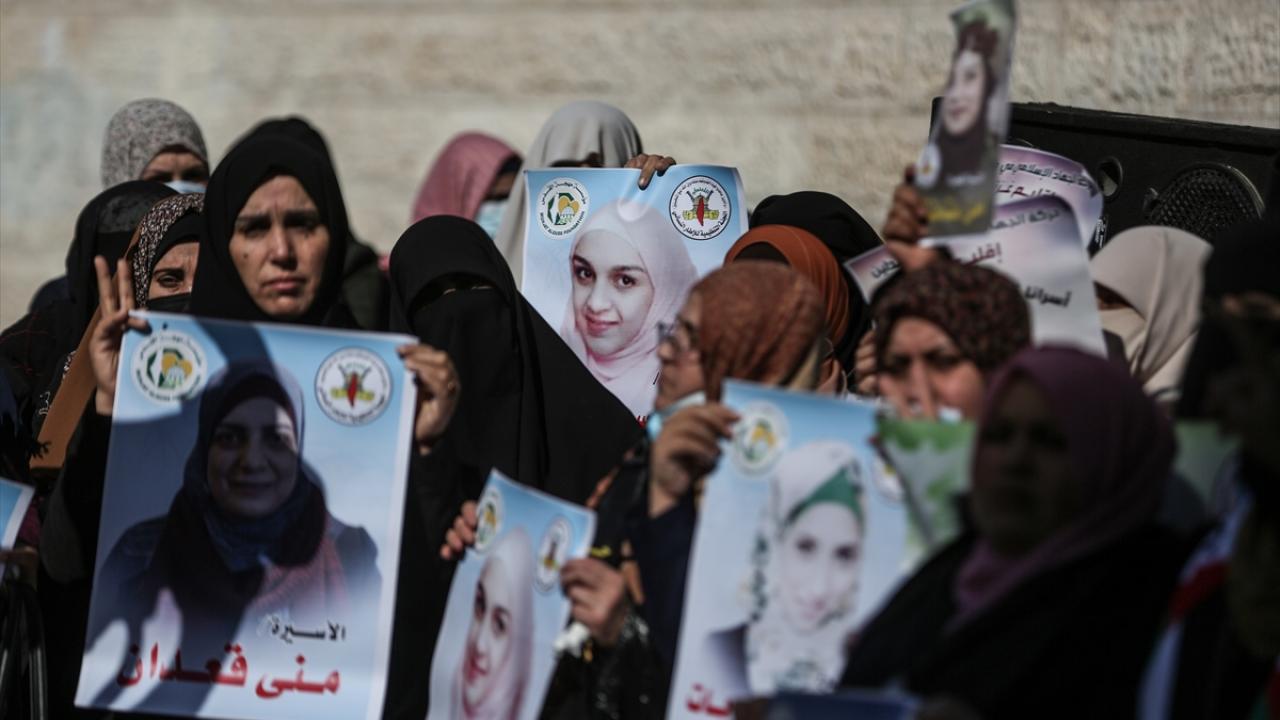 İsrail hapishanelerindeki Filistinli hemcinslerine destek ibarelerinin yer aldığı dövizler taşıyan kadınlar, dayanışma sloganları attı.