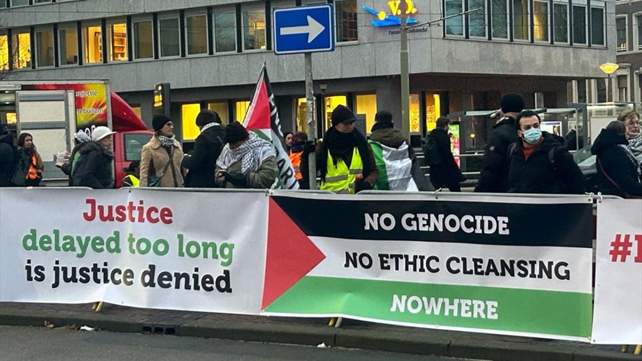 Duruşmayı takip eden Filistin destekçileri ve basın mensupları ICJ önünde bekleyişini sürdürüyor.