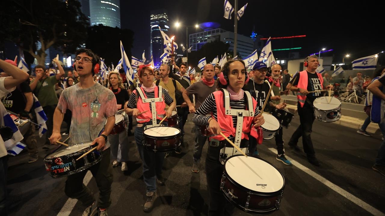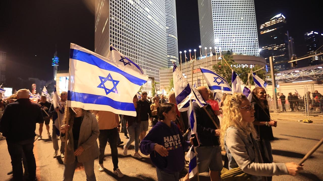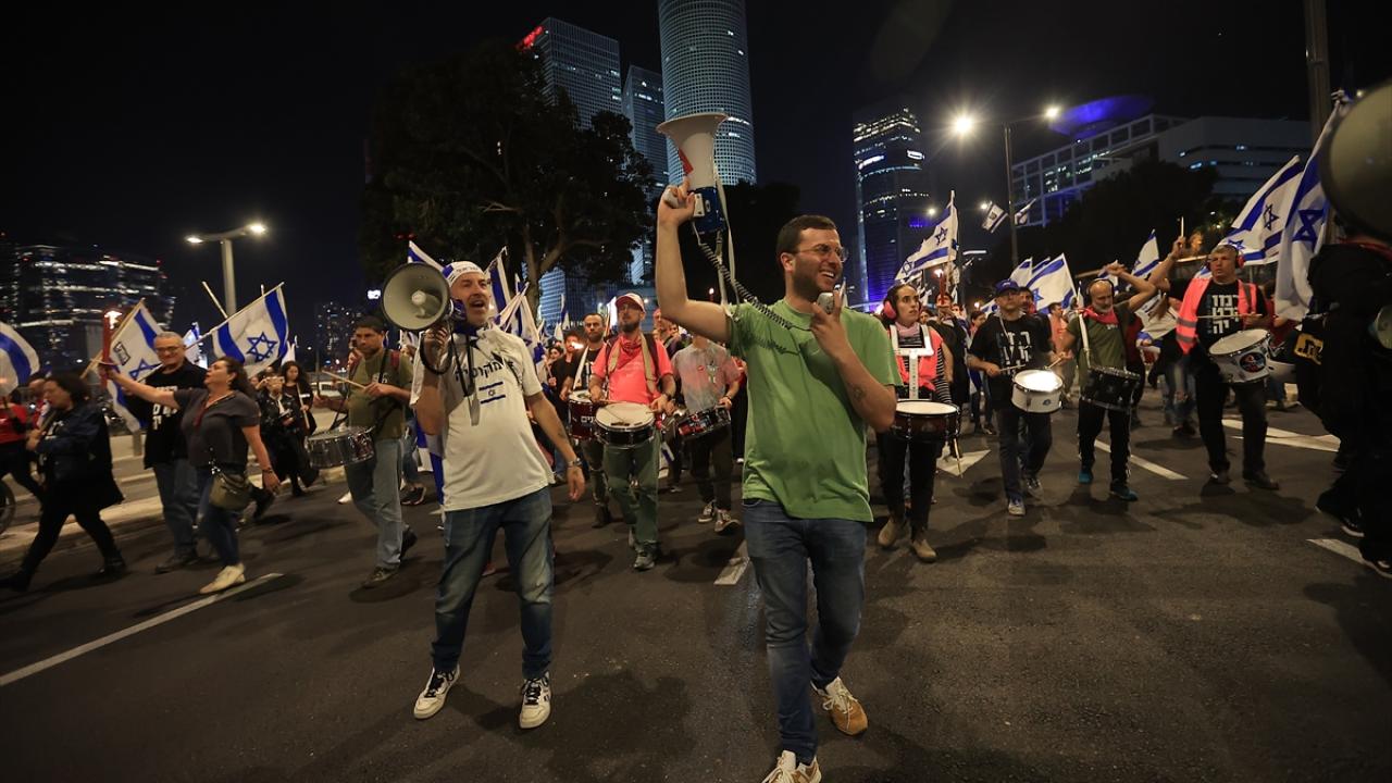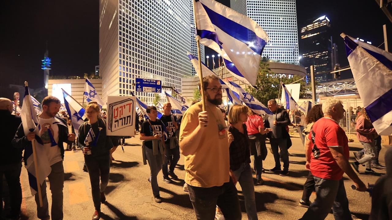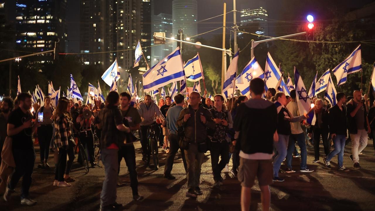 İsrail'de Binyamin Netanyahu hükümetinin tartışmalı yargı düzenlemesine karşı gösteriler sürüyor. Başkent Tel Aviv'deki Kaplan caddesinde toplanan çok sayıda protestocu, Netanyahu'nun düzenlemeleri ertelediğini duyurmasına rağmen gösteri düzenledi.