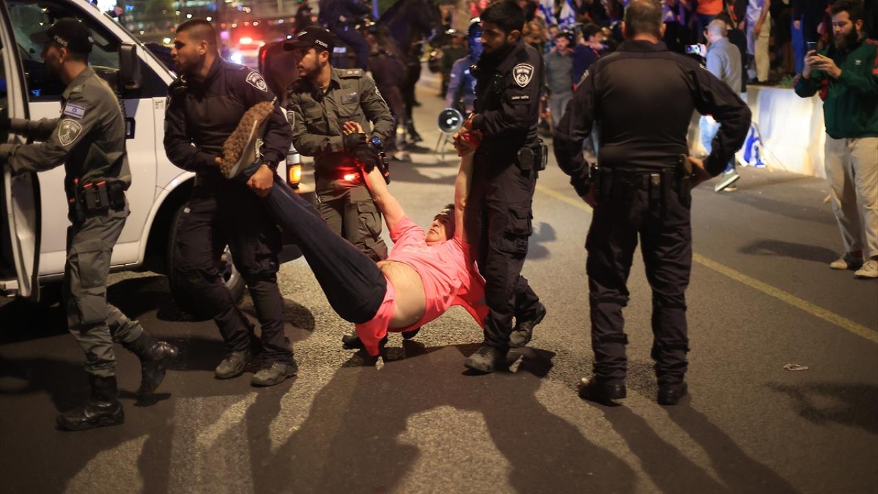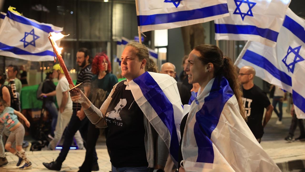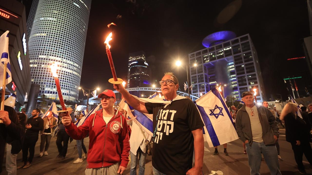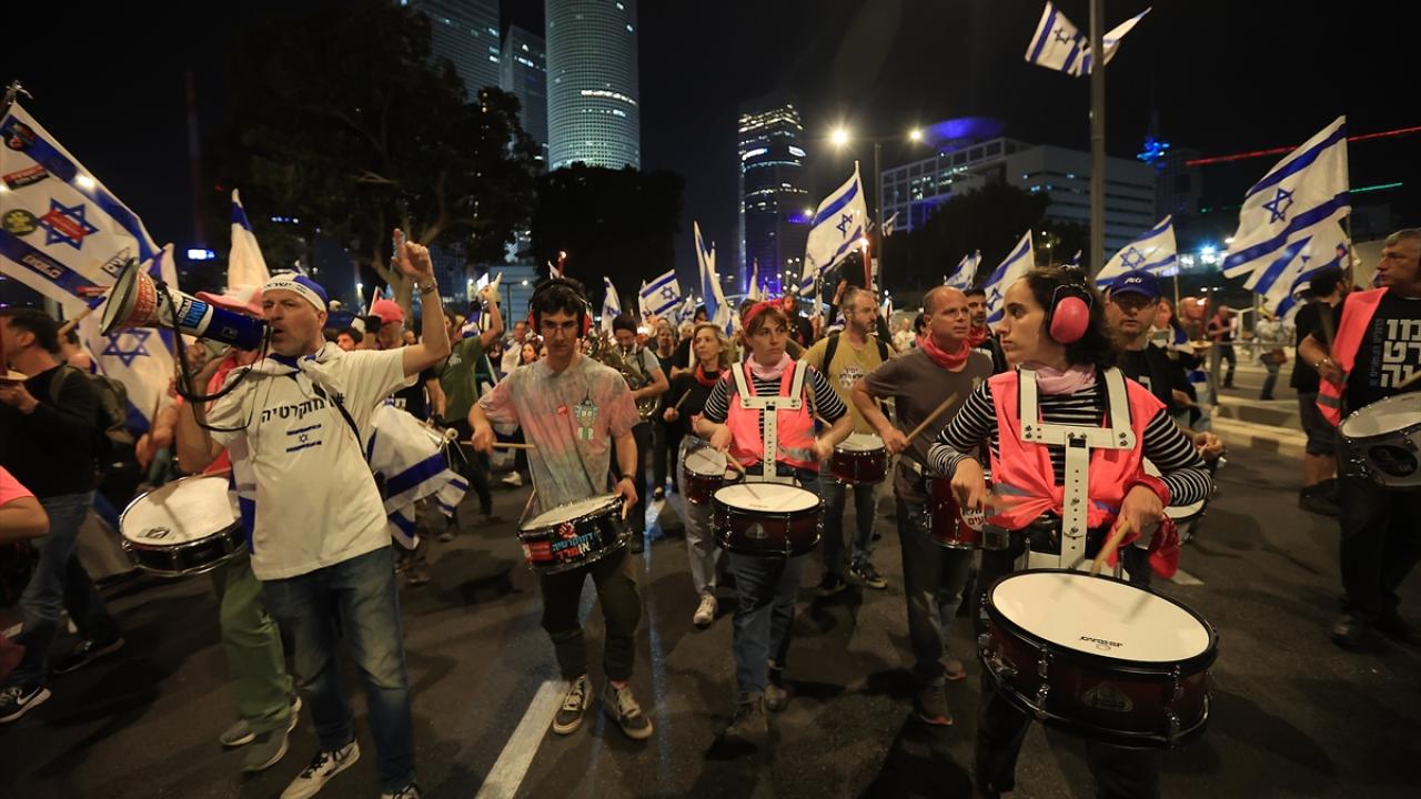 İsrail'de Binyamin Netanyahu hükümetinin tartışmalı yargı düzenlemesine karşı gösteriler sürüyor. Başkent Tel Aviv'deki Kaplan caddesinde toplanan çok sayıda protestocu, Netanyahu'nun düzenlemeleri ertelediğini duyurmasına rağmen gösteri düzenledi.
