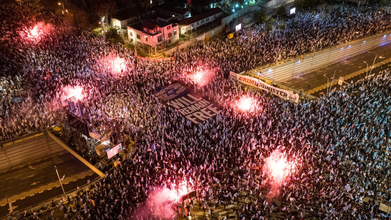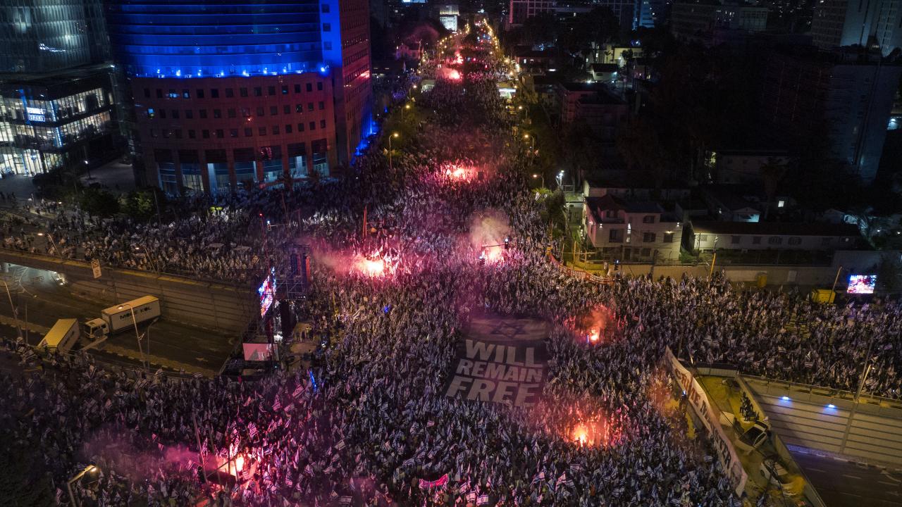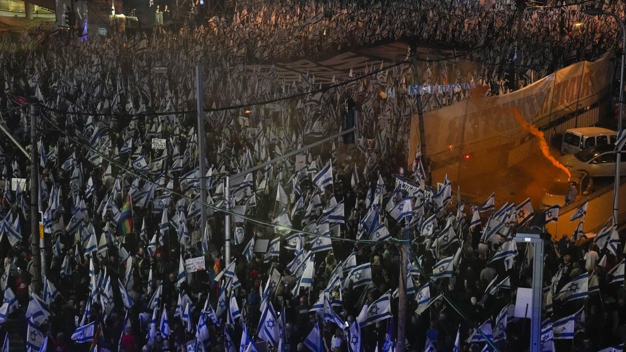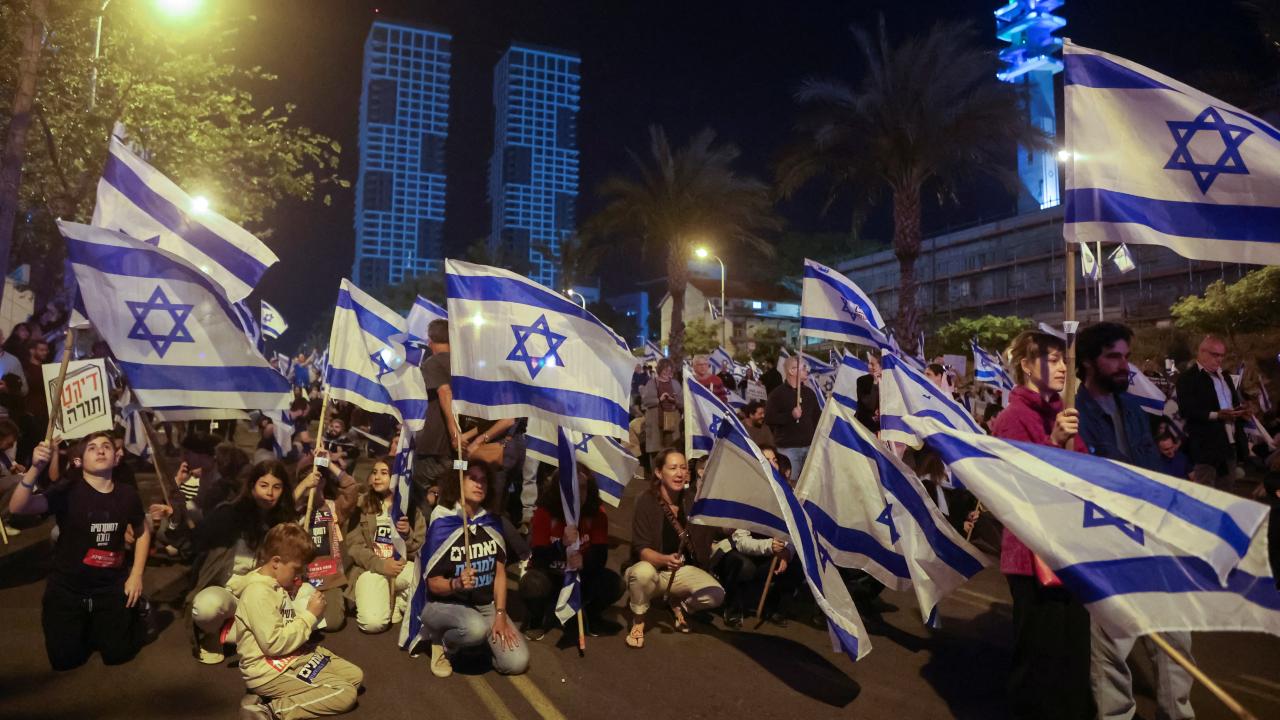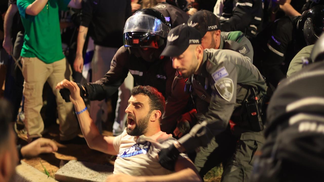 İsrail'de Binyamin Netanyahu hükümetinin tartışmalı yargı düzenlemesine karşı gösteriler sürüyor. Başkent Tel Aviv'deki Kaplan caddesinde toplanan çok sayıda protestocu, Netanyahu'nun düzenlemeleri ertelediğini duyurmasına rağmen gösteri düzenledi.