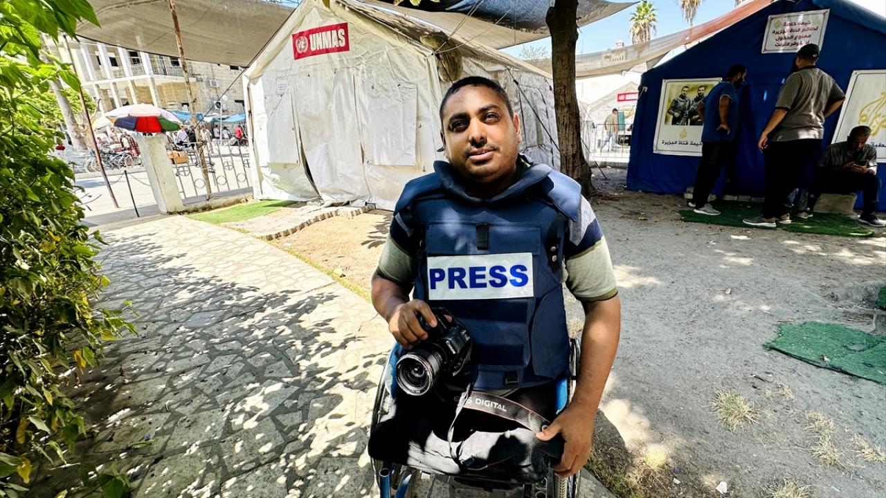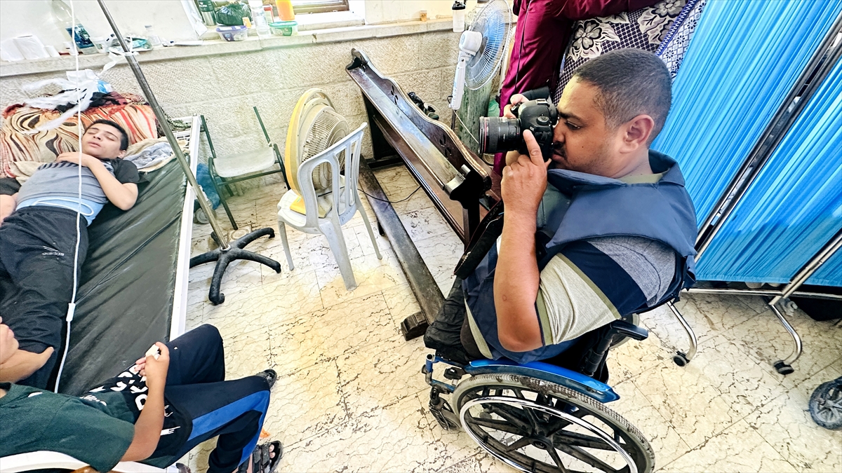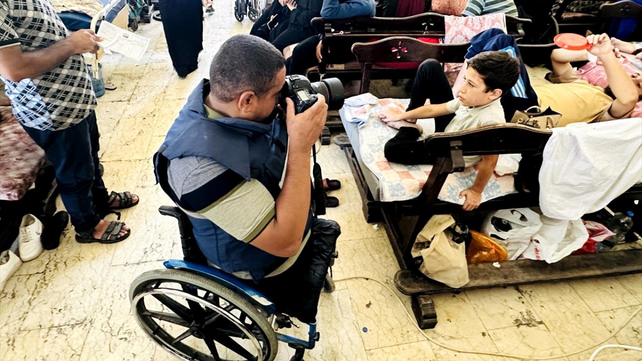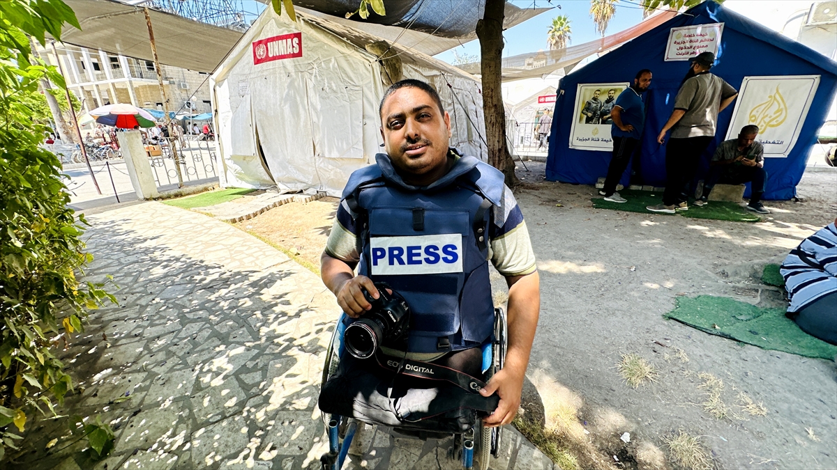 İsrail'in, Gazze Şeridi'ne 2008'de düzenlediği saldırılarda iki ayağını kaybeden Filistinli gazeteci Mumin Fayiz Kureyki, İsrail'in Gazze'ye yönelik saldırılarını aktarmayı sürdürüyor.