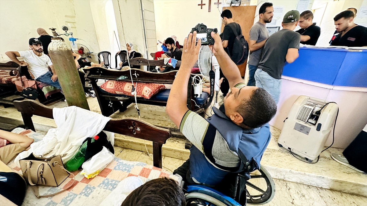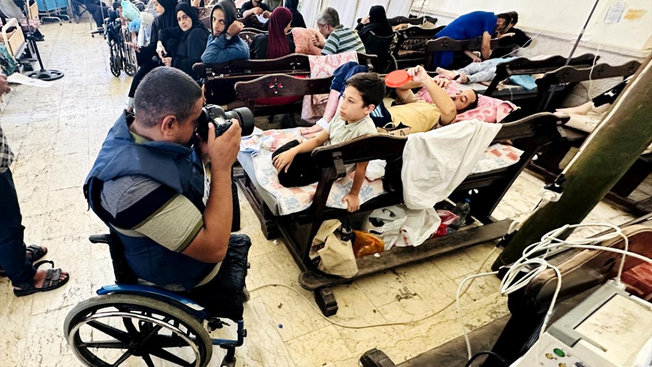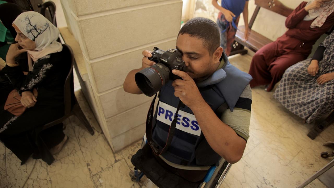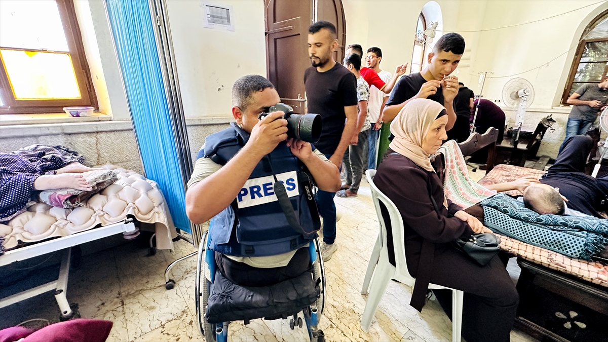 İsrail'in, Gazze Şeridi'ne 2008'de düzenlediği saldırılarda iki ayağını kaybeden Filistinli gazeteci Mumin Fayiz Kureyki, İsrail'in Gazze'ye yönelik saldırılarını aktarmayı sürdürüyor.