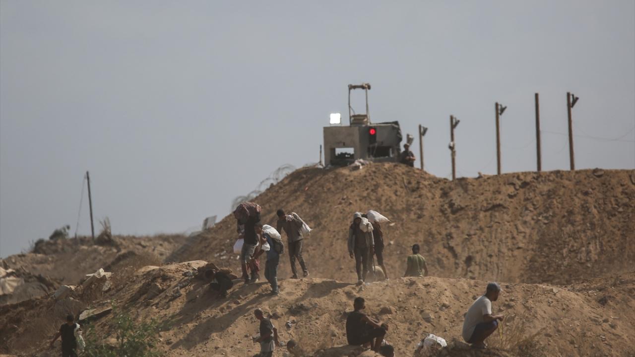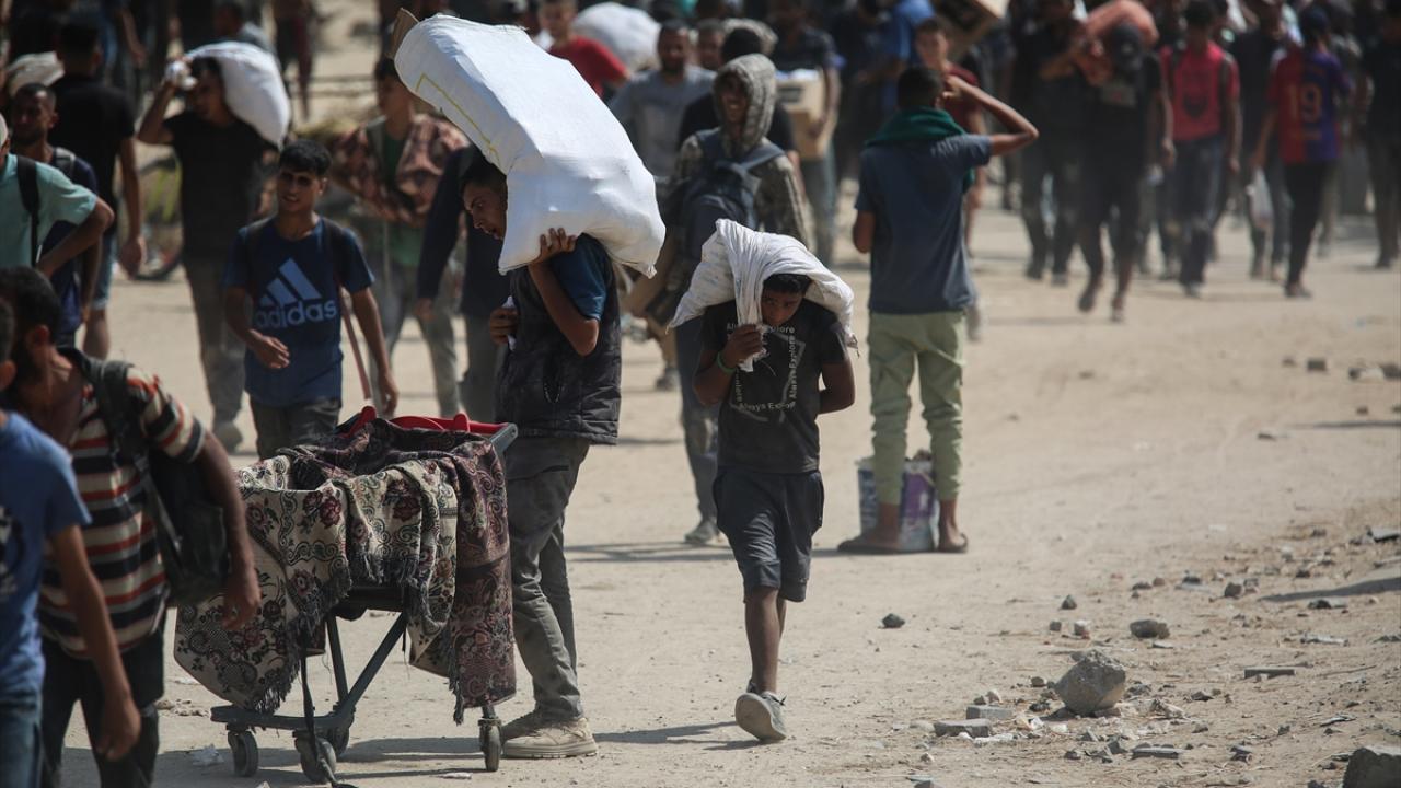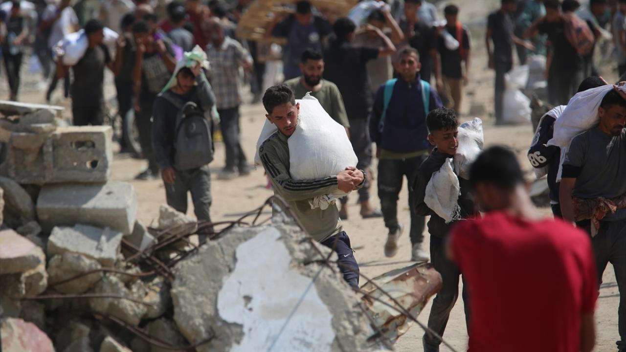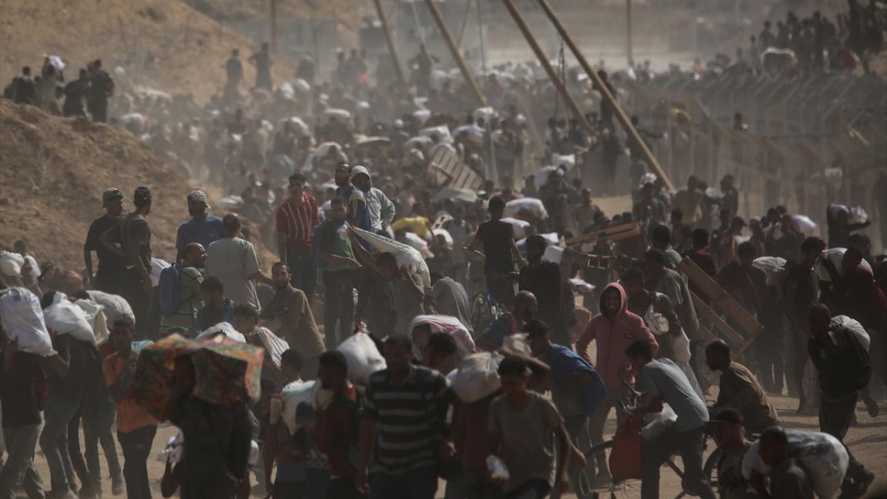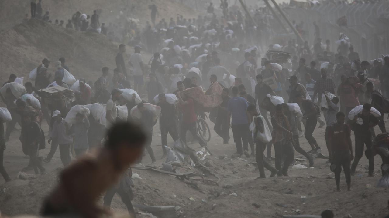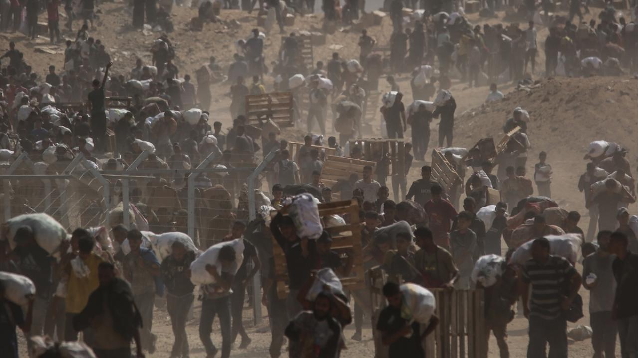 İsrail ordusunun acımasız saldırıları ve ambargosu altındaki Gazze Şeridi'nde açlığa mahkum ettiği Filistinliler, kısıtlı miktarda dağıtılan gıda malzemelerinden alabilmek için Netzarim Koridoruna akın etti.