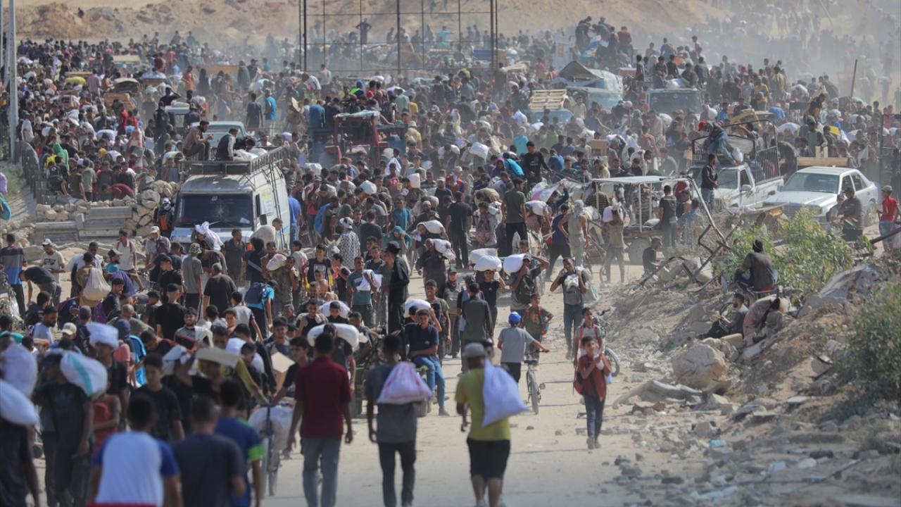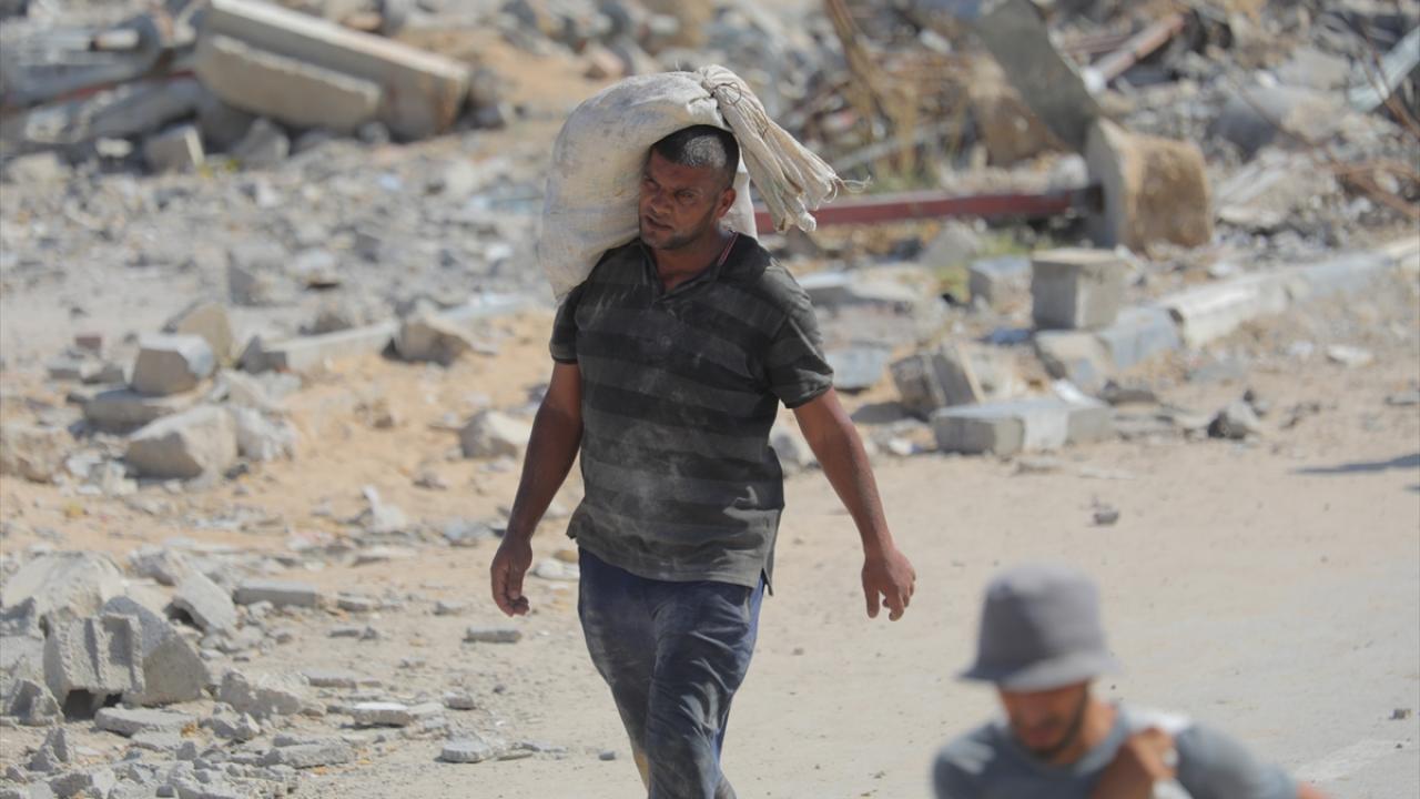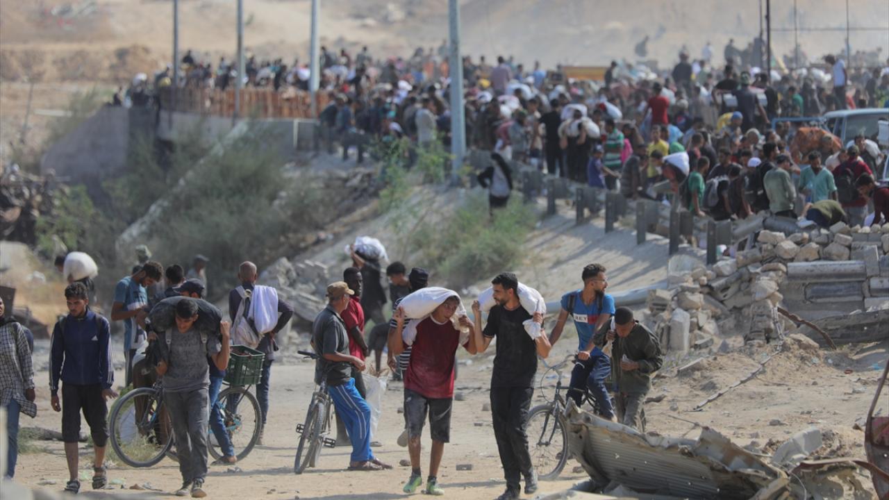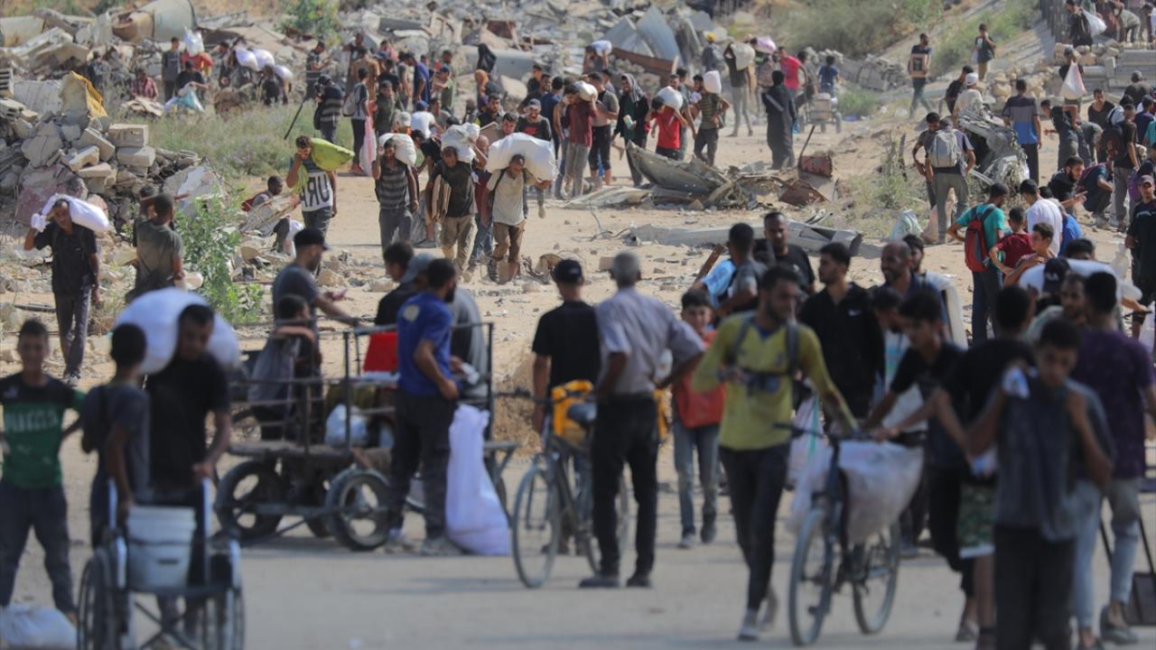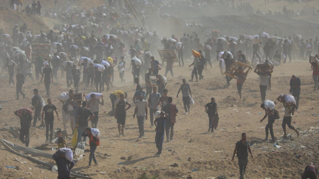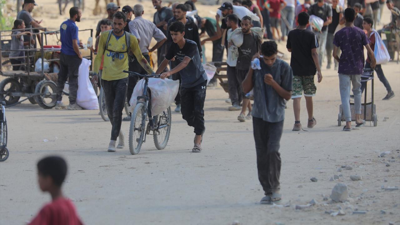 İsrail ordusunun acımasız saldırıları ve ağır ablukası altındaki Gazze Şeridi’nde, açlıkla mücadele eden yerinden edilmiş Filistinliler, kısıtlı miktarda dağıtılan insani yardımlardan alabilmek için Netzarim Koridoru’nda kurulan yardım noktasına akın etti.