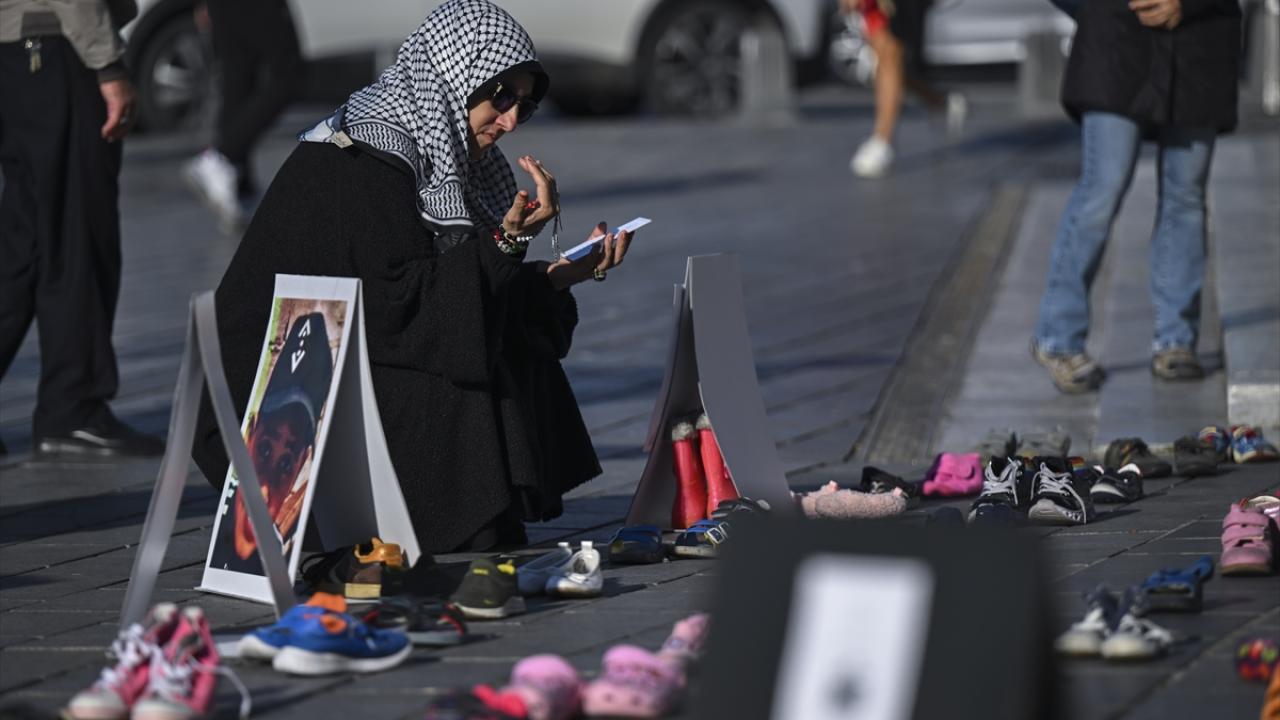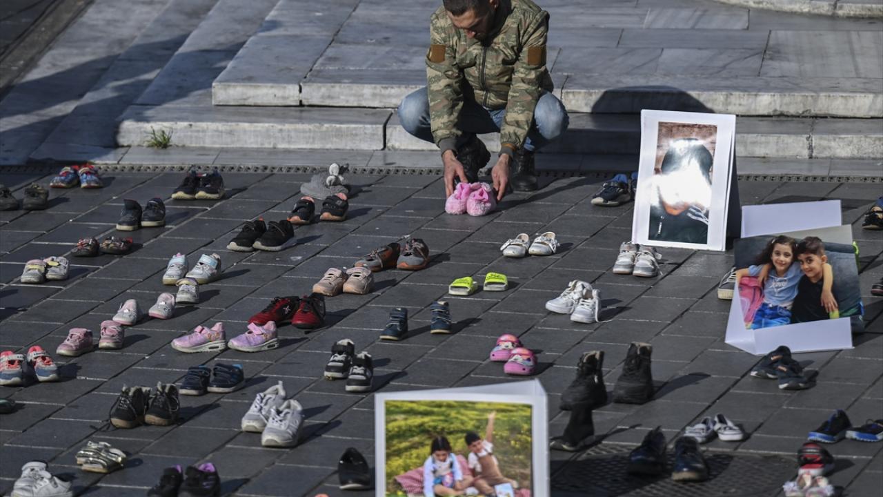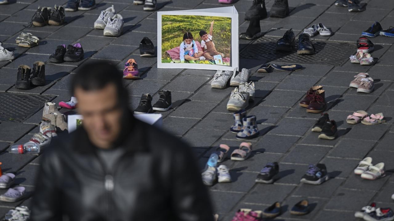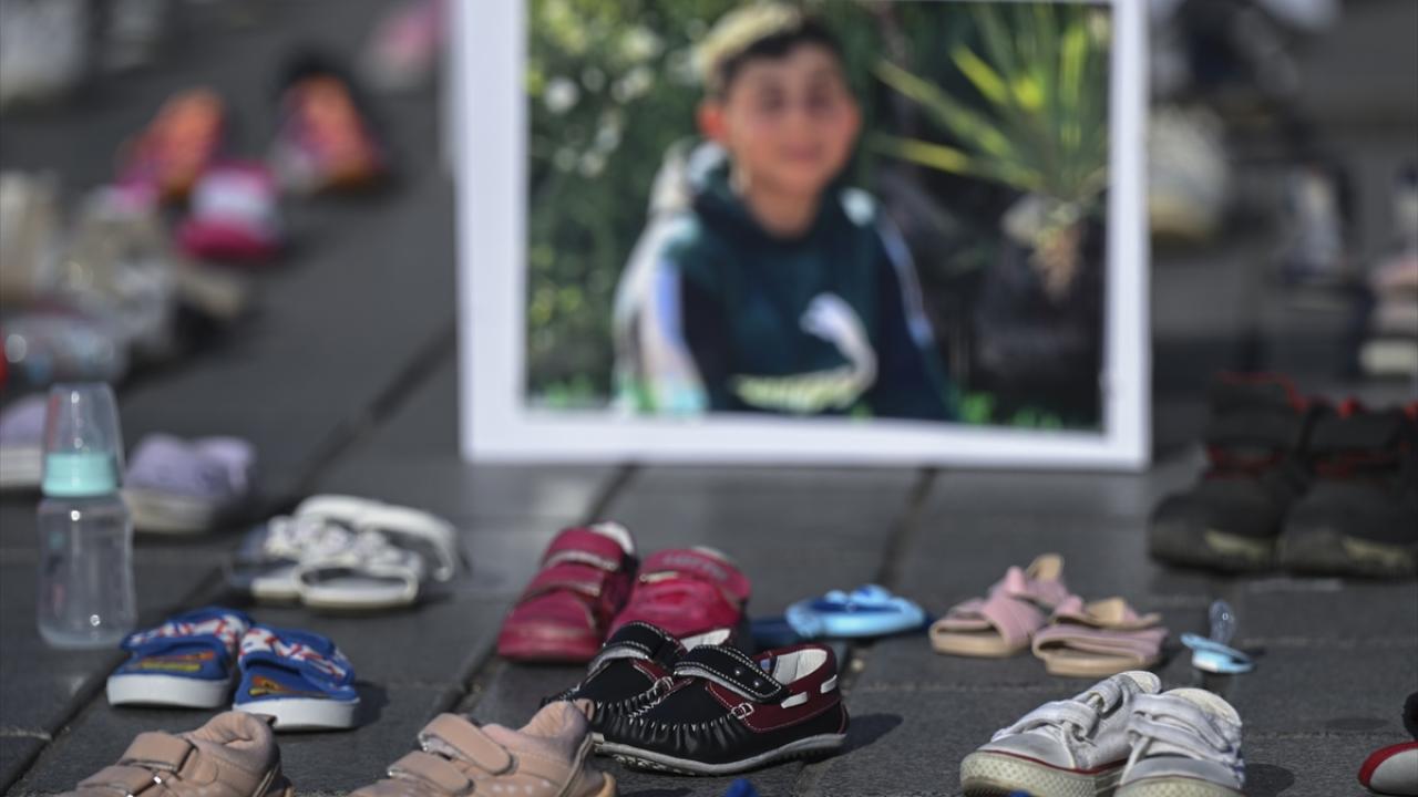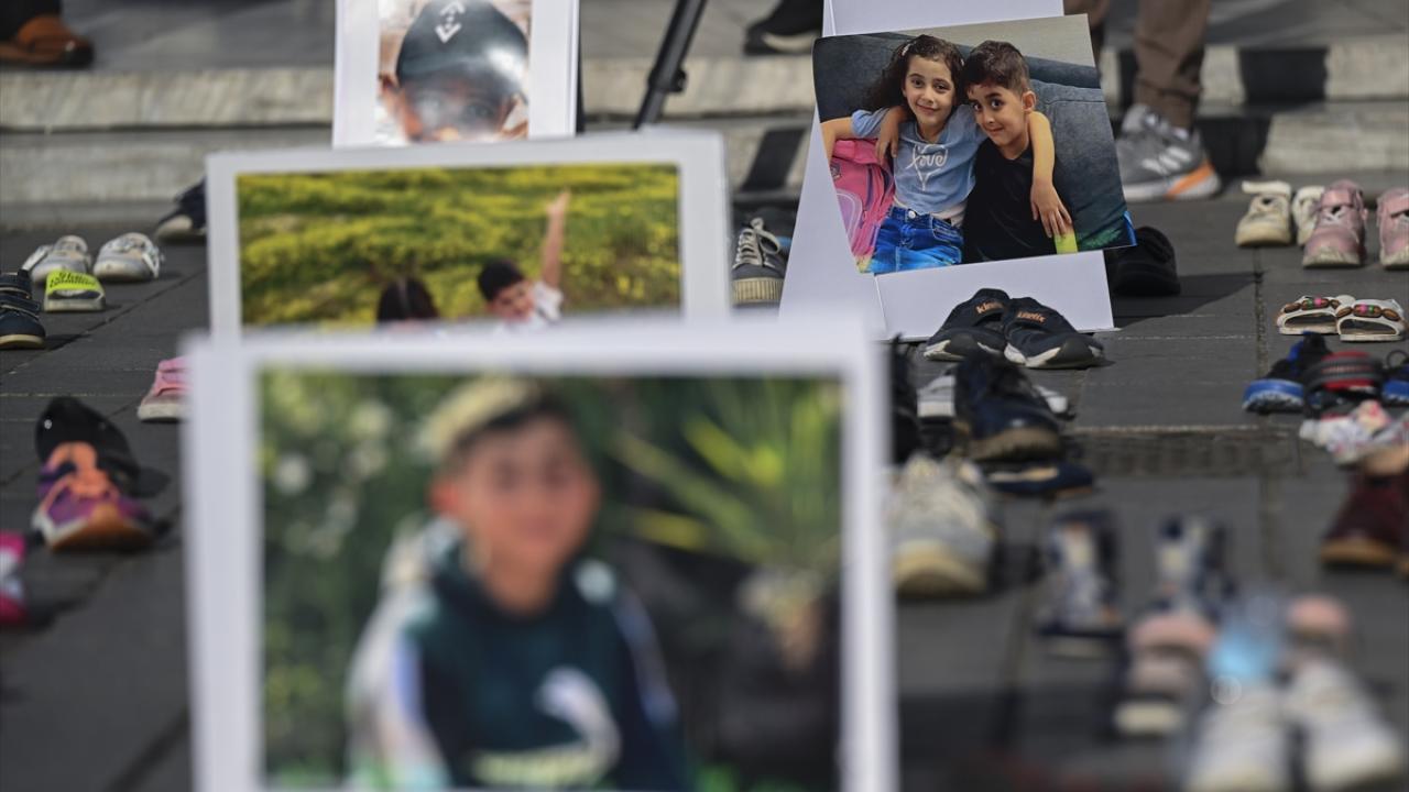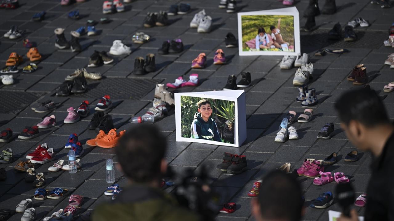 Ayakkabıların yanına, İsrail`in Gazze`ye yönelik saldırıları sonucu hayatlarını kaybeden çocuklardan bazılarının fotoğrafları ile "İsrail her saatte 5 çocuğu öldürüyor" yazılı döviz konuldu.