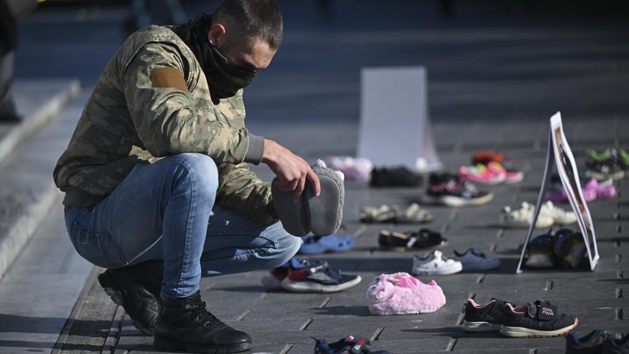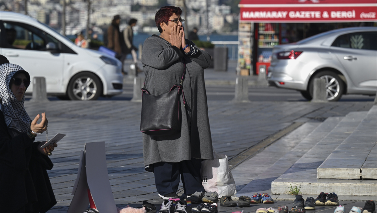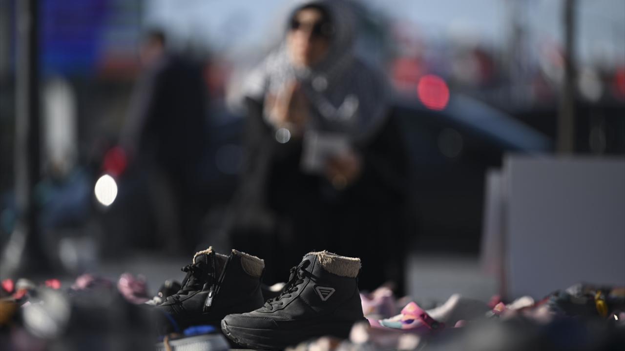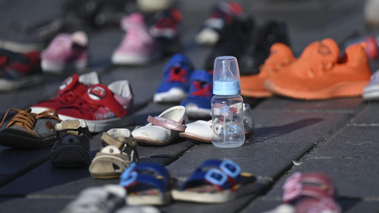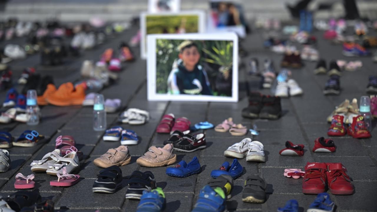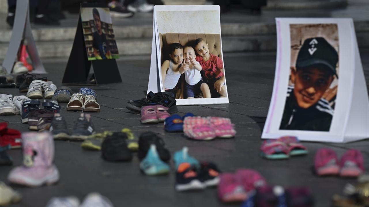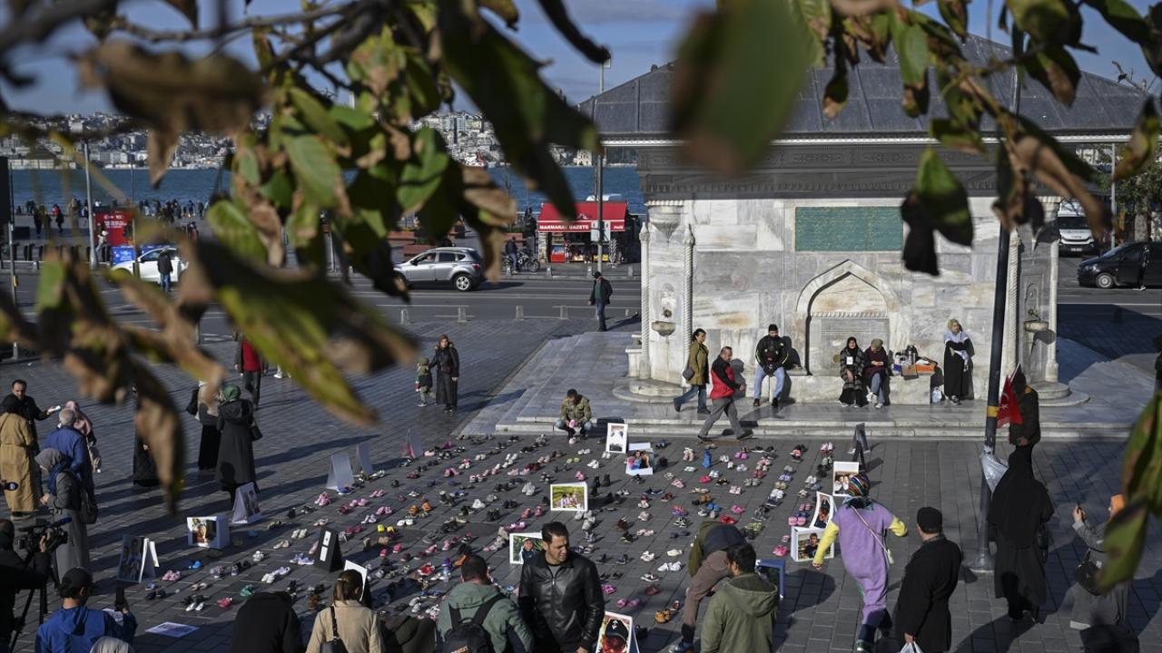 Ayakkabıların yanına, İsrail`in Gazze`ye yönelik saldırıları sonucu hayatlarını kaybeden çocuklardan bazılarının fotoğrafları ile "İsrail her saatte 5 çocuğu öldürüyor" yazılı döviz konuldu.
