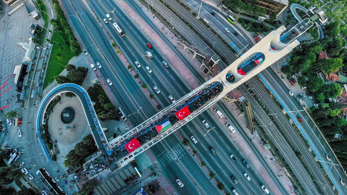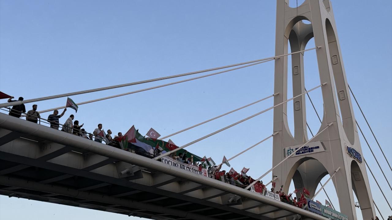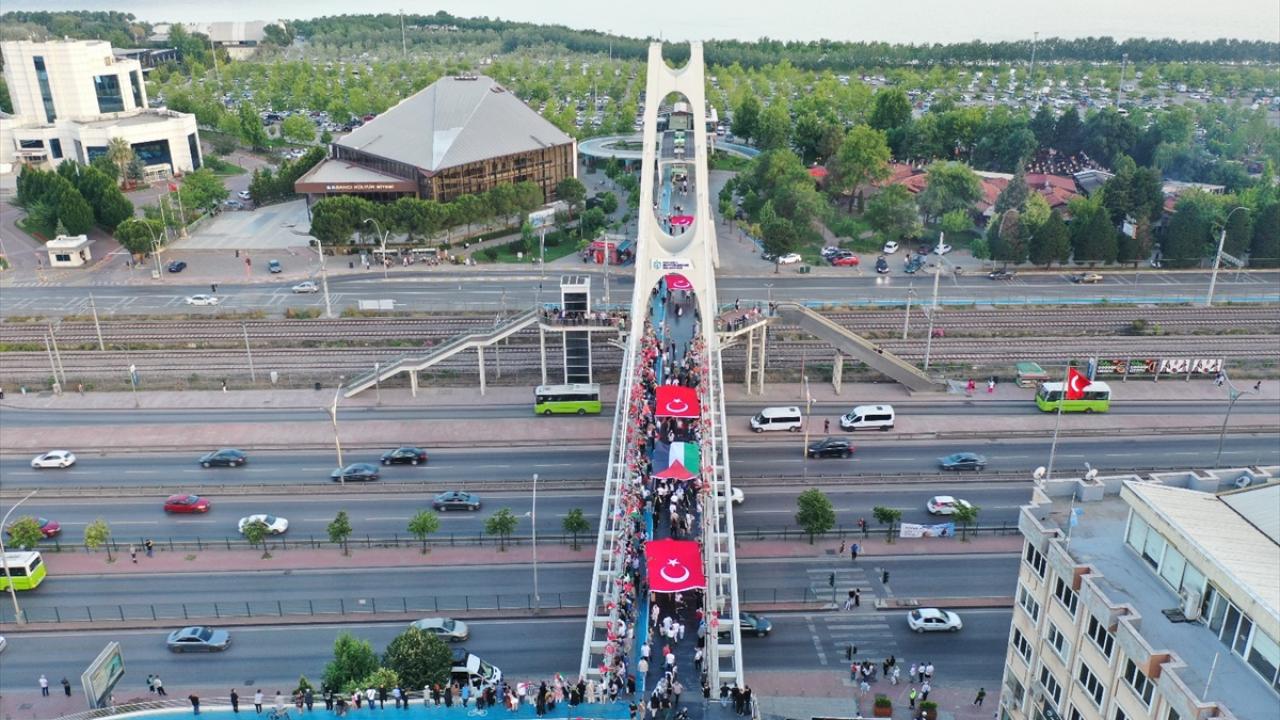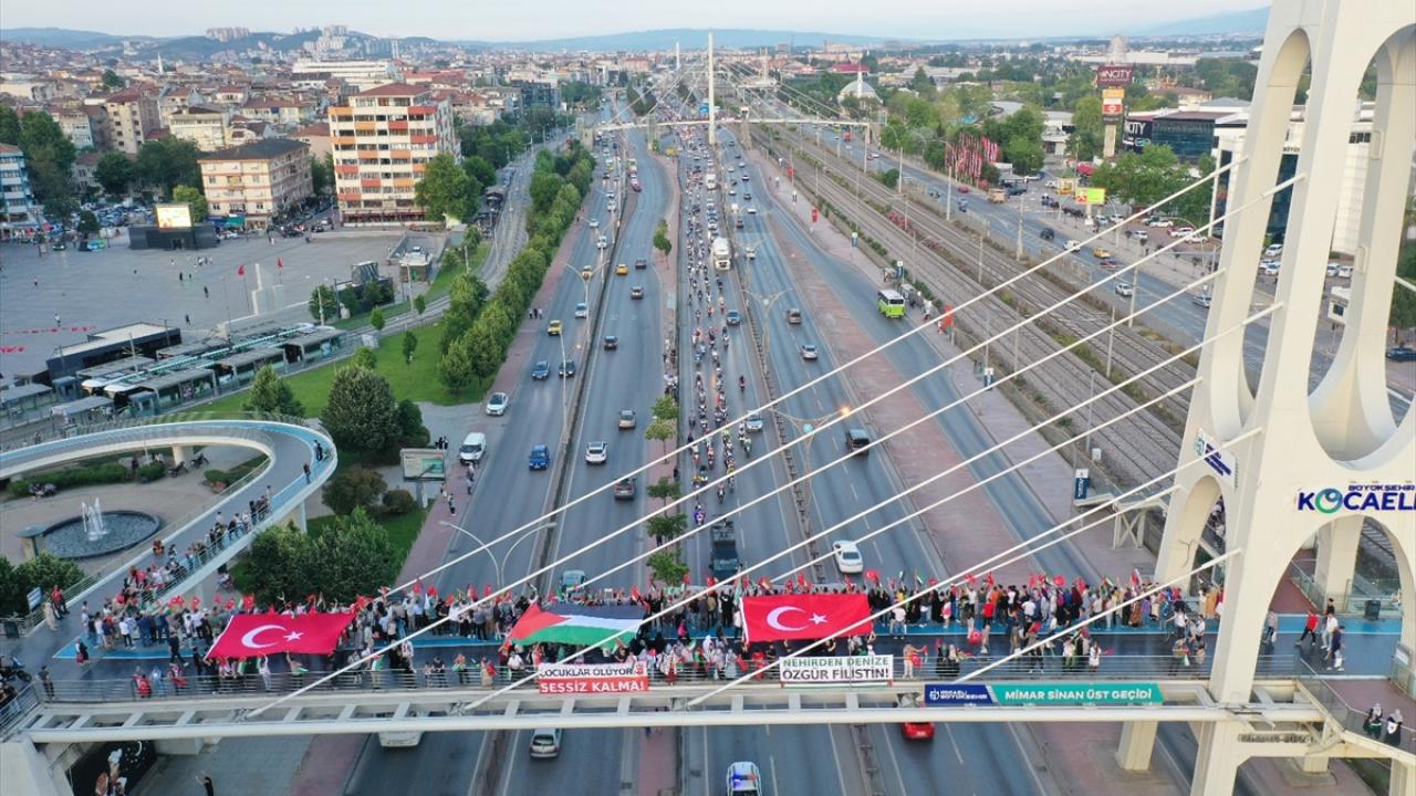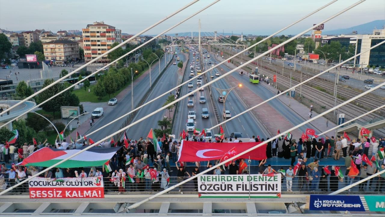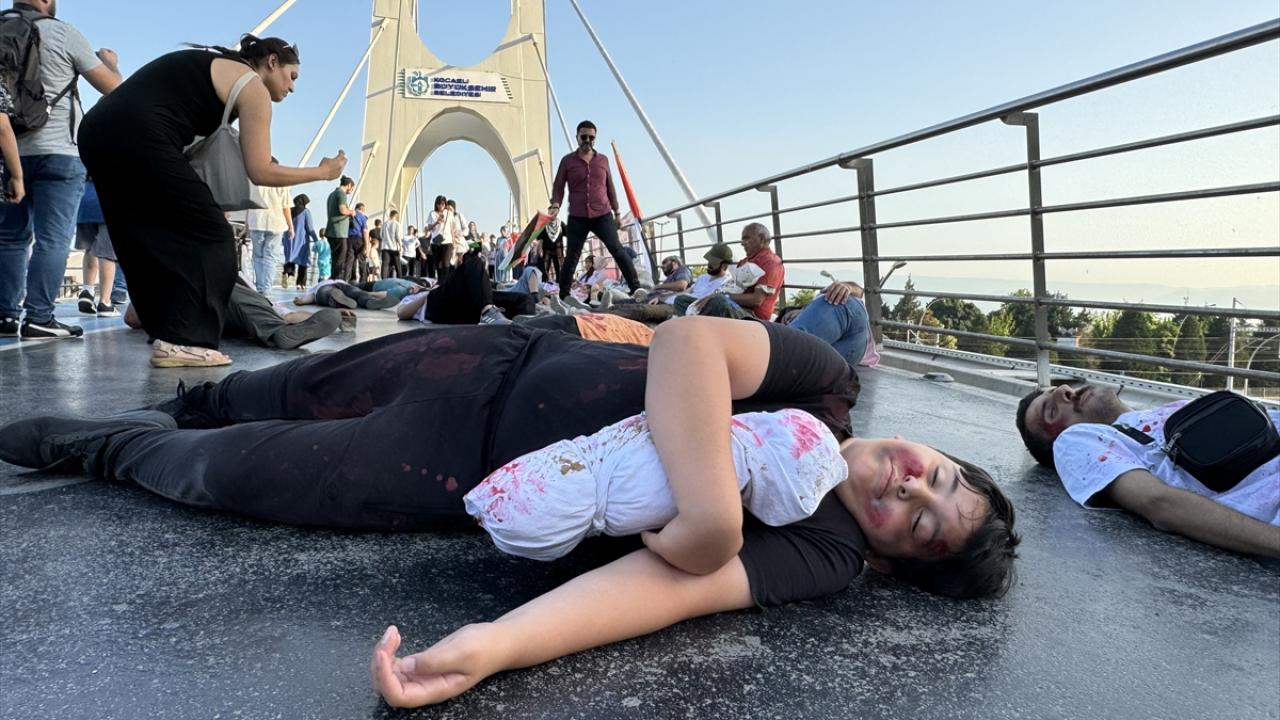 "Kocaeli Filistin İçin Ayakta" sloganıyla şehir merkezindeki Mimar Sinan, Turgut Özal, Necmettin Erbakan ve Adnan Menderes üst geçitlerinde buluşan 200`ü aşkın sivil toplum kuruluşu (STK) temsilcisi, köprülere İsrail`i kınayan pankartlar astı.