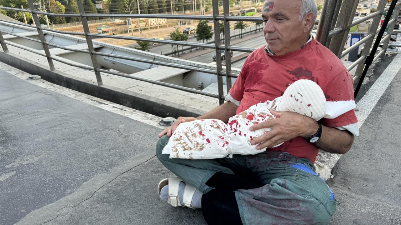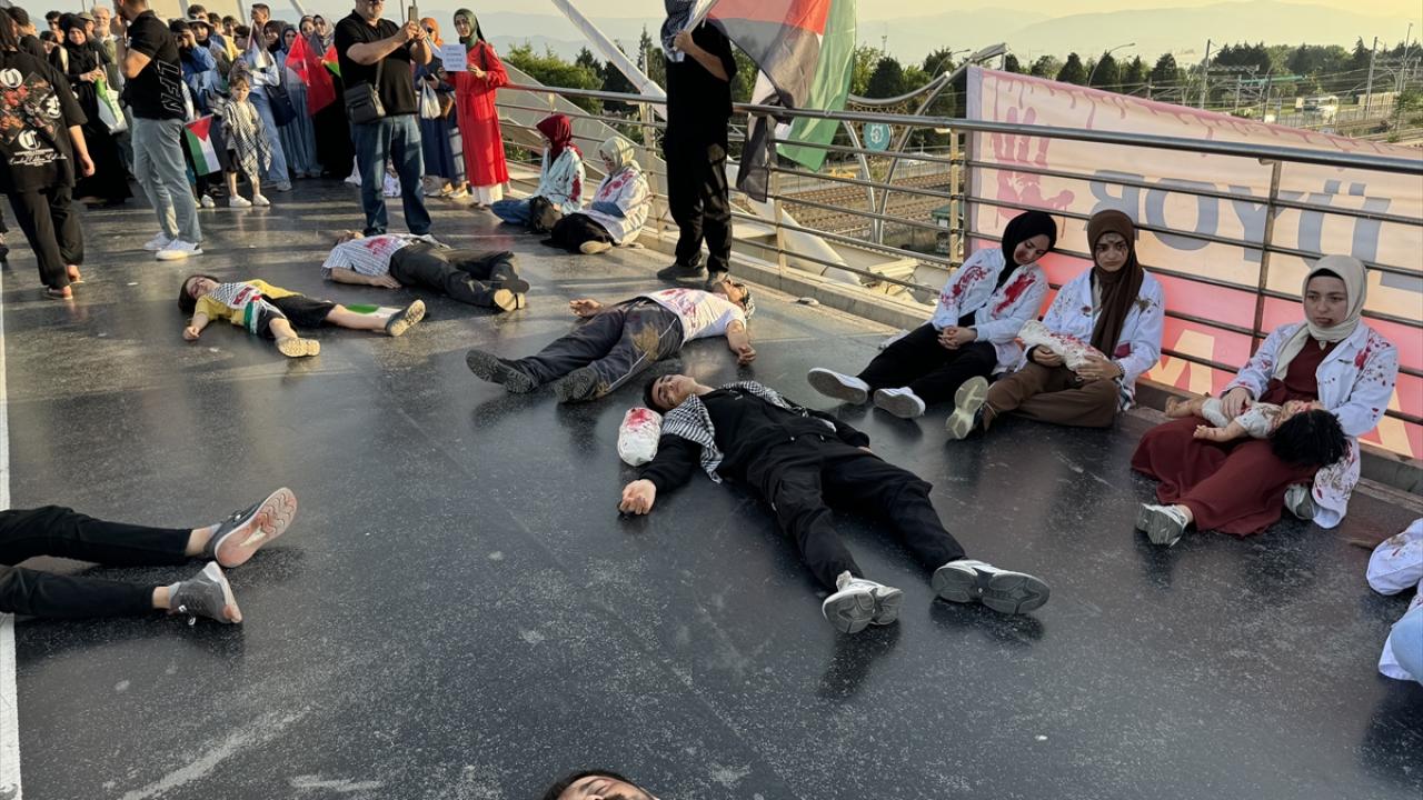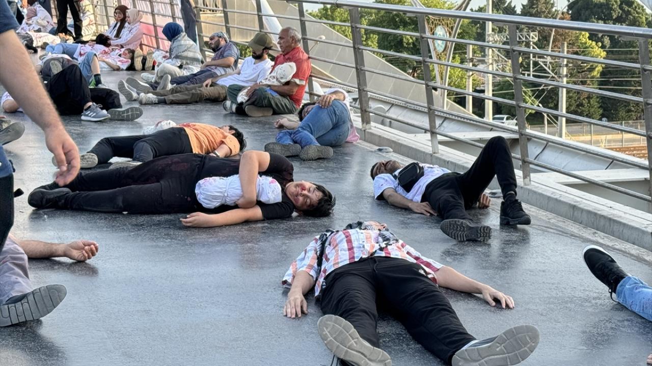 Filistin`deki insanlık dramını yansıtan kostümler giyen STK üyeleri, Mimar Sinan üst geçidinde bir süre yere yatarak vatandaşların dikkatini çekmeye çalıştı.