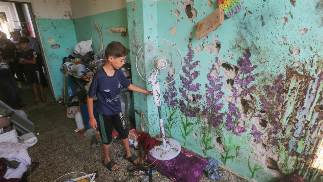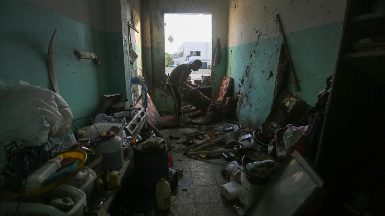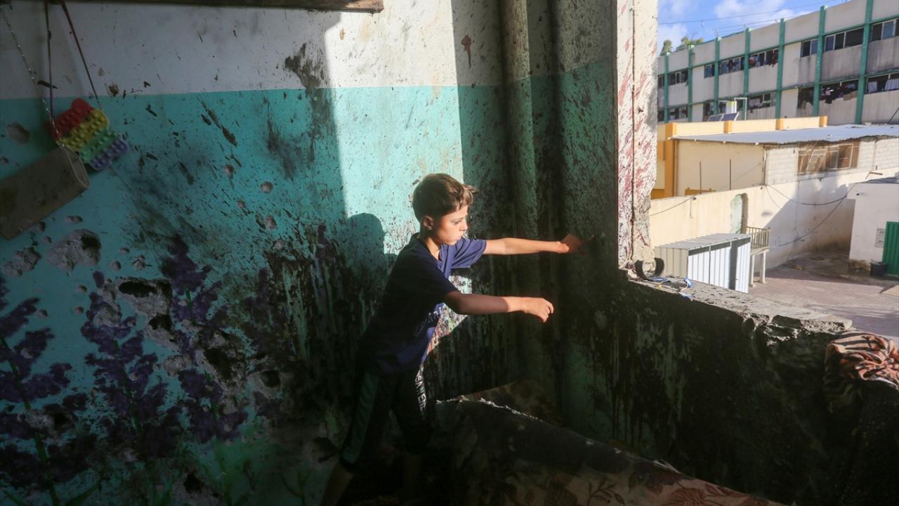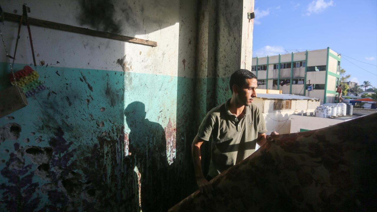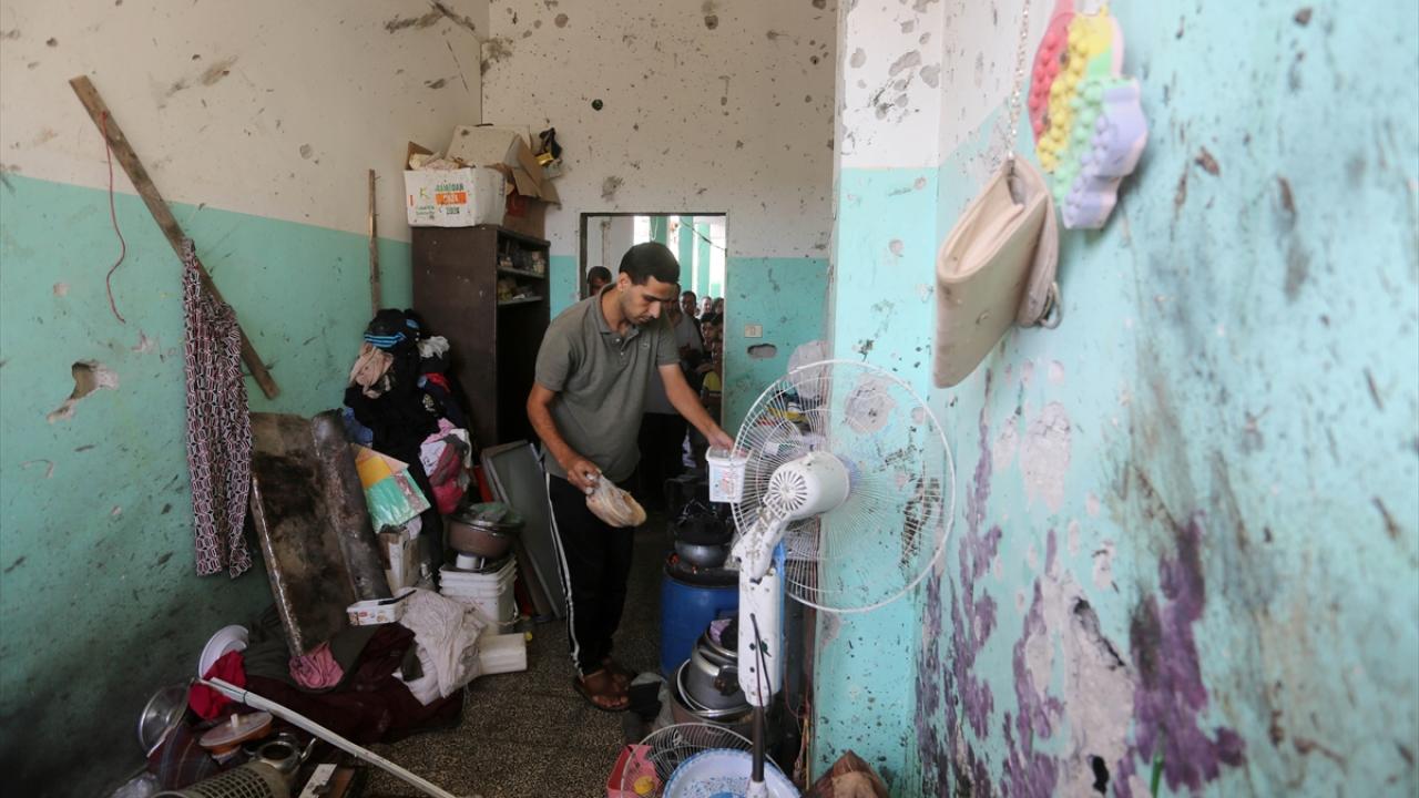 Okula sığınan Filistinliler, saldırı sonucu oluşan hasarı inceledi.