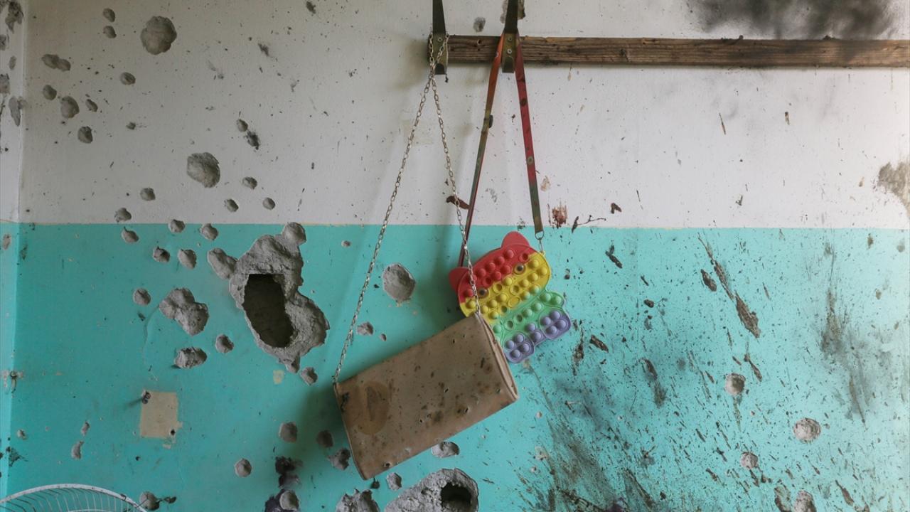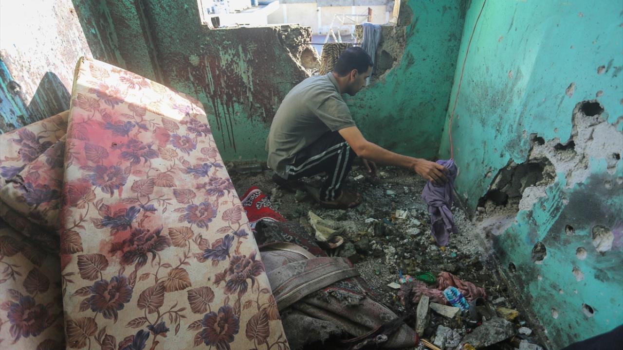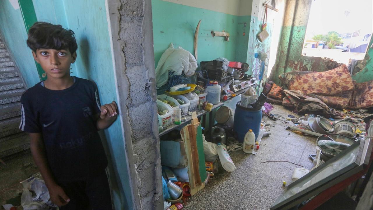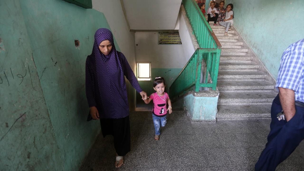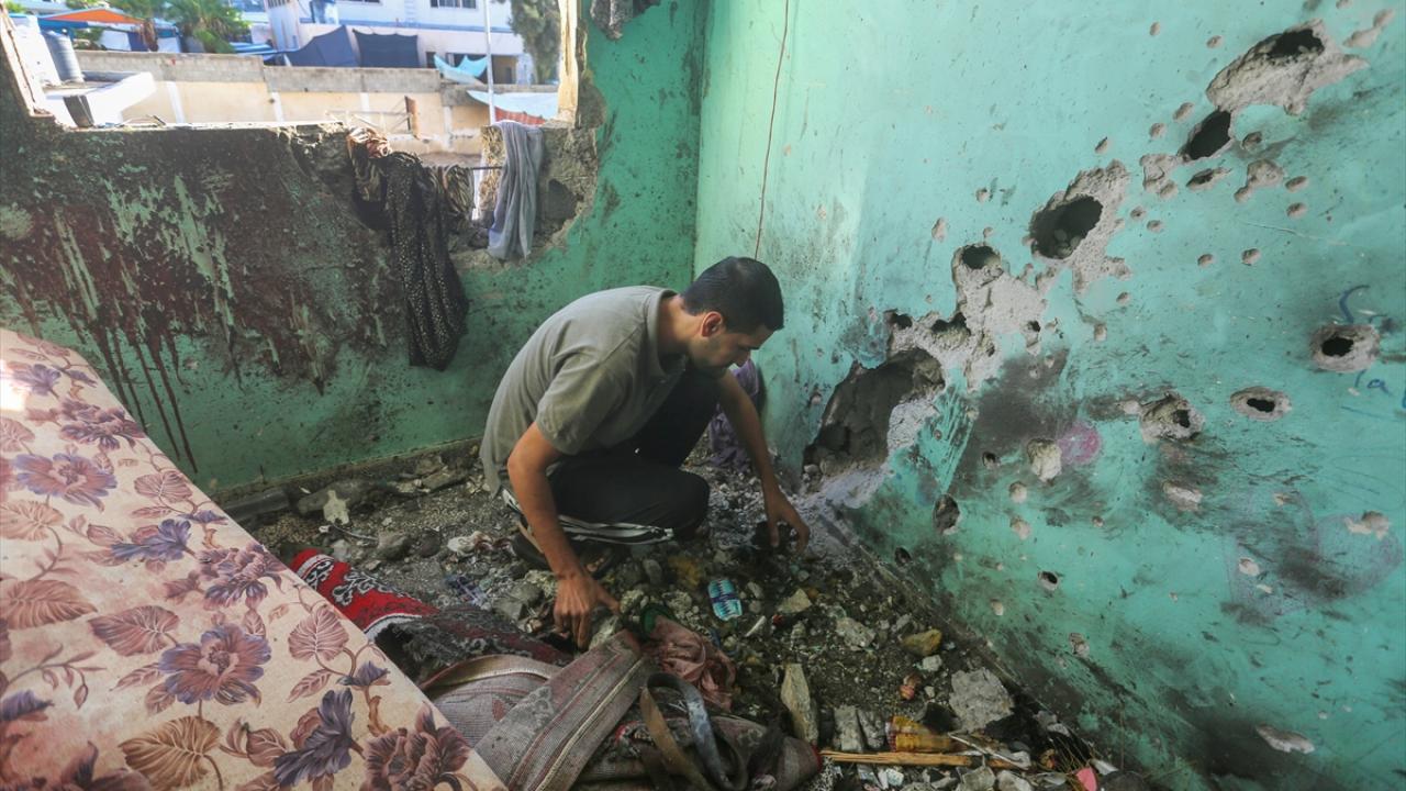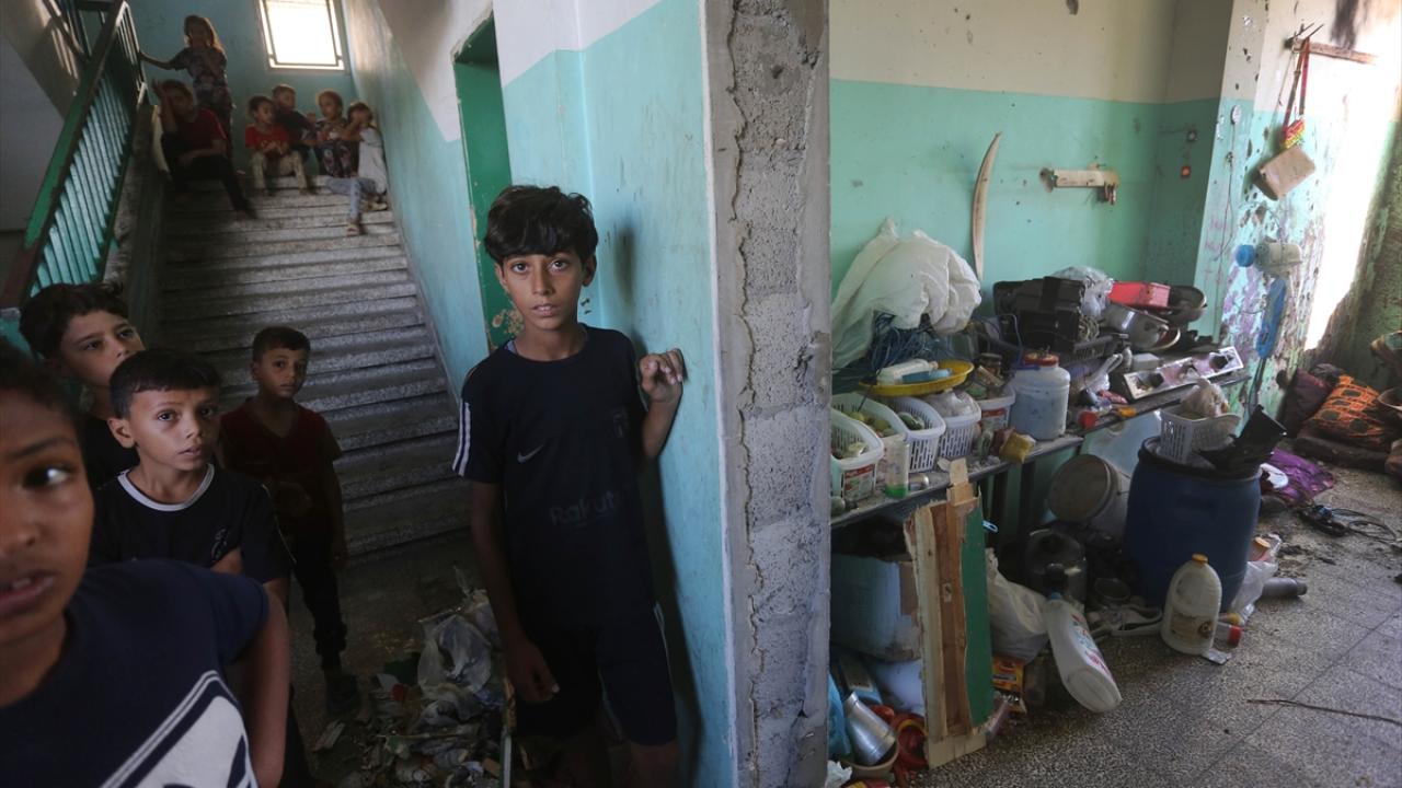 Okula sığınan Filistinliler, saldırı sonucu oluşan hasarı inceledi.