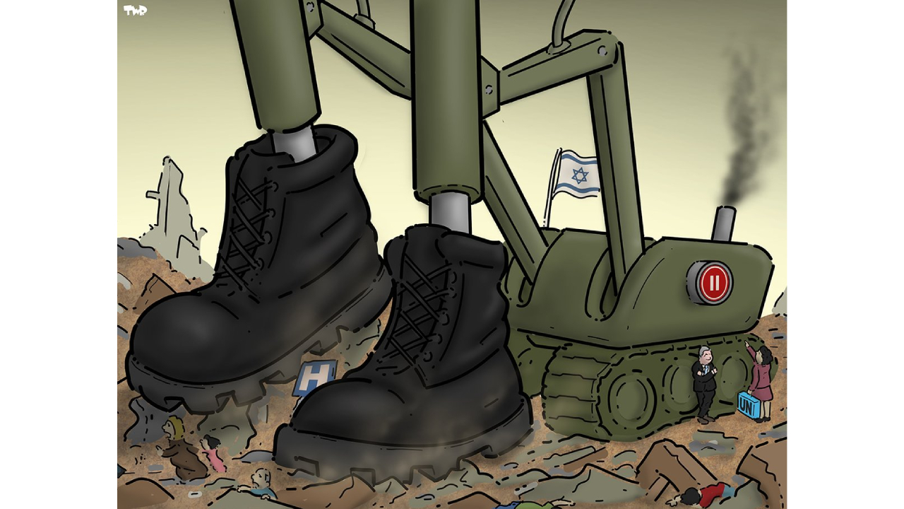BM`nin Gazze`de saldırılara insani ara verilmesi çağrısını Karikatürist Tjeerd Royaards böyle yorumladı. Royaards`a göre bu çağrıyı hayata geçirmesi BM`nin boyunu aşan bir mesele, BM`nin hiç bir gücü yok ve İsrail postalları hastaneleri bile ezip, yok etmiş durumda.
