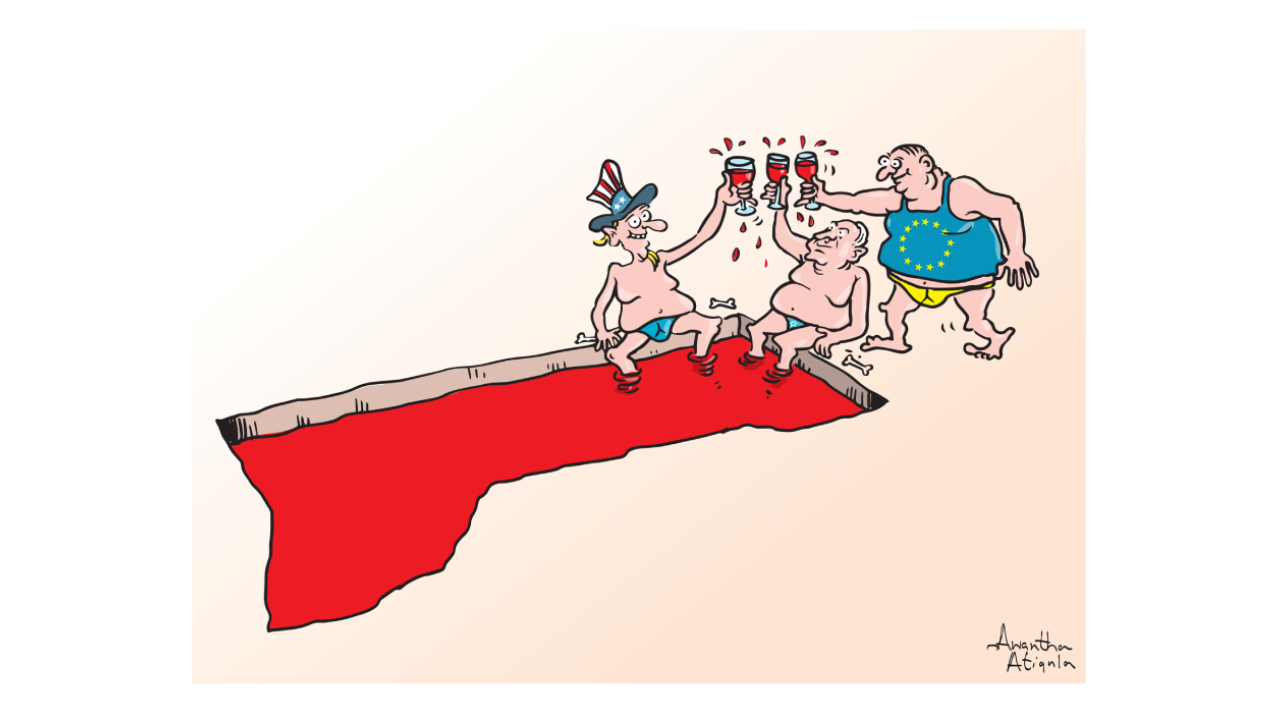 İsrail, Birleşmiş Milletler ve ABD, kan havuzuna dönen Gazze Şeridi`nin başında... Karikatürist: Awantha Artigala