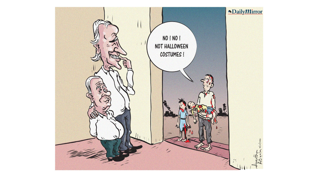 Gazze`de kan gövdeyi götürürken Cadılar Bayramı paylaşımıyla gündeme gelen Biden ve yanında Netanyahu. Kapıda kanlar içindeki Gazzeliler "Hayır! Cadılar Bayramı kostümleri değil!" diyor. Karikatürist: Awantha Artigala