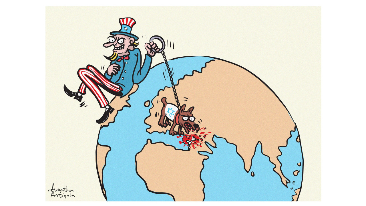 Karikatürist Awantha Artigala`ya göre olanların asıl sorumlusu ABD. Artigala İsrail`i, tasmasını Amerika`nın tuttuğu saldırgan bir köpek olarak çizmiş.