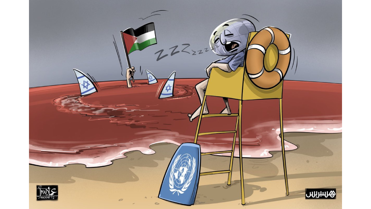 İsrail`in saldırılarına gözünü kapayan Birleşmiş Milletler`i yorumladı Karikatürist Sanouni Imad. Cankurtaran rolünde olması gereken Birleşmiş Milletler`i hiçbir şey yapmadığı için eleştirdi. Köpekbalıklarının arasında can çekişen Filistin`i öylece bir başına bıraktığı için...