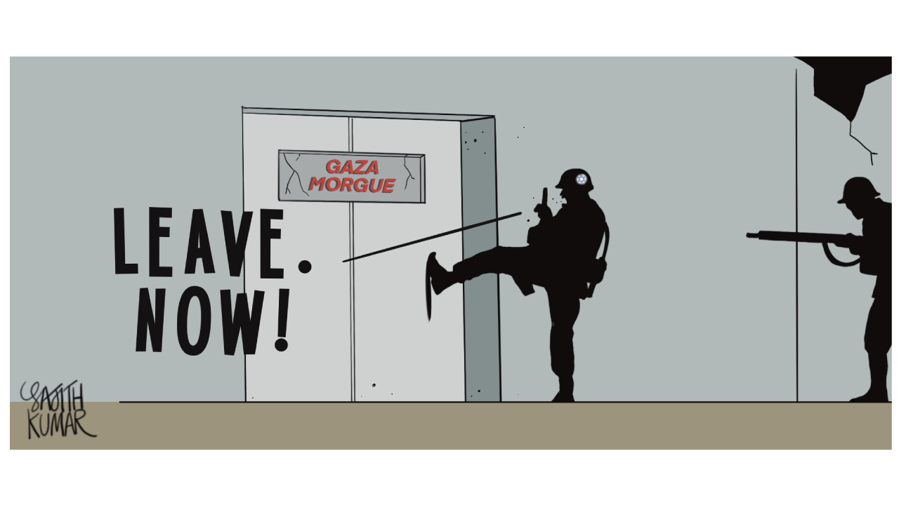 İsrail ordusu, Gazze`de yaşayan her canlıyı yok etmek üzerine kendini programlı. Diriye saygısı olmadığı gibi ölüye de saygısı olmayan İsrail askerlerini Sajith Kumar çok güzel anlatmış. "Gazze Morgu"nun önünde kapıyı tekmeleyerek burayı "Hemen terk edin" diye bağıran İsrail askeri.