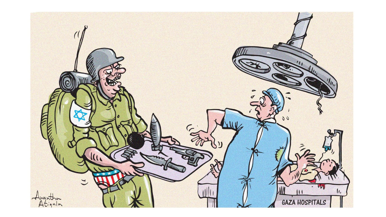 İsrail askerleri kanun, kural tanımıyor, hastaneleri yok ediyor. Artık Gazze`nin kuzeyinde açık hastane kalmadı. Çocuklar, bebekler, masum siviller ölüyor... Karikatürist: Awantha Artigala