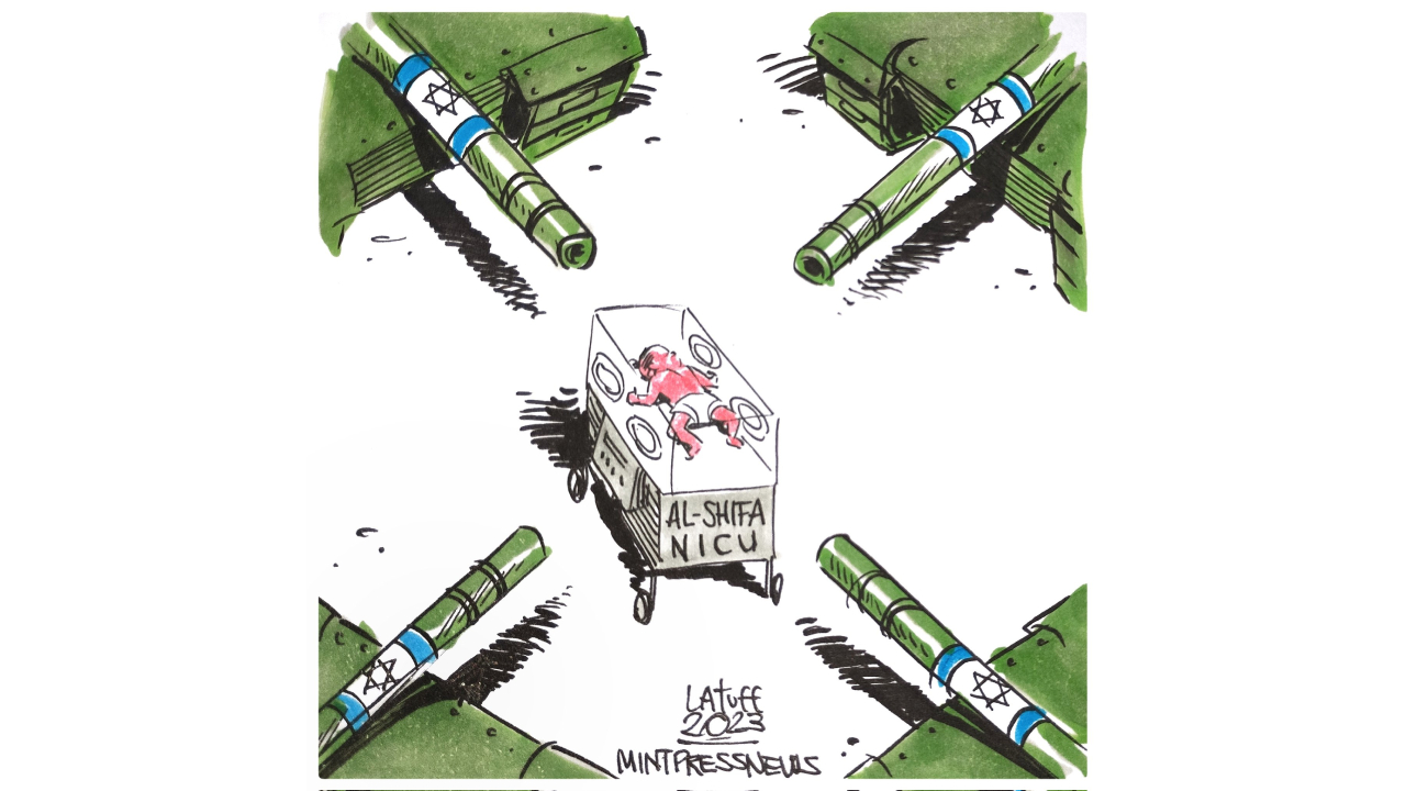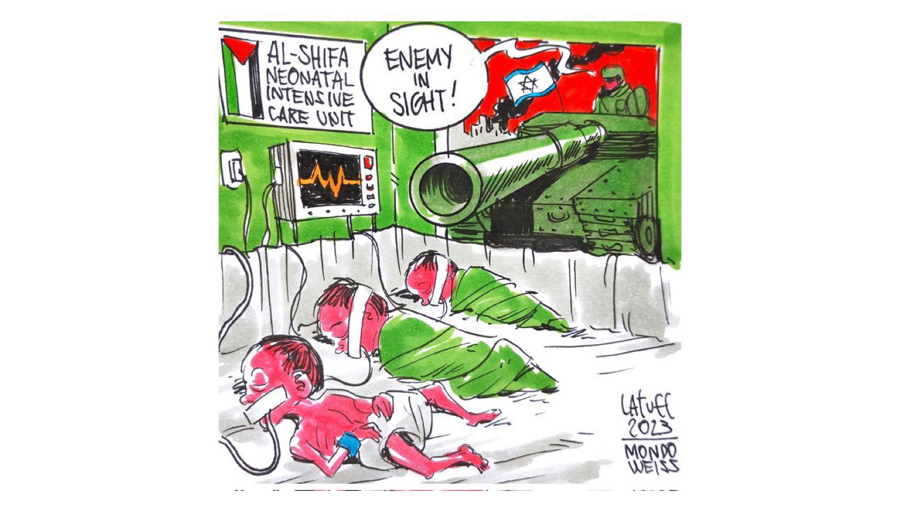 Mint Press News için Karikatürist Carlos Latuff tarafından çizilen başka bir karikatürde de Şifa Hastanesi`ndeki yenidoğan bakım ünitesine saldırı konu alındı. Namlunun ucunda yine bebekler vardı.