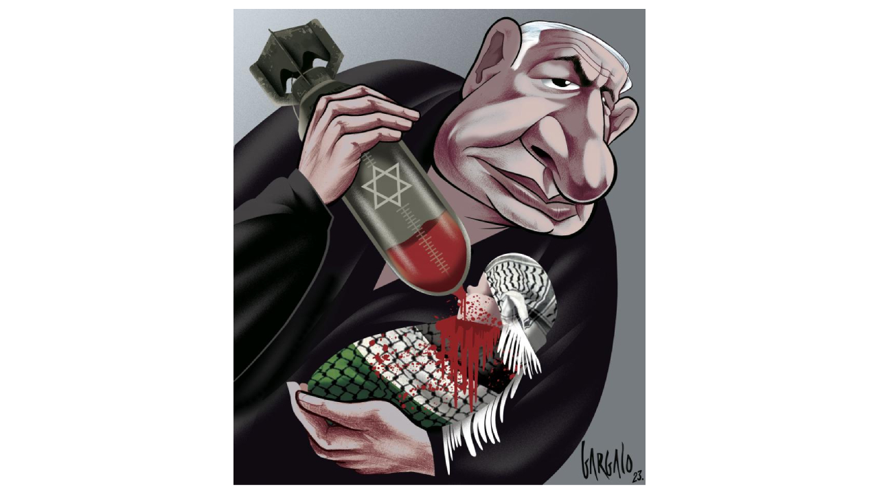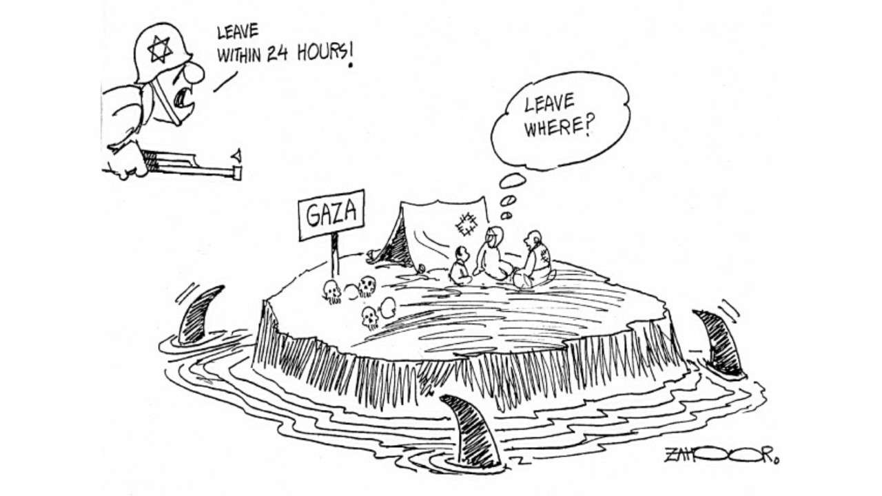75 yıldır oradan oraya savruldu Filistin halkı, gittiği her yerde etrafını köpek balıkları sardı, köşeye sıkıştırıldı. "24 saat içinde gidin" buradan uyarılarını yapanlar da değişmedi yıllar boyunca. Artık gidecekleri yer kalmadı. Göç yolunda da bombalandılar, kaçtıkları yerde de... Karikatürist Zahoor